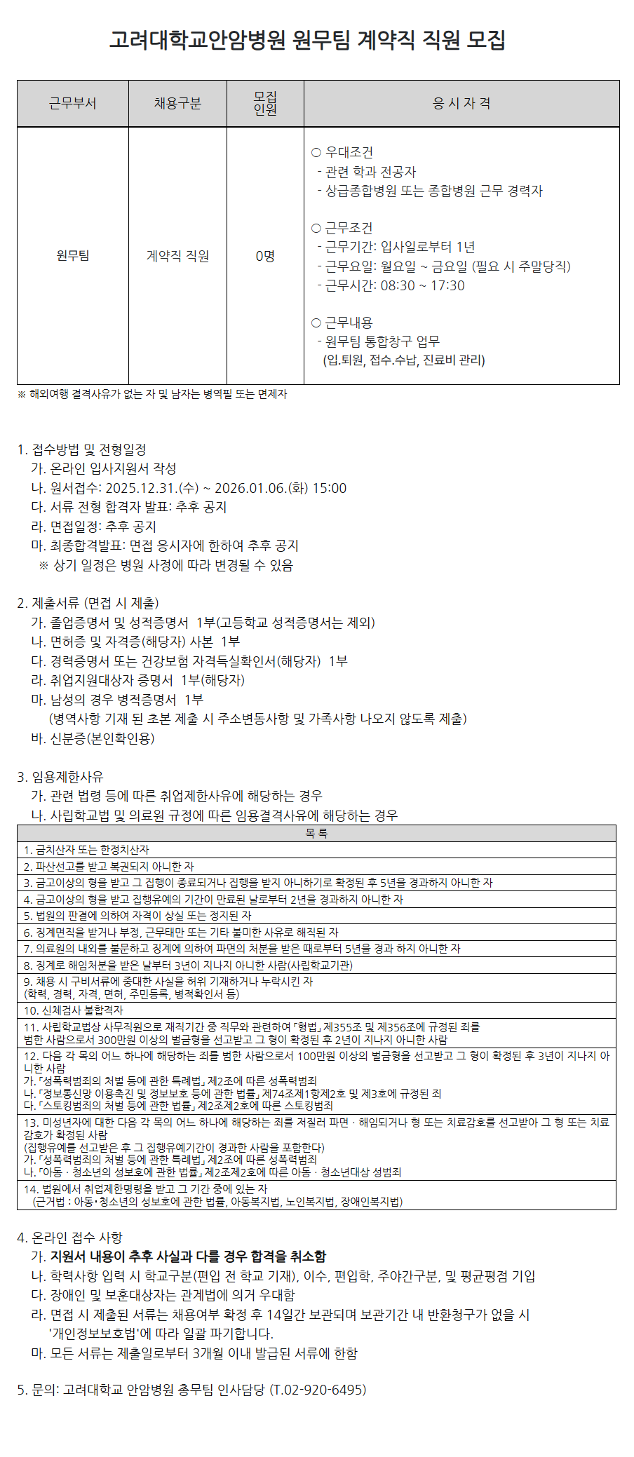 [¾È¾Ïº´¿ø 25-247]¿ø¹«ÆÀ °è¾àÁ÷ Á÷¿ø ¸ðÁý °í·Á´ëÇб³¾È¾Ïº´¿ø ¿ø¹«ÆÀ °è¾àÁ÷ Á÷¿ø ¸ðÁý ±Ù¹«ºÎ¼­ ä¿ë±¸ºÐ ¸ðÁý Àοø ÀÀ ½Ã ÀÚ °Ý ¿ø¹«ÆÀ °è¾àÁ÷ Á÷¿ø 0¸í ¡Û ¿ì´ëÁ¶°Ç - °ü·Ã Çаú Àü°øÀÚ - »ó±ÞÁ¾ÇÕº´¿ø ¶Ç´Â Á¾ÇÕº´¿ø ±Ù¹« °æ·ÂÀÚ ¡Û ±Ù¹«Á¶°Ç - ±Ù¹«±â°£: ÀÔ»çÀϷκÎÅÍ 1³â - ±Ù¹«¿äÀÏ: ¿ù¿äÀÏ ~ ±Ý¿äÀÏ (ÇÊ¿ä ½Ã ÁÖ¸»´çÁ÷) - ±Ù¹«½Ã°£: 08:30 ~ 17:30 ¡Û ±Ù¹«³»¿ë - ¿ø¹«ÆÀ ÅëÇÕⱸ ¾÷¹« (ÀÔ.Åð¿ø, Á¢¼ö.¼ö³³, Áø·áºñ °ü¸®) ¡Ø ÇØ¿Ü¿©Çà °á°Ý»çÀ¯°¡ ¾ø´Â ÀÚ ¹× ³²ÀÚ´Â º´¿ªÇÊ ¶Ç´Â ¸éÁ¦ÀÚ 1. Á¢¼ö¹æ¹ý ¹× ÀüÇüÀÏÁ¤ °¡. ¿Â¶óÀÎ ÀÔ»çÁö¿ø¼­ ÀÛ¼º ³ª. ¿ø¼­Á¢¼ö: 2025.12.31.(¼ö) ~ 2026.01.06.(È­) 15:00 ´Ù. ¼­·ù ÀüÇü ÇÕ°ÝÀÚ ¹ßÇ¥: ÃßÈÄ °øÁö ¶ó. ¸éÁ¢ÀÏÁ¤: ÃßÈÄ °øÁö ¸¶. ÃÖÁ¾ÇհݹßÇ¥: ¸éÁ¢ ÀÀ½ÃÀÚ¿¡ ÇÑÇÏ¿© ÃßÈÄ °øÁö ¡Ø »ó±â ÀÏÁ¤Àº º´¿ø »çÁ¤¿¡ µû¶ó º¯°æµÉ ¼ö ÀÖÀ½ 2. Á¦Ãâ¼­·ù (¸éÁ¢ ½Ã Á¦Ãâ) °¡. Á¹¾÷Áõ¸í¼­ ¹× ¼ºÀûÁõ¸í¼­ 1ºÎ(°íµîÇб³ ¼ºÀûÁõ¸í¼­´Â Á¦¿Ü) ³ª. ¸éÇãÁõ ¹× ÀÚ°ÝÁõ(ÇØ´çÀÚ) »çº» 1ºÎ ´Ù. °æ·ÂÁõ¸í¼­ ¶Ç´Â °Ç°­º¸Çè Àڰݵæ½ÇÈ®Àμ­(ÇØ´çÀÚ) 1ºÎ ¶ó. Ãë¾÷Áö¿ø´ë»óÀÚ Áõ¸í¼­ 1ºÎ(ÇØ´çÀÚ) ¸¶. ³²¼ºÀÇ °æ¿ì º´ÀûÁõ¸í¼­ 1ºÎ (º´¿ª»çÇ× ±âÀç µÈ Ãʺ» Á¦Ã⠽à ÁÖ¼Òº¯µ¿»çÇ× ¹× °¡Á·»çÇ× ³ª¿ÀÁö ¾Êµµ·Ï Á¦Ãâ) ¹Ù. ½ÅºÐÁõ(º»ÀÎÈ®Àοë) 3. ÀÓ¿ëÁ¦ÇÑ»çÀ¯ °¡. °ü·Ã ¹ý·É µî¿¡ µû¸¥ Ãë¾÷Á¦ÇÑ»çÀ¯¿¡ ÇØ´çÇÏ´Â °æ¿ì ³ª. »ç¸³Çб³¹ý ¹× ÀÇ·á¿ø ±ÔÁ¤¿¡ µû¸¥ ÀÓ¿ë°á°Ý»çÀ¯¿¡ ÇØ´çÇÏ´Â °æ¿ì ¸ñ ·Ï 1. ±ÝÄ¡»êÀÚ ¶Ç´Â ÇÑÁ¤Ä¡»êÀÚ 2. ÆÄ»ê¼±°í¸¦ ¹Þ°í º¹±ÇµÇÁö ¾Æ´ÏÇÑ ÀÚ 3. ±Ý°íÀÌ»óÀÇ ÇüÀ» ¹Þ°í ±× ÁýÇàÀÌ Á¾·áµÇ°Å³ª ÁýÇàÀ» ¹ÞÁö ¾Æ´ÏÇϱâ·Î È®Á¤µÈ ÈÄ 5³âÀ» °æ°úÇÏÁö ¾Æ´ÏÇÑ ÀÚ 4. ±Ý°íÀÌ»óÀÇ ÇüÀ» ¹Þ°í ÁýÇàÀ¯¿¹ÀÇ ±â°£ÀÌ ¸¸·áµÈ ³¯·ÎºÎÅÍ 2³âÀ» °æ°úÇÏÁö ¾Æ´ÏÇÑ ÀÚ 5. ¹ý¿øÀÇ ÆÇ°á¿¡ ÀÇÇÏ¿© ÀÚ°ÝÀÌ »ó½Ç ¶Ç´Â Á¤ÁöµÈ ÀÚ 6. ¡°è¸éÁ÷À» ¹Þ°Å³ª ºÎÁ¤, ±Ù¹«Å¸¸ ¶Ç´Â ±âŸ ºÒ¹ÌÇÑ »çÀ¯·Î ÇØÁ÷µÈ ÀÚ 7. ÀÇ·á¿øÀÇ ³»¿Ü¸¦ ºÒ¹®Çϰí ¡°è¿¡ ÀÇÇÏ¿© ÆÄ¸éÀÇ Ã³ºÐÀ» ¹ÞÀº ¶§·ÎºÎÅÍ 5³âÀ» °æ°ú ÇÏÁö ¾Æ´ÏÇÑ ÀÚ 8. ¡°è·Î ÇØÀÓóºÐÀ» ¹ÞÀº ³¯ºÎÅÍ 3³âÀÌ Áö³ªÁö ¾Æ´ÏÇÑ »ç¶÷(»ç¸³Çб³±â°ü) 9. ä¿ë ½Ã ±¸ºñ¼­·ù¿¡ Áß´ëÇÑ »ç½ÇÀ» ÇãÀ§ ±âÀçÇϰųª ´©¶ô½ÃŲ ÀÚ (ÇзÂ, °æ·Â, ÀÚ°Ý, ¸éÇã, Áֹεî·Ï, º´ÀûÈ®Àμ­ µî) 10. ½Åü°Ë»ç ºÒÇÕ°ÝÀÚ 11. »ç¸³Çб³¹ý»ó »ç¹«Á÷¿øÀ¸·Î ÀçÁ÷±â°£ Áß Á÷¹«¿Í °ü·ÃÇÏ¿© ¡¸Çü¹ý¡¹ Á¦355Á¶ ¹× Á¦356Á¶¿¡ ±ÔÁ¤µÈ Á˸¦ ¹üÇÑ »ç¶÷À¸·Î¼­ 300¸¸¿ø ÀÌ»óÀÇ ¹ú±ÝÇüÀ» ¼±°í¹Þ°í ±× ÇüÀÌ È®Á¤µÈ ÈÄ 2³âÀÌ Áö³ªÁö ¾Æ´ÏÇÑ »ç¶÷ 12. ´ÙÀ½ °¢ ¸ñÀÇ ¾î´À Çϳª¿¡ ÇØ´çÇÏ´Â Á˸¦ ¹üÇÑ »ç¶÷À¸·Î¼­ 100¸¸¿ø ÀÌ»óÀÇ ¹ú±ÝÇüÀ» ¼±°í¹Þ°í ±× ÇüÀÌ È®Á¤µÈ ÈÄ 3³âÀÌ Áö³ªÁö ¾Æ´ÏÇÑ »ç¶÷ °¡. ¡¸¼ºÆø·Â¹üÁËÀÇ Ã³¹ú µî¿¡ °üÇÑ Æ¯·Ê¹ý¡¹ Á¦2Á¶¿¡ µû¸¥ ¼ºÆø·Â¹üÁË ³ª. ¡¸Á¤º¸Åë½Å¸Á ÀÌ¿ëÃËÁø ¹× Á¤º¸º¸È£ µî¿¡ °üÇÑ ¹ý·ü¡¹ Á¦74Á¶Á¦1Ç×Á¦2È£ ¹× Á¦3È£¿¡ ±ÔÁ¤µÈ ÁË ´Ù. ¡¸½ºÅäÅ·¹üÁËÀÇ Ã³¹ú µî¿¡ °üÇÑ ¹ý·ü¡¹ Á¦2Á¶Á¦2È£¿¡ µû¸¥ ½ºÅäÅ·¹üÁË 13. ¹Ì¼º³âÀÚ¿¡ ´ëÇÑ ´ÙÀ½ °¢ ¸ñÀÇ ¾î´À Çϳª¿¡ ÇØ´çÇÏ´Â Á˸¦ ÀúÁú·¯ ÆÄ¸é¤ýÇØÀӵǰųª Çü ¶Ç´Â Ä¡·á°¨È£¸¦ ¼±°í¹Þ¾Æ ±× Çü ¶Ç´Â Ä¡·á°¨È£°¡ È®Á¤µÈ »ç¶÷ (ÁýÇàÀ¯¿¹¸¦ ¼±°í¹ÞÀº ÈÄ ±× ÁýÇàÀ¯¿¹±â°£ÀÌ °æ°úÇÑ »ç¶÷À» Æ÷ÇÔÇÑ´Ù) °¡. ¡¸¼ºÆø·Â¹üÁËÀÇ Ã³¹ú µî¿¡ °üÇÑ Æ¯·Ê¹ý¡¹ Á¦2Á¶¿¡ µû¸¥ ¼ºÆø·Â¹üÁË ³ª. ¡¸¾Æµ¿¤ýû¼Ò³âÀÇ ¼ºº¸È£¿¡ °üÇÑ ¹ý·ü¡¹ Á¦2Á¶Á¦2È£¿¡ µû¸¥ ¾Æµ¿¤ýû¼Ò³â´ë»ó ¼º¹üÁË 14. ¹ý¿ø¿¡¼­ Ãë¾÷Á¦ÇѸí·ÉÀ» ¹Þ°í ±× ±â°£ Áß¿¡ ÀÖ´Â ÀÚ (±Ù°Å¹ý : ¾Æµ¿‧û¼Ò³âÀÇ ¼ºº¸È£¿¡ °üÇÑ ¹ý·ü, ¾Æµ¿º¹Áö¹ý, ³ëÀκ¹Áö¹ý, Àå¾ÖÀκ¹Áö¹ý) 4. ¿Â¶óÀÎ Á¢¼ö »çÇ× °¡. Áö¿ø¼­ ³»¿ëÀÌ ÃßÈÄ »ç½Ç°ú ´Ù¸¦ °æ¿ì ÇÕ°ÝÀ» Ãë¼ÒÇÔ ³ª. Çз»çÇ× ÀÔ·Â ½Ã Çб³±¸ºÐ(ÆíÀÔ Àü Çб³ ±âÀç), À̼ö, ÆíÀÔÇÐ, Á־߰£±¸ºÐ, ¹× Æò±ÕÆòÁ¡ ±âÀÔ ´Ù. Àå¾ÖÀÎ ¹× º¸ÈÆ´ë»óÀÚ´Â °ü°è¹ý¿¡ ÀǰŠ¿ì´ëÇÔ ¶ó. ¸éÁ¢ ½Ã Á¦ÃâµÈ ¼­·ù´Â ä¿ë¿©ºÎ È®Á¤ ÈÄ 14Àϰ£ º¸°üµÇ¸ç º¸°ü±â°£ ³» ¹Ýȯû±¸°¡ ¾øÀ» ½Ã '°³ÀÎÁ¤º¸º¸È£¹ý'¿¡ µû¶ó Àϰý ÆÄ±âÇÕ´Ï´Ù. ¸¶. ¸ðµç ¼­·ù´Â Á¦ÃâÀϷκÎÅÍ 3°³¿ù À̳» ¹ß±ÞµÈ ¼­·ù¿¡ ÇÑÇÔ 5. ¹®ÀÇ: °í·Á´ëÇб³ ¾È¾Ïº´¿ø Ãѹ«ÆÀ Àλç´ã´ç (T.***-****-****)