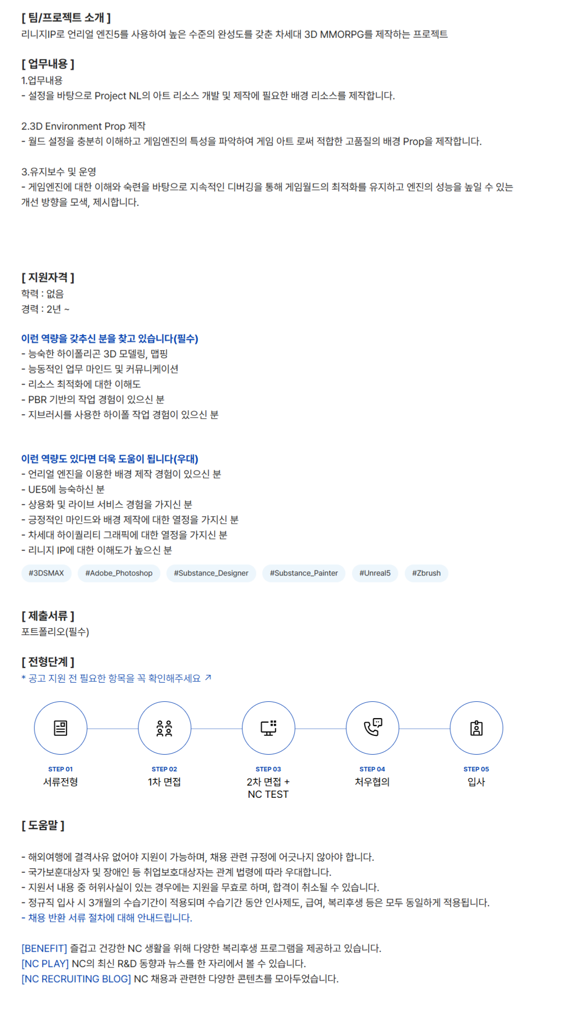 [ ÆÀ/ÇÁ·ÎÁ§Æ® ¼Ò°³ ] ¸®´ÏÁöIP·Î ¾ð¸®¾ó ¿£Áø5¸¦ »ç¿ëÇÏ¿© ³ôÀº ¼öÁØÀÇ ¿Ï¼ºµµ¸¦ °®Ãá Â÷¼¼´ë 3D MMORPG¸¦ Á¦ÀÛÇÏ´Â ÇÁ·ÎÁ§Æ® [ ¾÷¹«³»¿ë ] 1.¾÷¹«³»¿ë - ¼³Á¤À» ¹ÙÅÁÀ¸·Î Project NLÀÇ ¾ÆÆ® ¸®¼Ò½º °³¹ß ¹× Á¦ÀÛ¿¡ ÇÊ¿äÇÑ ¹è°æ ¸®¼Ò½º¸¦ Á¦ÀÛÇÕ´Ï´Ù. 2.3D Environment Prop Á¦ÀÛ - ¿ùµå ¼³Á¤À» ÃæºÐÈ÷ ÀÌÇØÇÏ°í °ÔÀÓ¿£ÁøÀÇ Æ¯¼ºÀ» ÆÄ¾ÇÇÏ¿© °ÔÀÓ ¾ÆÆ® ·Î½á ÀûÇÕÇÑ °íǰÁúÀÇ ¹è°æ PropÀ» Á¦ÀÛÇÕ´Ï´Ù. 3.À¯Áöº¸¼ö ¹× ¿î¿µ - °ÔÀÓ¿£Áø¿¡ ´ëÇÑ ÀÌÇØ¿Í ¼÷·ÃÀ» ¹ÙÅÁÀ¸·Î Áö¼ÓÀûÀÎ µð¹ö±ëÀ» ÅëÇØ °ÔÀÓ¿ùµåÀÇ ÃÖÀûÈ­¸¦ À¯ÁöÇÏ°í ¿£ÁøÀÇ ¼º´ÉÀ» ³ôÀÏ ¼ö ÀÖ´Â °³¼± ¹æÇâÀ» ¸ð»ö, Á¦½ÃÇÕ´Ï´Ù. [ Áö¿øÀÚ°Ý ] Çз : ¾øÀ½ °æ·Â : 2³â ~ ÀÌ·± ¿ª·®À» °®Ã߽ŠºÐÀ» ã°í ÀÖ½À´Ï´Ù(Çʼö) - ´É¼÷ÇÑ ÇÏÀÌÆú¸®°ï 3D ¸ðµ¨¸µ, ¸ÊÇÎ - ´Éµ¿ÀûÀÎ ¾÷¹« ¸¶ÀÎµå ¹× Ä¿¹Â´ÏÄÉÀÌ¼Ç - ¸®¼Ò½º ÃÖÀûÈ­¿¡ ´ëÇÑ ÀÌÇØµµ - PBR ±â¹ÝÀÇ ÀÛ¾÷ °æÇèÀÌ ÀÖÀ¸½Å ºÐ - Áöºê·¯½Ã¸¦ »ç¿ëÇÑ ÇÏÀÌÆú ÀÛ¾÷ °æÇèÀÌ ÀÖÀ¸½Å ºÐ