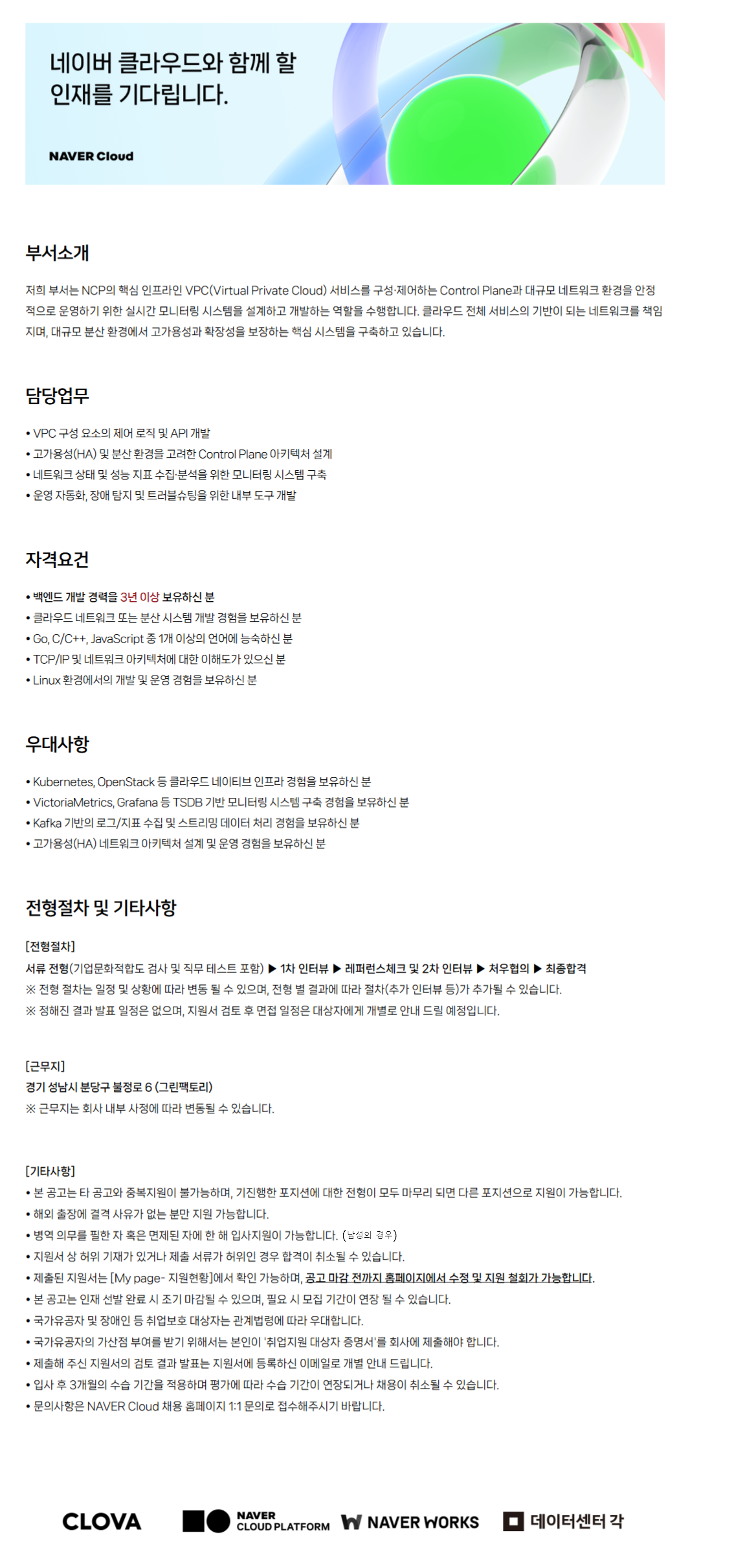 ºÎ¼­¼Ò°³ ÀúÈñ ºÎ¼­´Â NCPÀÇ ÇÙ½É ÀÎÇÁ¶óÀÎ VPC(Virtual Private Cloud) ¼­ºñ½º¸¦ ±¸¼º¡¤Á¦¾îÇÏ´Â Control Plane°ú ´ë±Ô¸ð ³×Æ®¿öÅ© ȯ°æÀ» ¾ÈÁ¤ÀûÀ¸·Î ¿î¿µÇϱâ À§ÇÑ ½Ç½Ã°£ ¸ð´ÏÅ͸µ ½Ã½ºÅÛÀ» ¼³°èÇÏ°í °³¹ßÇÏ´Â ¿ªÇÒÀ» ¼öÇàÇÕ´Ï´Ù. Ŭ¶ó¿ìµå Àüü ¼­ºñ½ºÀÇ ±â¹ÝÀÌ µÇ´Â ³×Æ®¿öÅ©¸¦ Ã¥ÀÓÁö¸ç, ´ë±Ô¸ð ºÐ»ê ȯ°æ¿¡¼­ °í°¡¿ë¼º°ú È®À强À» º¸ÀåÇÏ´Â ÇÙ½É ½Ã½ºÅÛÀ» ±¸ÃàÇϰí ÀÖ½À´Ï´Ù. ´ã´ç¾÷¹« • VPC ±¸¼º ¿ä¼ÒÀÇ Á¦¾î ·ÎÁ÷ ¹× API °³¹ß • °í°¡¿ë¼º(HA) ¹× ºÐ»ê ȯ°æÀ» °í·ÁÇÑ Control Plane ¾ÆÅ°ÅØÃ³ ¼³°è • ³×Æ®¿öÅ© »óÅ ¹× ¼º´É ÁöÇ¥ ¼öÁý¡¤ºÐ¼®À» À§ÇÑ ¸ð´ÏÅ͸µ ½Ã½ºÅÛ ±¸Ãà • ¿î¿µ ÀÚµ¿È­, Àå¾Ö ŽÁö ¹× Æ®·¯ºí½´ÆÃÀ» À§ÇÑ ³»ºÎ µµ±¸ °³¹ß ÀÚ°Ý¿ä°Ç • ¹é¿£µå °³¹ß °æ·ÂÀ» 3³â ÀÌ»ó º¸À¯ÇϽŠºÐ • Ŭ¶ó¿ìµå ³×Æ®¿öÅ© ¶Ç´Â ºÐ»ê ½Ã½ºÅÛ °³¹ß °æÇèÀ» º¸À¯ÇϽŠºÐ • Go, C/C++, JavaScript Áß 1°³ ÀÌ»óÀÇ ¾ð¾î¿¡ ´É¼÷ÇϽŠºÐ • TCP/IP ¹× ³×Æ®¿öÅ© ¾ÆÅ°ÅØÃ³¿¡ ´ëÇÑ ÀÌÇØµµ°¡ ÀÖÀ¸½Å ºÐ • Linux ȯ°æ¿¡¼­ÀÇ °³¹ß ¹× ¿î¿µ °æÇèÀ» º¸À¯ÇϽŠºÐ