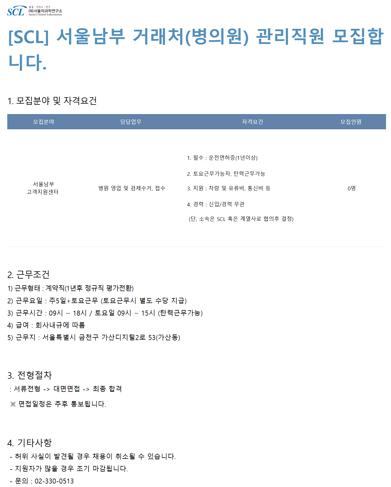 [SCL] ¼¿ï³²ºÎ °Å·¡Ã³(º´ÀÇ¿ø) °ü¸®Á÷¿ø ¸ðÁýÇÕ´Ï´Ù.