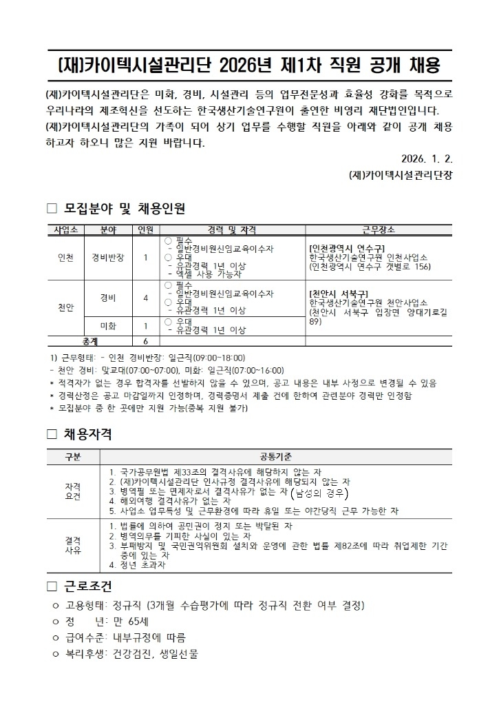 (Àç)Ä«ÀÌÅØ½Ã¼³°ü¸®´Ü 2026³â Á¦1Â÷ Á÷¿ø °ø°³Ã¤¿ë