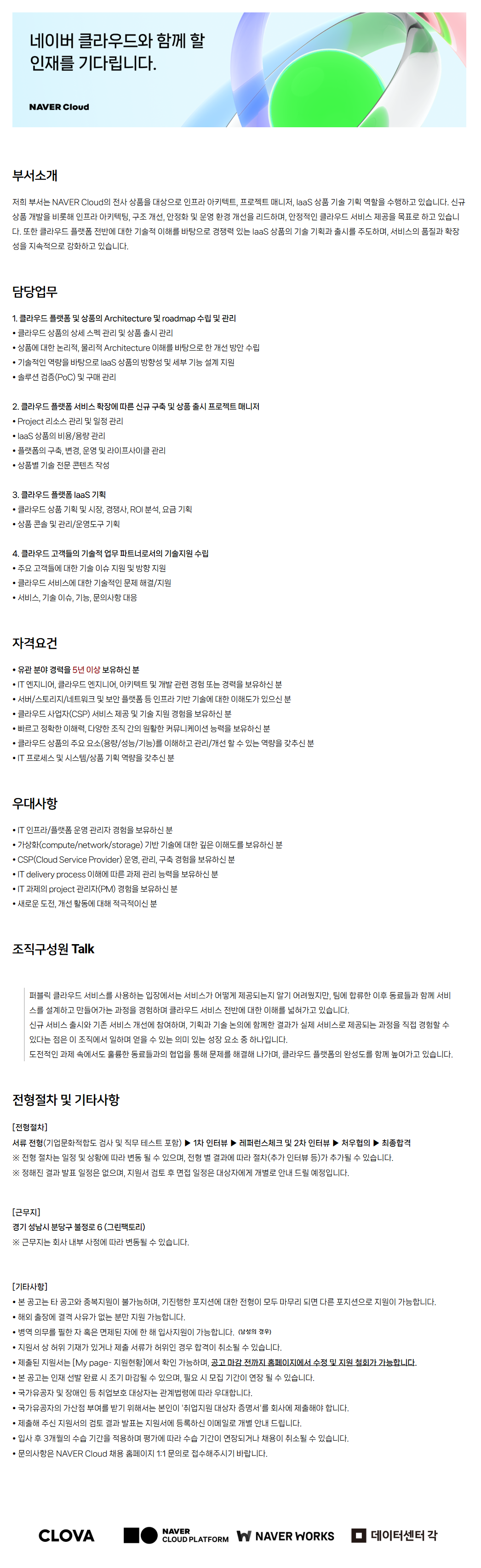ÀúÈñ ºÎ¼´Â NAVER CloudÀÇ Àü»ç »óǰÀ» ´ë»óÀ¸·Î ÀÎÇÁ¶ó ¾ÆÅ°ÅØÆ®, ÇÁ·ÎÁ§Æ® ¸Å´ÏÀú, IaaS »óǰ ±â¼ú ±âȹ ¿ªÇÒÀ» ¼öÇàÇϰí ÀÖ½À´Ï´Ù. ½Å±Ô »óǰ °³¹ßÀ» ºñ·ÔÇØ ÀÎÇÁ¶ó ¾ÆÅ°ÅØÆÃ, ±¸Á¶ °³¼±, ¾ÈÁ¤È ¹× ¿î¿µ ȯ°æ °³¼±À» ¸®µåÇϸç, ¾ÈÁ¤ÀûÀΠŬ¶ó¿ìµå ¼ºñ½º Á¦°øÀ» ¸ñÇ¥·Î Çϰí ÀÖ½À´Ï´Ù. ¶ÇÇÑ Å¬¶ó¿ìµå Ç÷§Æû Àü¹Ý¿¡ ´ëÇÑ ±â¼úÀû ÀÌÇØ¸¦ ¹ÙÅÁÀ¸·Î °æÀï·Â ÀÖ´Â IaaS »óǰÀÇ ±â¼ú ±âȹ°ú Ãâ½Ã¸¦ ÁÖµµÇϸç, ¼ºñ½ºÀÇ Ç°Áú°ú È®À强À» Áö¼ÓÀûÀ¸·Î °ÈÇϰí ÀÖ½À´Ï´Ù.