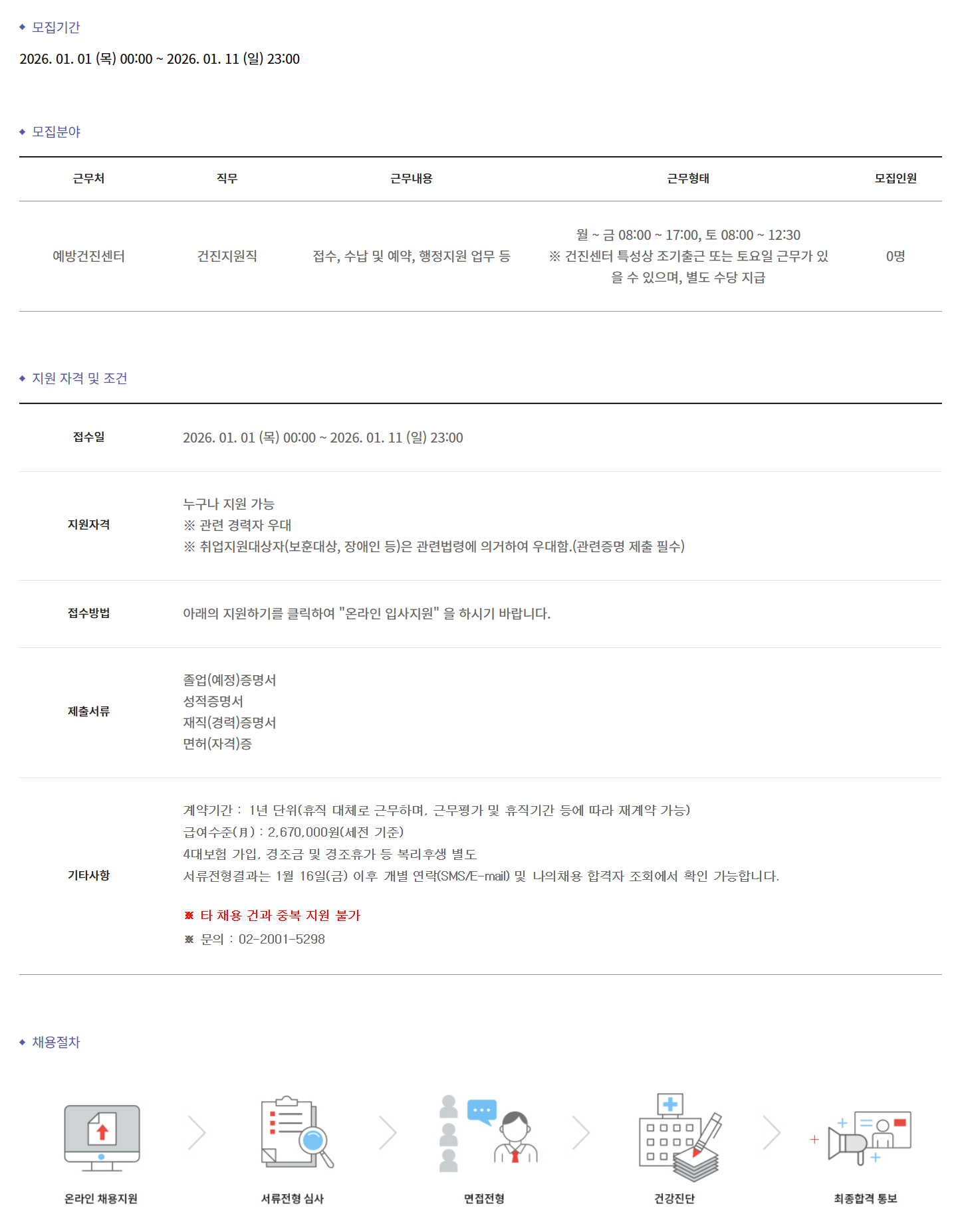 ±Ù¹«Ã³ Á÷¹« ±Ù¹«³»¿ë ±Ù¹«ÇüÅ ¸ðÁýÀοø ¿¹¹æ°ÇÁø¼¾ÅÍ °ÇÁøÁö¿øÁ÷ Á¢¼ö, ¼ö³³ ¹× ¿¹¾à, ÇàÁ¤Áö¿ø ¾÷¹« µî ¿ù ~ ±Ý 08:00 ~ 17:00, Åä 08:00 ~ 12:30 ¡Ø °ÇÁø¼¾ÅÍ Æ¯¼º»ó Á¶±âÃâ±Ù ¶Ç´Â Åä¿äÀÏ ±Ù¹«°¡ ÀÖÀ» ¼ö ÀÖÀ¸¸ç, º°µµ ¼ö´ç Áö±Þ 0¸í
