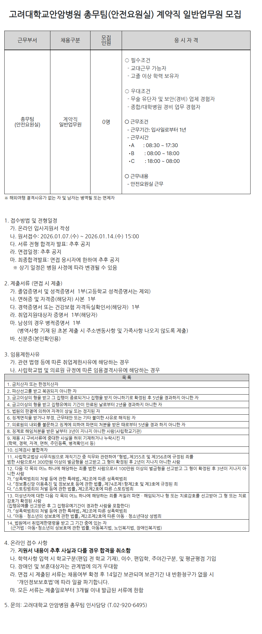 °í·Á´ëÇб³¾È¾Ïº´¿ø Ãѹ«ÆÀ(¾ÈÀü¿ä¿ø½Ç) °è¾àÁ÷ ÀϹݾ÷¹«¿ø ¸ðÁý