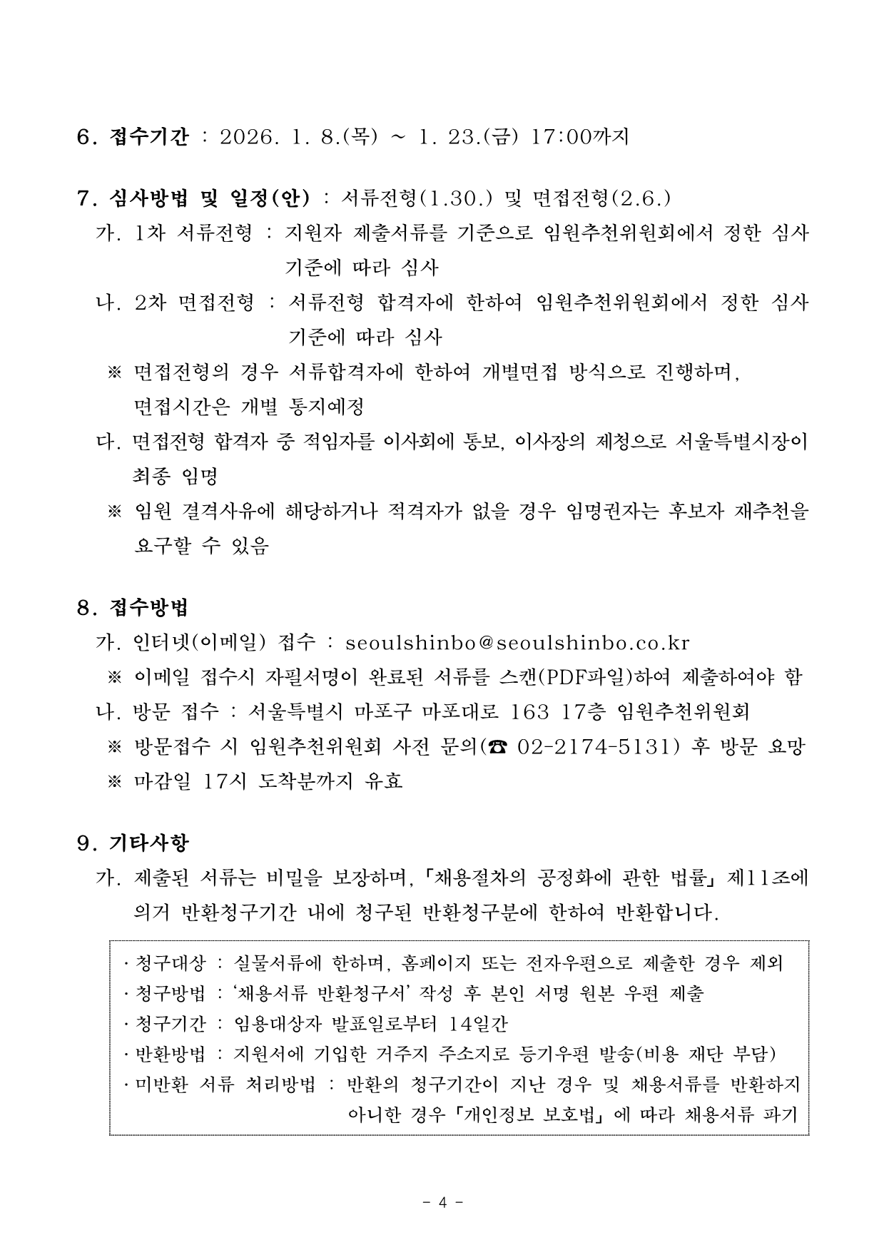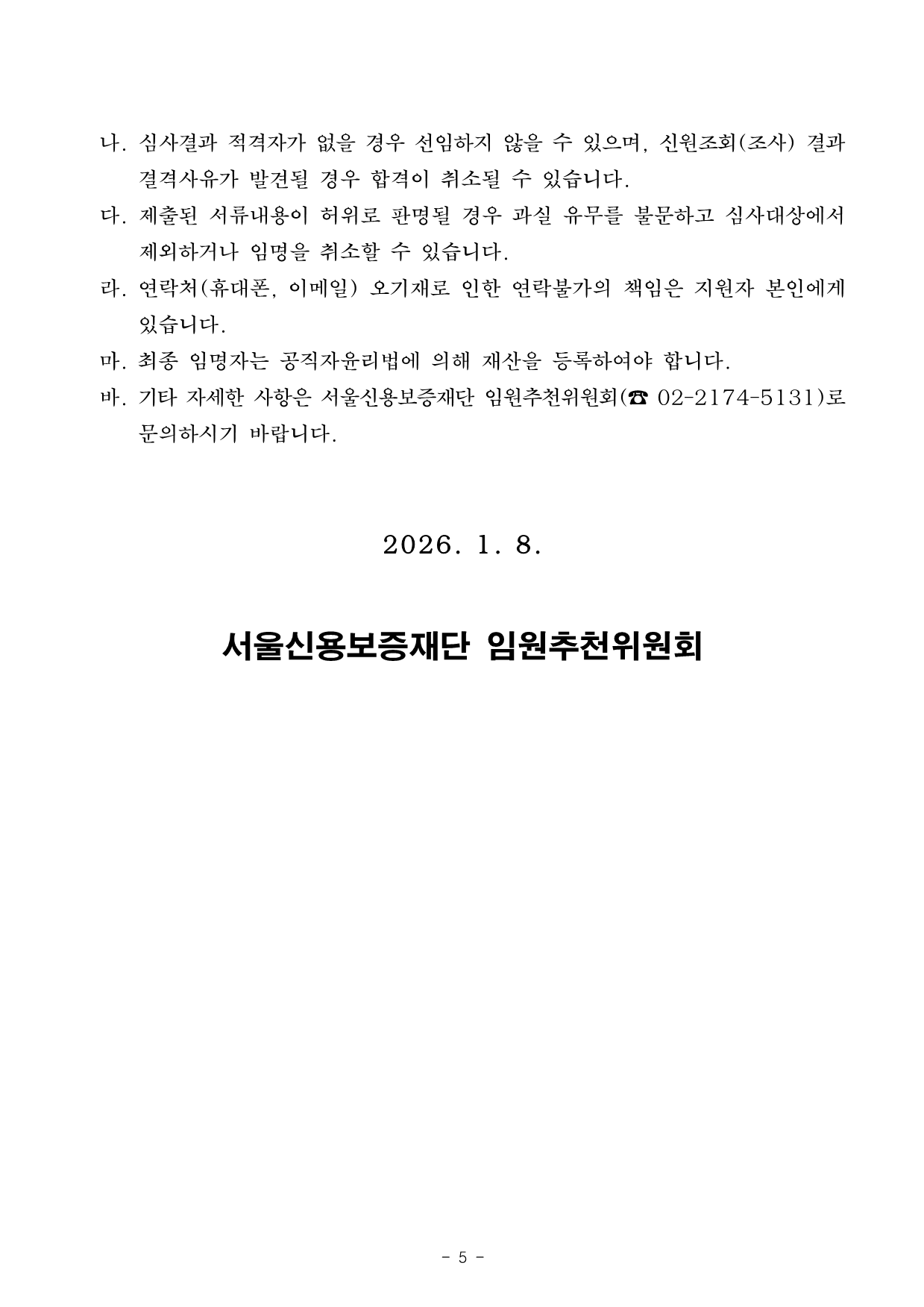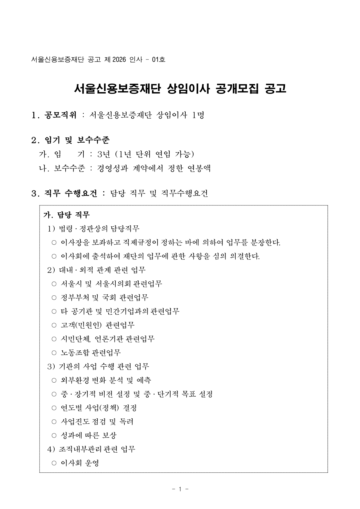 ¼¿ï½Å¿ëº¸ÁõÀç´Ü °ø°í Á¦ 2026 ÀÎ»ç – 01È£ ¼¿ï½Å¿ëº¸ÁõÀç´Ü »óÀÓÀÌ»ç °ø°³¸ðÁý °ø°í1. °ø¸ðÁ÷À§ : ¼¿ï½Å¿ëº¸ÁõÀç´Ü »óÀÓÀÌ»ç 1¸í 2. ÀÓ±â ¹× º¸¼ö¼öÁØ °¡. ÀÓ ±â : 3³â (1³â ´ÜÀ§ ¿¬ÀÓ °¡´É) ³ª. º¸¼ö¼öÁØ : °æ¿µ¼º°ú °è¾à¿¡¼ Á¤ÇÑ ¿¬ºÀ¾×