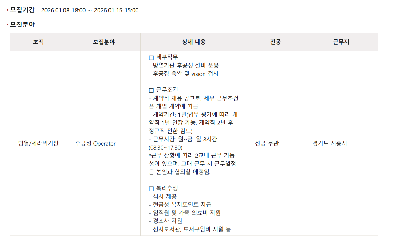 - °è¾à±â°£: 1³â(¾÷¹« Æò°¡¿¡ µû¶ó °è¾àÁ÷ 1³â ¿¬Àå °¡´É, °è¾àÁ÷ 2³â ÈÄ Á¤±ÔÁ÷ Àüȯ °ËÅä)