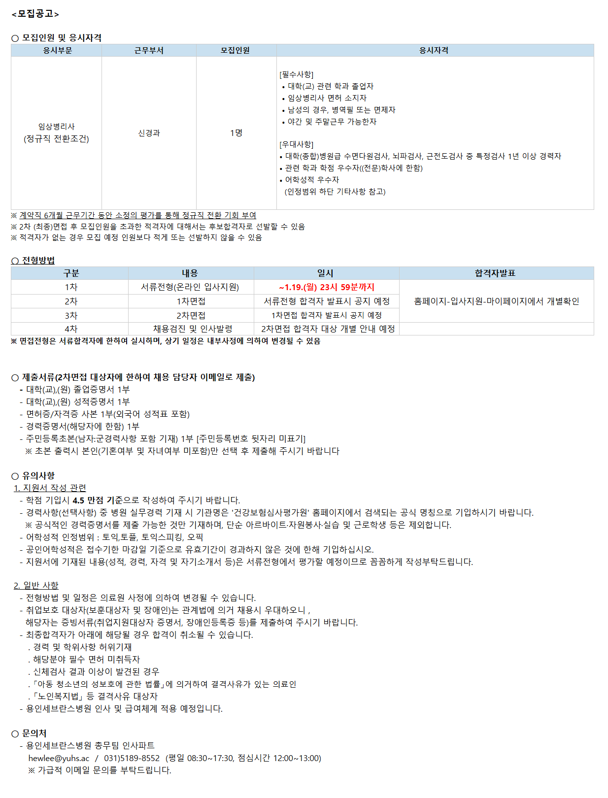 <¸ðÁý°ø°í> ¡Û ¸ðÁýÀοø ¹× ÀÀ½ÃÀÚ°Ý ÀÀ½ÃºÎ¹® ±Ù¹«ºÎ¼­ ¸ðÁýÀοø ÀÀ½ÃÀÚ°Ý ÀÓ»óº´¸®»ç (Á¤±ÔÁ÷ ÀüȯÁ¶°Ç) ½Å°æ°ú 1¸í [Çʼö»çÇ×] ⦁ ´ëÇÐ(±³) °ü·Ã Çаú Á¹¾÷ÀÚ ⦁ ÀÓ»óº´¸®»ç ¸éÇã ¼ÒÁöÀÚ ⦁ ³²¼ºÀÇ °æ¿ì, º´¿ªÇÊ ¶Ç´Â ¸éÁ¦ÀÚ ⦁ ¾ß°£ ¹× ÁÖ¸»±Ù¹« °¡´ÉÇÑÀÚ [¿ì´ë»çÇ×] ⦁ ´ëÇÐ(Á¾ÇÕ)º´¿ø±Þ ¼ö¸é´Ù¿ø°Ë»ç, ³úÆÄ°Ë»ç, ±ÙÀüµµ°Ë»ç Áß Æ¯Á¤°Ë»ç 1³â ÀÌ»ó °æ·ÂÀÚ ⦁ °ü·Ã Çаú ÇÐÁ¡ ¿ì¼öÀÚ((Àü¹®)Çл翡 ÇÑÇÔ) ⦁ ¾îÇмºÀû ¿ì¼öÀÚ (ÀÎÁ¤¹üÀ§ ÇÏ´Ü ±âŸ»çÇ× Âü°í) ¡Ø °è¾àÁ÷ 6°³¿ù ±Ù¹«±â°£ µ¿¾È ¼ÒÁ¤ÀÇ Æò°¡¸¦ ÅëÇØ Á¤±ÔÁ÷ Àüȯ ±âȸ ºÎ¿© ¡Ø 2Â÷ (ÃÖÁ¾)¸éÁ¢ ÈÄ ¸ðÁýÀοøÀ» ÃʰúÇÑ Àû°ÝÀÚ¿¡ ´ëÇØ¼­´Â Èĺ¸ÇÕ°ÝÀÚ·Î ¼±¹ßÇÒ ¼ö ÀÖÀ½ ¡Ø Àû°ÝÀÚ°¡ ¾ø´Â °æ¿ì ¸ðÁý ¿¹Á¤ Àοøº¸´Ù Àû°Ô ¶Ç´Â ¼±¹ßÇÏÁö ¾ÊÀ» ¼ö ÀÖÀ½ ¡Û ÀüÇü¹æ¹ý ±¸ºÐ ³»¿ë ÀϽà ÇÕ°ÝÀÚ¹ßÇ¥ 1Â÷ ¼­·ùÀüÇü(¿Â¶óÀÎ ÀÔ»çÁö¿ø) ~1.19.(¿ù) 23½Ã 59ºÐ±îÁö ȨÆäÀÌÁö-ÀÔ»çÁö¿ø-¸¶ÀÌÆäÀÌÁö¿¡¼­ °³º°È®ÀÎ 2Â÷ 1Â÷¸éÁ¢ ¼­·ùÀüÇü ÇÕ°ÝÀÚ ¹ßÇ¥½Ã °øÁö ¿¹Á¤ 3Â÷ 2Â÷¸éÁ¢ 1Â÷¸éÁ¢ ÇÕ°ÝÀÚ ¹ßÇ¥½Ã °øÁö ¿¹Á¤ 4Â÷ ä¿ë°ËÁø ¹× Àλç¹ß·É 2Â÷¸éÁ¢ ÇÕ°ÝÀÚ ´ë»ó °³º° ¾È³» ¿¹Á¤ ¡Ø ¸éÁ¢ÀüÇüÀº ¼­·ùÇÕ°ÝÀÚ¿¡ ÇÑÇÏ¿© ½Ç½ÃÇϸç, »ó±â ÀÏÁ¤Àº ³»ºÎ»çÁ¤¿¡ ÀÇÇÏ¿© º¯°æµÉ ¼ö ÀÖÀ½  ¡Û Á¦Ãâ¼­·ù(2Â÷¸éÁ¢ ´ë»óÀÚ¿¡ ÇÑÇÏ¿© ä¿ë ´ã´çÀÚ À̸ÞÀÏ·Î Á¦Ãâ) - ​´ëÇÐ(±³),(¿ø) Á¹¾÷Áõ¸í¼­ 1ºÎ - ´ëÇÐ(±³),(¿ø) ¼ºÀûÁõ¸í¼­ 1ºÎ - ¸éÇãÁõ/ÀÚ°ÝÁõ »çº» 1ºÎ(¿Ü±¹¾î ¼ºÀûÇ¥ Æ÷ÇÔ) - °æ·ÂÁõ¸í¼­(ÇØ´çÀÚ¿¡ ÇÑÇÔ) 1ºÎ - Áֹεî·ÏÃʺ»(³²ÀÚ:±º°æ·Â»çÇ× Æ÷ÇÔ ±âÀç) 1ºÎ [Áֹεî·Ï¹øÈ£ µÞÀÚ¸® ¹ÌÇ¥±â] ¡Ø Ãʺ» Ãâ·Â½Ã º»ÀÎ(±âÈ¥¿©ºÎ ¹× Àڳ࿩ºÎ ¹ÌÆ÷ÇÔ)¸¸ ¼±Åà ÈÄ Á¦ÃâÇØ Áֽñ⠹ٶø´Ï´Ù ¡Û À¯ÀÇ»çÇ× 1. Áö¿ø¼­ ÀÛ¼º °ü·Ã - ÇÐÁ¡ ±âÀԽà 4.5 ¸¸Á¡ ±âÁØÀ¸·Î ÀÛ¼ºÇÏ¿© Áֽñ⠹ٶø´Ï´Ù. - °æ·Â»çÇ×(¼±ÅûçÇ×) Áß º´¿ø ½Ç¹«°æ·Â ±âÀç ½Ã ±â°ü¸íÀº '°Ç°­º¸Çè½É»çÆò°¡¿ø' ȨÆäÀÌÁö¿¡¼­ °Ë»öµÇ´Â °ø½Ä ¸íĪÀ¸·Î ±âÀÔÇϽñ⠹ٶø´Ï´Ù. ¡Ø °ø½ÄÀûÀÎ °æ·ÂÁõ¸í¼­¸¦ Á¦Ãâ °¡´ÉÇÑ °Í¸¸ ±âÀçÇϸç, ´Ü¼ø ¾Æ¸£¹ÙÀÌÆ®¡¤ÀÚ¿øºÀ»ç¡¤½Ç½À ¹× ±Ù·ÎÇлý µîÀº Á¦¿ÜÇÕ´Ï´Ù. - ¾îÇмºÀû ÀÎÁ¤¹üÀ§ : ÅäÀÍ,ÅäÇÃ, ÅäÀͽºÇÇÅ·, ¿ÀÇÈ - °øÀξîÇмºÀûÀº Á¢¼ö±âÇÑ ¸¶°¨ÀÏ ±âÁØÀ¸·Î À¯È¿±â°£ÀÌ °æ°úÇÏÁö ¾ÊÀº °Í¿¡ ÇÑÇØ ±âÀÔÇϽʽÿÀ. - Áö¿ø¼­¿¡ ±âÀçµÈ ³»¿ë(¼ºÀû, °æ·Â, ÀÚ°Ý ¹× ÀÚ±â¼Ò°³¼­ µî)Àº ¼­·ùÀüÇü¿¡¼­ Æò°¡ÇÒ ¿¹Á¤À̹ǷΠ²Ä²ÄÇÏ°Ô ÀÛ¼ººÎʵ右´Ï´Ù. 2. ÀÏ¹Ý »çÇ× - ÀüÇü¹æ¹ý ¹× ÀÏÁ¤Àº ÀÇ·á¿ø »çÁ¤¿¡ ÀÇÇÏ¿© º¯°æµÉ ¼ö ÀÖ½À´Ï´Ù. - Ãë¾÷º¸È£ ´ë»óÀÚ(º¸ÈÆ´ë»óÀÚ ¹× Àå¾ÖÀÎ)´Â °ü°è¹ý¿¡ ÀǰŠä¿ë½Ã ¿ì´ëÇÏ¿À´Ï , ÇØ´çÀÚ´Â Áõºù¼­·ù(Ãë¾÷Áö¿ø´ë»óÀÚ Áõ¸í¼­, Àå¾ÖÀεî·ÏÁõ µî)¸¦ Á¦ÃâÇÏ¿© Áֽñ⠹ٶø´Ï´Ù. - ÃÖÁ¾ÇÕ°ÝÀÚ°¡ ¾Æ·¡¿¡ ÇØ´çµÉ °æ¿ì ÇÕ°ÝÀÌ Ãë¼ÒµÉ ¼ö ÀÖ½À´Ï´Ù. . °æ·Â ¹× ÇÐÀ§»çÇ× ÇãÀ§±âÀç . ÇØ´çºÐ¾ß Çʼö ¸éÇã ¹ÌÃëµæÀÚ . ½Åü°Ë»ç °á°ú ÀÌ»óÀÌ ¹ß°ßµÈ °æ¿ì . ¡¸¾Æµ¿ û¼Ò³âÀÇ ¼ºº¸È£¿¡ °üÇÑ ¹ý·ü¡¹¿¡ ÀǰÅÇÏ¿© °á°Ý»çÀ¯°¡ ÀÖ´Â ÀÇ·áÀÎ . ¡¸³ëÀκ¹Áö¹ý¡¹ µî °á°Ý»çÀ¯ ´ë»óÀÚ - ¿ëÀμ¼ºê¶õ½ºº´¿ø ÀÎ»ç ¹× ±Þ¿©Ã¼°è Àû¿ë ¿¹Á¤ÀÔ´Ï´Ù. ¡Û ¹®ÀÇó - ¿ëÀμ¼ºê¶õ½ºº´¿ø Ãѹ«ÆÀ ÀλçÆÄÆ® ******@*******.*** / ***-****-**** (ÆòÀÏ 08:30~17:30, Á¡½É½Ã°£ 12:00~13:00) ¡Ø °¡±ÞÀû À̸ÞÀÏ ¹®ÀǸ¦ ºÎʵ右´Ï´Ù.