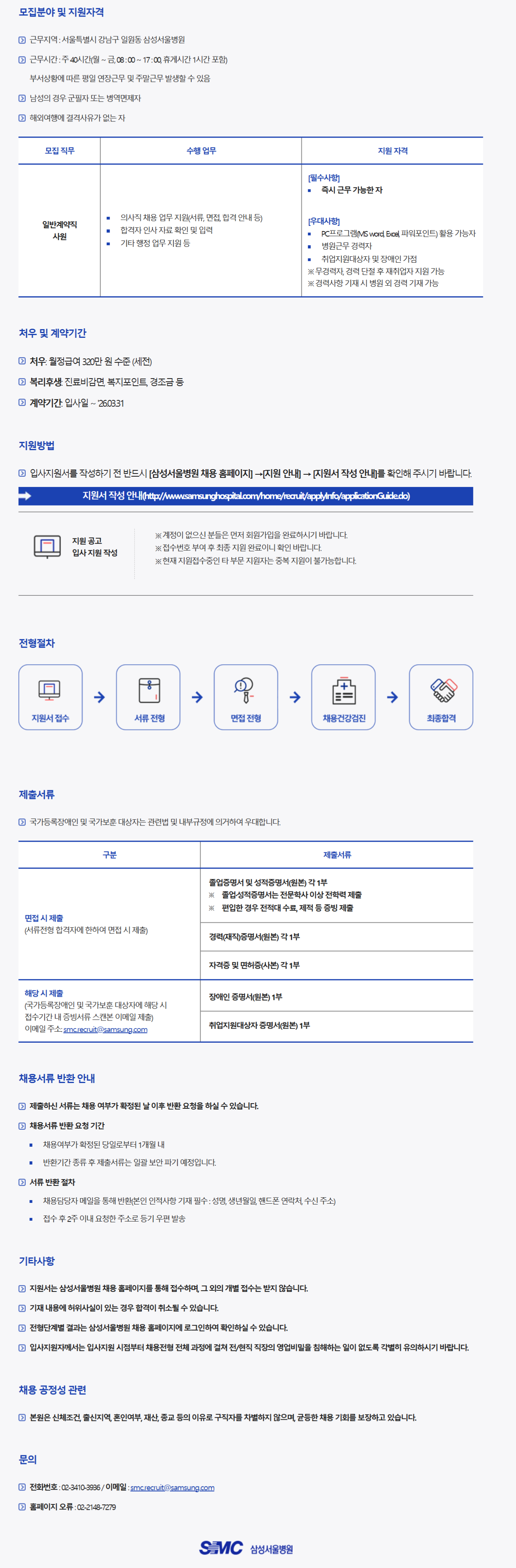 ¸ðÁý Á÷¹« ¼öÇà ¾÷¹« Áö¿ø ÀÚ°Ý ÀϹݰè¾àÁ÷ »ç¿ø ÀÇ»çÁ÷ ä¿ë ¾÷¹« Áö¿ø(¼­·ù, ¸éÁ¢, ÇÕ°Ý ¾È³» µî) ÇÕ°ÝÀÚ Àλç ÀÚ·á È®ÀÎ ¹× ÀÔ·Â ±âŸ ÇàÁ¤ ¾÷¹« Áö¿ø µî [Çʼö»çÇ×] Áï½Ã ±Ù¹« °¡´ÉÇÑ ÀÚ [¿ì´ë»çÇ×] PCÇÁ·Î±×·¥(MS word, Excel, ÆÄ¿öÆ÷ÀÎÆ®) Ȱ¿ë °¡´ÉÀÚ º´¿ø±Ù¹« °æ·ÂÀÚ Ãë¾÷Áö¿ø´ë»óÀÚ ¹× Àå¾ÖÀÎ °¡Á¡ ¡Ø ¹«°æ·ÂÀÚ, °æ·Â ´ÜÀý ÈÄ ÀçÃë¾÷ÀÚ Áö¿ø °¡´É ¡Ø °æ·Â»çÇ× ±âÀç ½Ã º´¿ø ¿Ü °æ·Â ±âÀç °¡´É