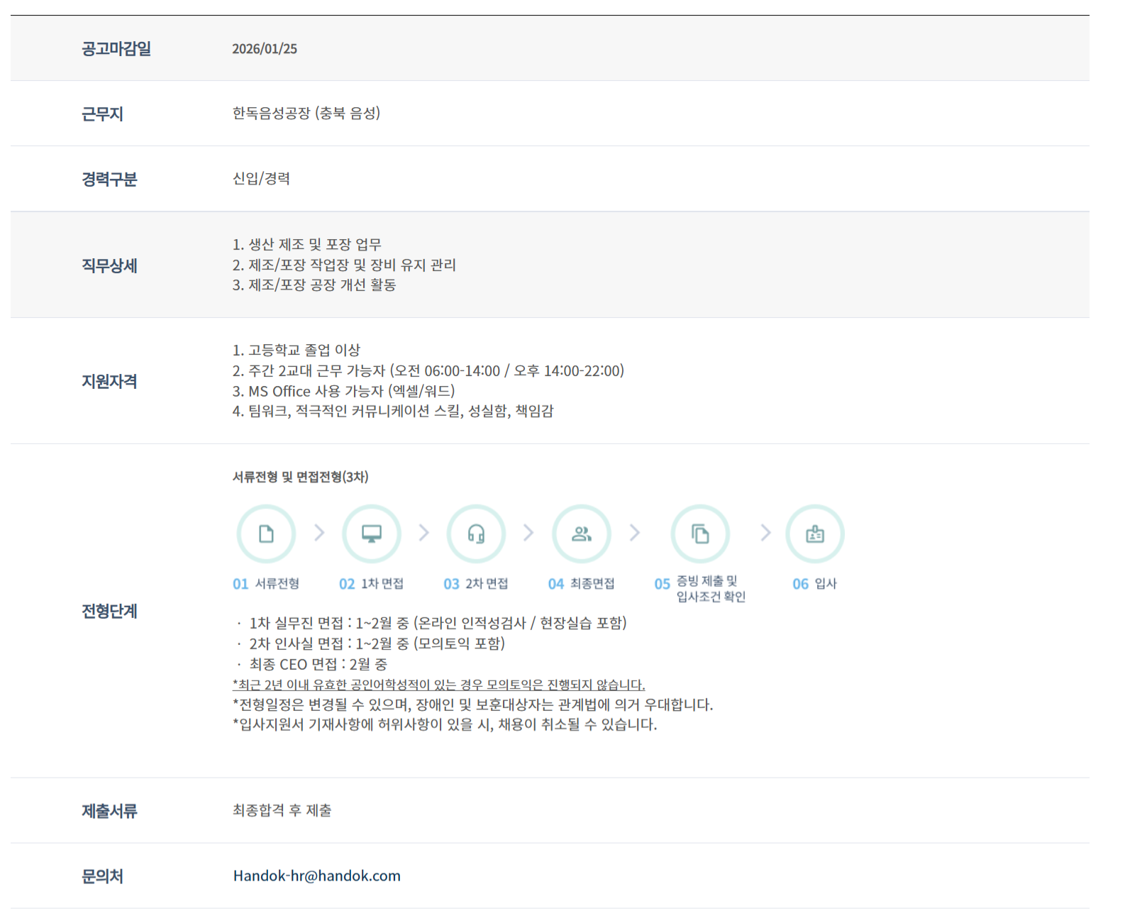 °ø°í¸¶°¨ÀÏ 2026/01/25 ±Ù¹«Áö Çѵ¶À½¼º°øÀå (ÃæºÏ À½¼º) °æ·Â±¸ºÐ ½ÅÀÔ/°æ·Â Á÷¹«»ó¼¼ 1. »ý»ê Á¦Á¶ ¹× Æ÷Àå ¾÷¹« 2. Á¦Á¶/Æ÷Àå ÀÛ¾÷Àå ¹× Àåºñ À¯Áö °ü¸® 3. Á¦Á¶/Æ÷Àå °øÀå °³¼± Ȱµ¿ Áö¿øÀÚ°Ý 1. °íµîÇб³ Á¹¾÷ ÀÌ»ó 2. ÁÖ°£ 2±³´ë ±Ù¹« °¡´ÉÀÚ (¿ÀÀü 06:00-14:00 / ¿ÀÈÄ 14:00-22:00) 3. MS Office »ç¿ë °¡´ÉÀÚ (¿¢¼¿/¿öµå) 4. ÆÀ¿öÅ©, Àû±ØÀûÀÎ Ä¿¹Â´ÏÄÉÀÌ¼Ç ½ºÅ³, ¼º½ÇÇÔ, Ã¥ÀÓ°¨