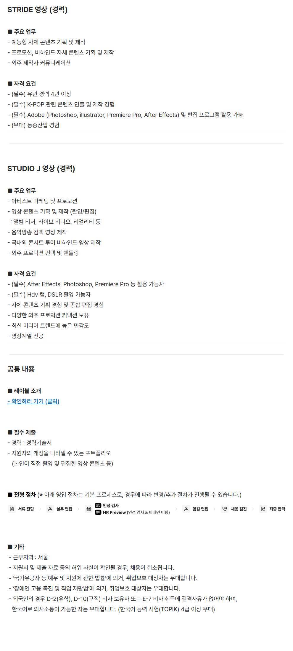 [JYP ENTERTAINMENT] ¿µ»ó (°æ·Â) STRIDE ¿µ»ó ​(°æ·Â) ¡á ​ÁÖ¿ä ​¾÷¹« - ¿¹´ÉÇü ÀÚü ​ÄÜÅÙÃ÷ ±âȹ ¹× Á¦ÀÛ - ÇÁ·Î¸ð¼Ç, ​ºñÇÏÀεå ​ÀÚü ÄÜÅÙÃ÷ ​±âȹ ¹× Á¦ÀÛ - ¿ÜÁÖ ​Á¦ÀÛ»ç Ä¿¹Â´ÏÄÉÀÌ¼Ç ¡á ​ÀÚ°Ý ​¿ä°Ç - (Çʼö) À¯°ü ​°æ·Â ​4³â ​ÀÌ»ó - (Çʼö) K-POP °ü·Ã ​ÄÜÅÙÃ÷ ​¿¬Ãâ ¹× Á¦ÀÛ ​°æÇè - (Çʼö) ​Adobe ​(Photoshop, illustrator, Premiere ​Pro, After ​Effects) ​¹× ÆíÁý ​ÇÁ·Î±×·¥ Ȱ¿ë ​°¡´É - (¿ì´ë) ​µ¿Á¾»ê¾÷ °æÇè STUDIO J ​¿µ»ó (°æ·Â) ¡á ​ÁÖ¿ä ¾÷¹« - ¾ÆÆ¼½ºÆ® ¸¶ÄÉÆÃ ¹× ÇÁ·Î¸ð¼Ç - ¿µ»ó ÄÜÅÙÃ÷ ±âȹ ¹× Á¦ÀÛ (ÃÔ¿µ/ÆíÁý) : ¾Ù¹ü ƼÀú, ¶óÀÌºê ºñµð¿À, ¸®¾ó¸®Æ¼ µî - À½¾Ç¹æ¼Û ÄÄ¹é ¿µ»ó Á¦ÀÛ - ±¹³»¿Ü Äܼ­Æ® Åõ¾î ºñÇÏÀÎµå ¿µ»ó Á¦ÀÛ - ¿ÜÁÖ ÇÁ·Î´ö¼Ç ÄÁÅà ¹× Çڵ鸵 ¡á ÀÚ°Ý ¿ä°Ç - (Çʼö) After Effects, Photoshop, Premiere Pro µî Ȱ¿ë °¡´ÉÀÚ - (Çʼö) Hdv Ä·, DSLR ÃÔ¿µ °¡´ÉÀÚ - ÀÚü ÄÜÅÙÃ÷ ±âȹ °æÇè ¹× Á¾ÇÕ ÆíÁý °æÇè - ´Ù¾çÇÑ ¿ÜÁÖ ÇÁ·Î´ö¼Ç Ä¿³Ø¼Ç º¸À¯ - ÃֽŠ¹Ìµð¾î Æ®·»µå¿¡ ³ôÀº ¹Î°¨µµ - ¿µ»ó°è¿­ Àü°ø