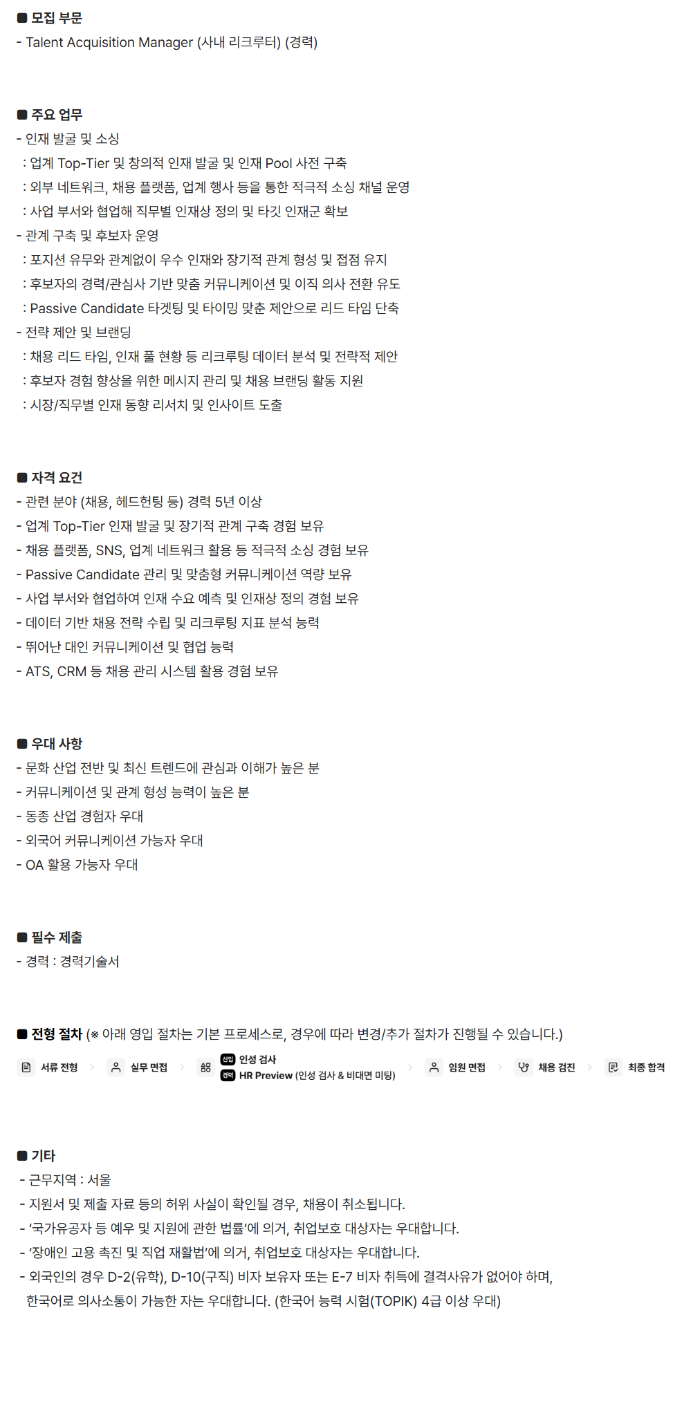 - Talent Acquisition Manager (»ç³» ¸®Å©·çÅÍ) (°æ·Â)