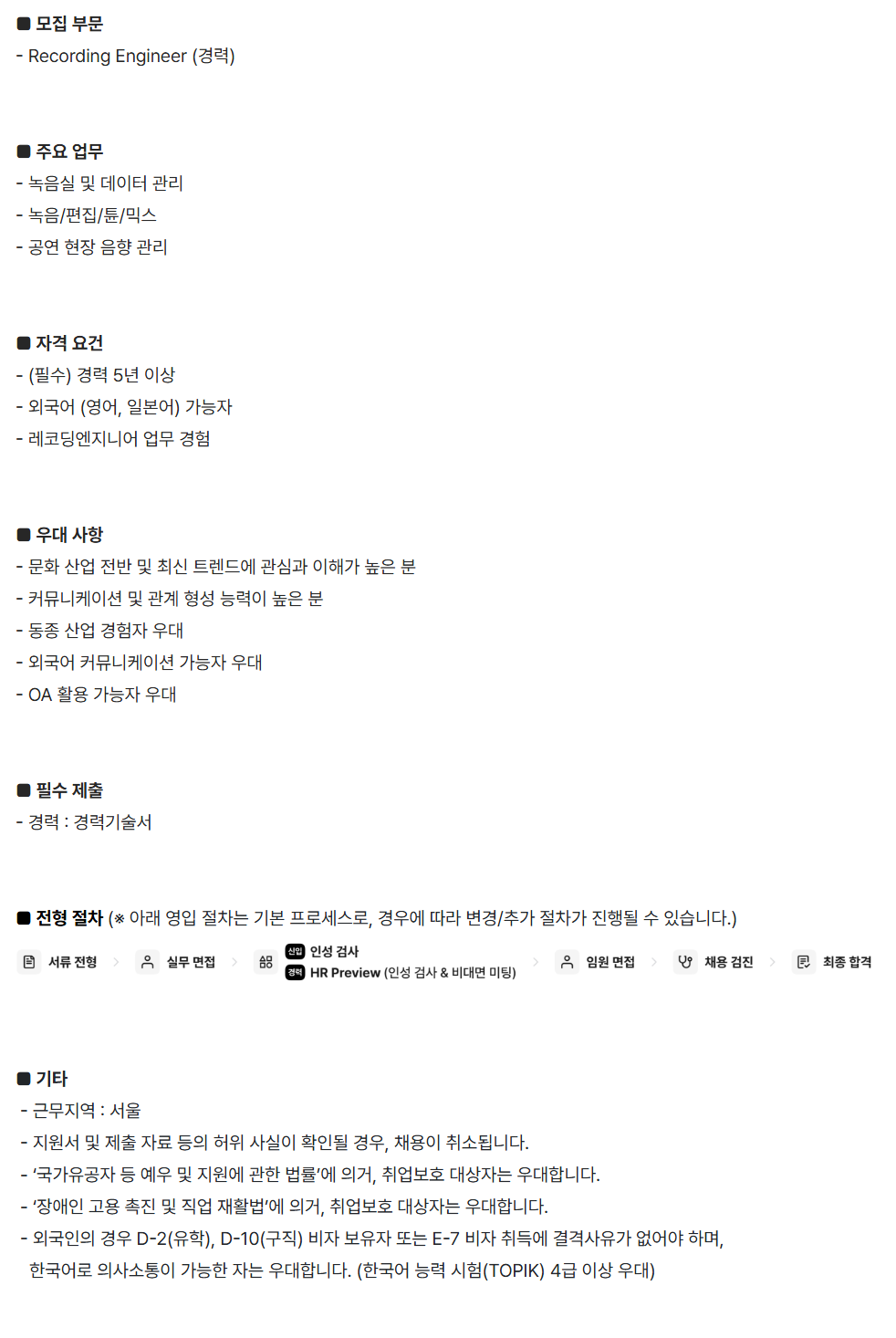 [JYP ENTERTAINMENT] Recording Engineer (°æ·Â)