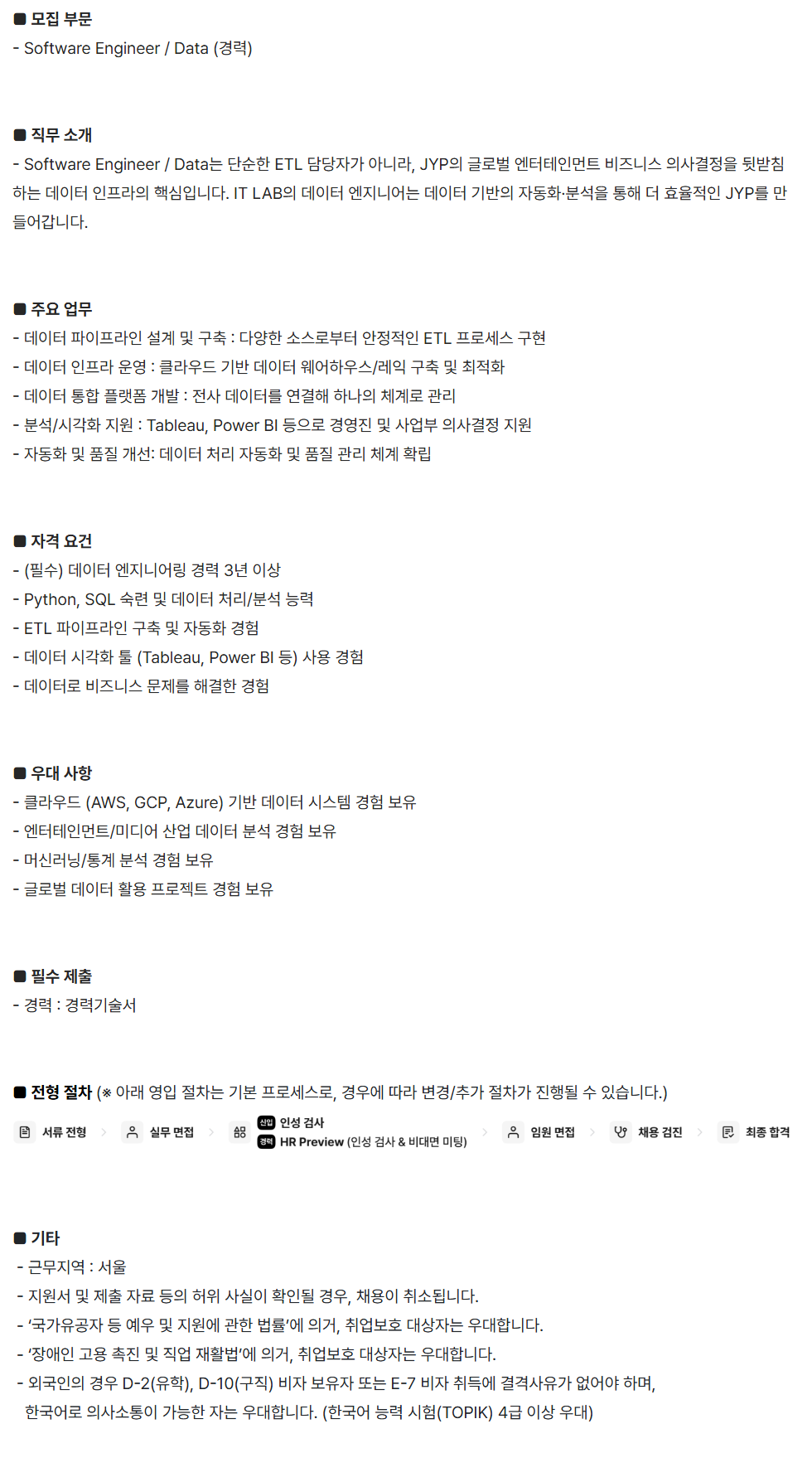 [JYP ENTERTAINMENT] Software Engineer / Data (°æ·Â)