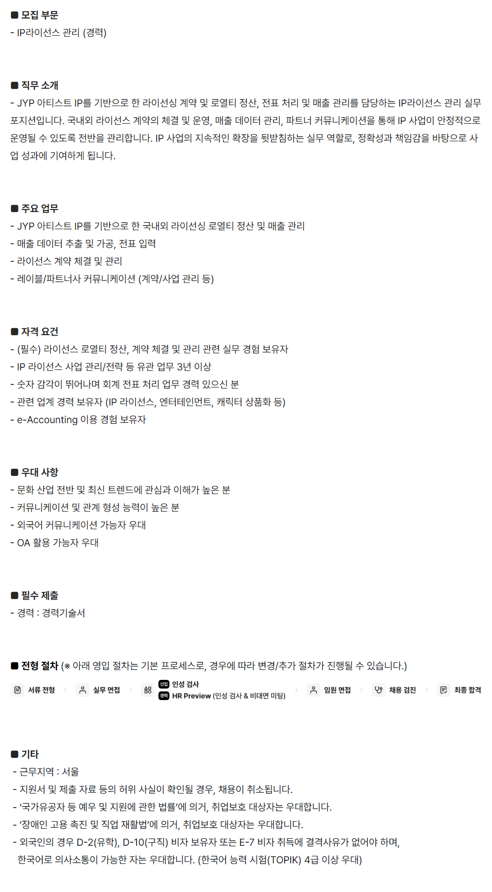 [JYP ENTERTAINMENT] IP¶óÀ̼±½º °ü¸® (°æ·Â)
