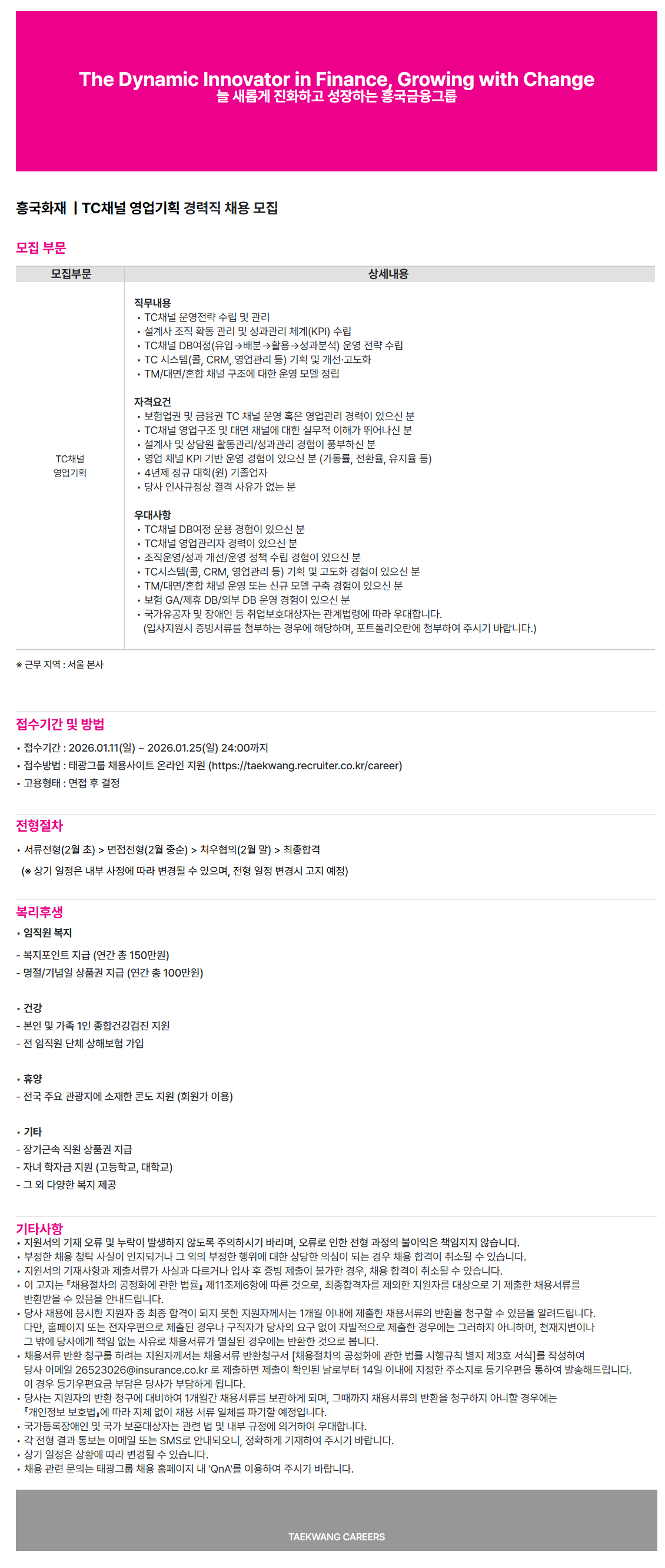 • Á¢¼ö¹æ¹ý : ű¤±×·ì ä¿ë»çÀÌÆ® ¿Â¶óÀÎ Áö¿ø (https://taekwang.recruiter.co.kr/career)