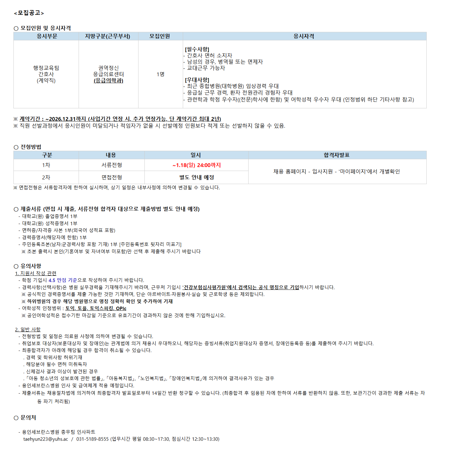 [¿ëÀÎ] ÇàÁ¤±³À°ÆÀ(±Ç¿ªÁ¤½ÅÀÀ±ÞÀÇ·á¼¾ÅÍ-ÀÀ±ÞÀÇÇаú) °£È£»ç(°è¾àÁ÷) ½Å±Ôä¿ë 26.1