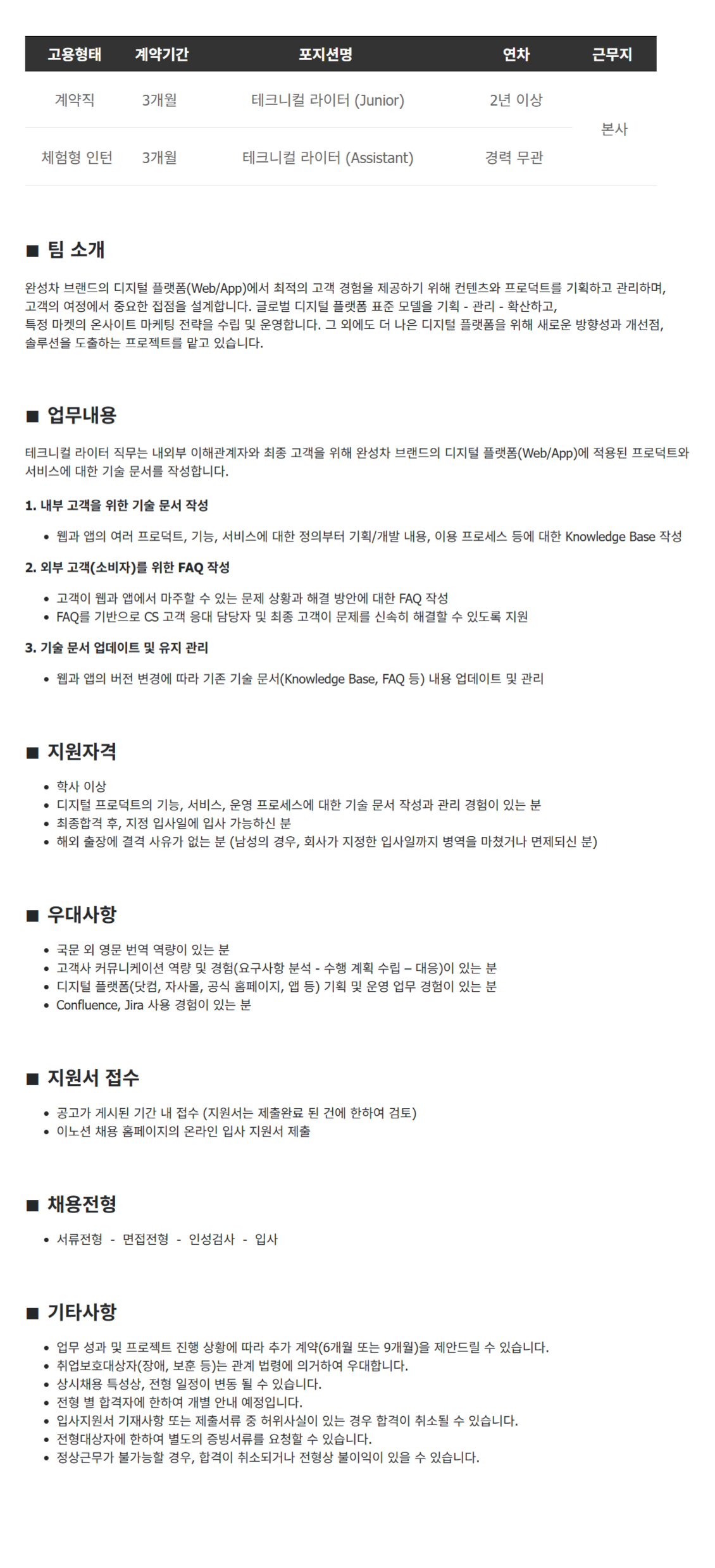 °í¿ëÇüÅ °è¾à±â°£ Æ÷Áö¼Ç¸í ¿¬Â÷ ±Ù¹«Áö °è¾àÁ÷ 3°³¿ù Å×Å©´ÏÄà ¶óÀÌÅÍ (Junior) 2³â ÀÌ»ó º»»ç üÇèÇü ÀÎÅÏ 3°³¿ù Å×Å©´ÏÄà ¶óÀÌÅÍ (Assistant) °æ·Â ¹«°ü