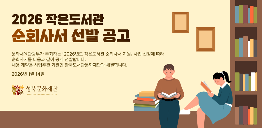 | ä¿ë°ø°í | 2026.01.14.(¼ö) ~ 2026.01.21.(¼ö) | ¼ººÏ¹®ÈÀç´Ü ȨÆäÀÌÁö ¼ººÏ±¸¸³µµ¼°ü ȨÆäÀÌÁö |