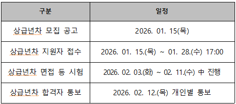 - Á¢¼ö´Â 2026. 01. 15.(¸ñ) ~ 01. 28(¼ö) 17½Ã±îÁö ±³À°¼ö·ÃÆÀ(º»°ü 8Ãþ)¿¡¼ °¡´ÉÇÕ´Ï´Ù.