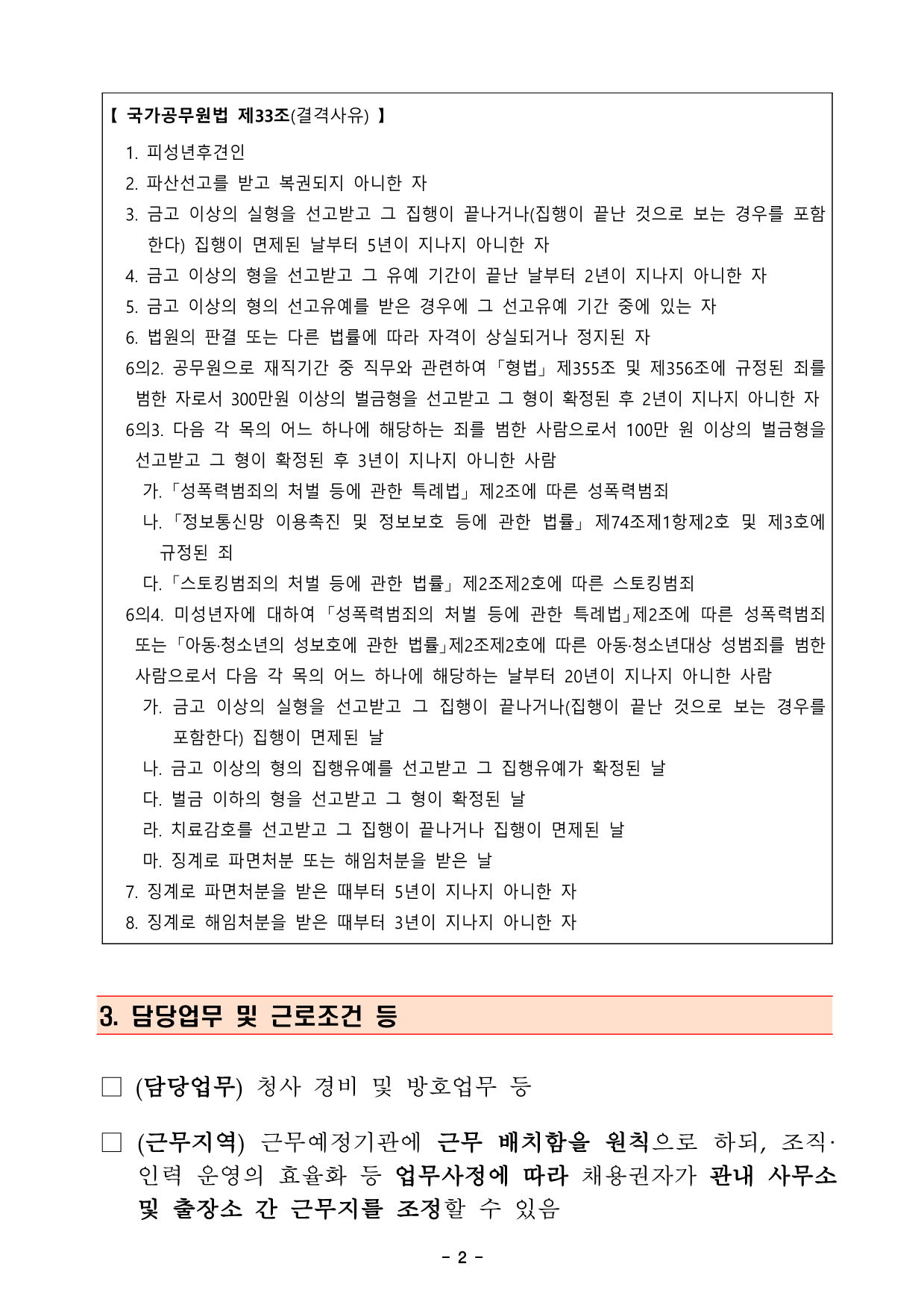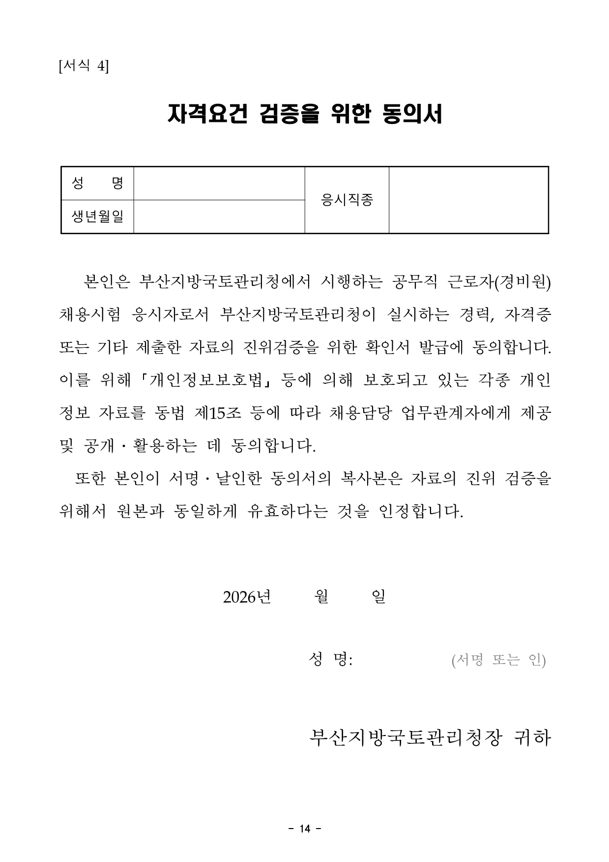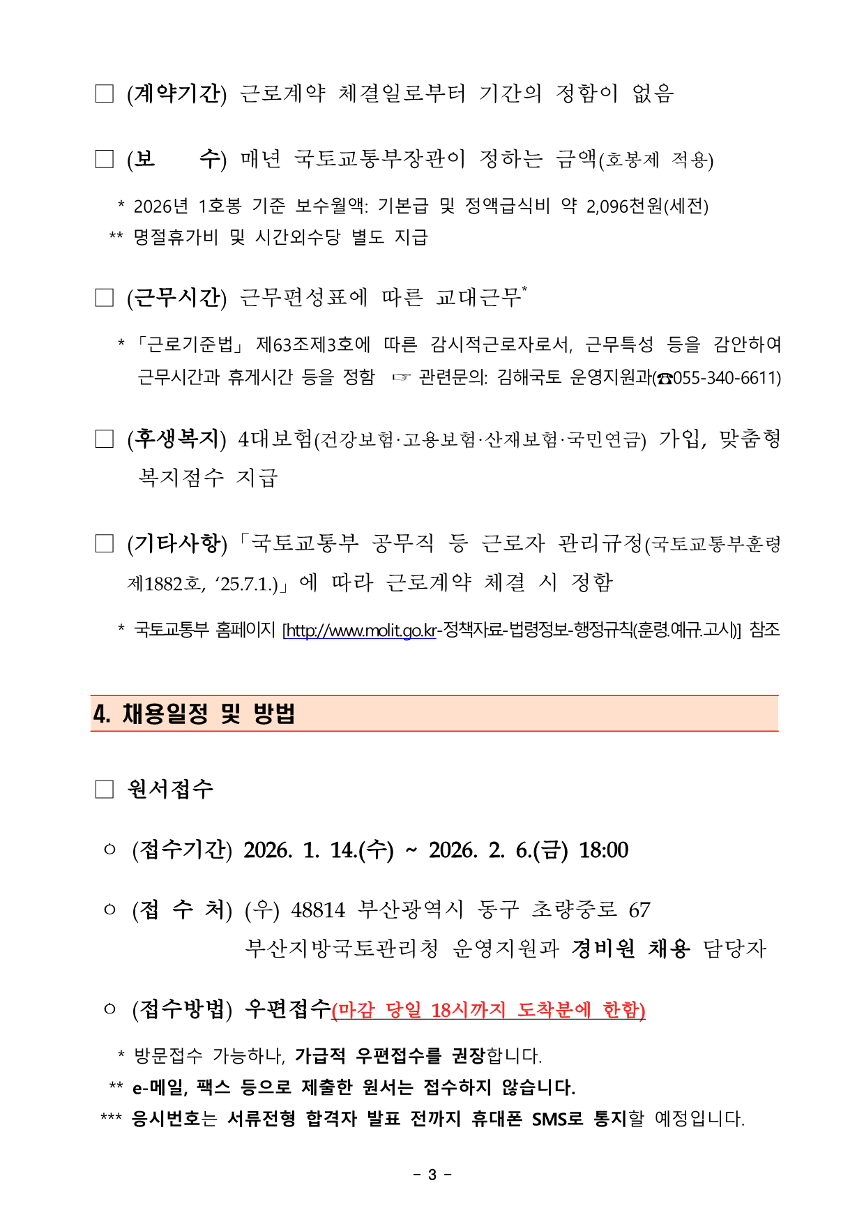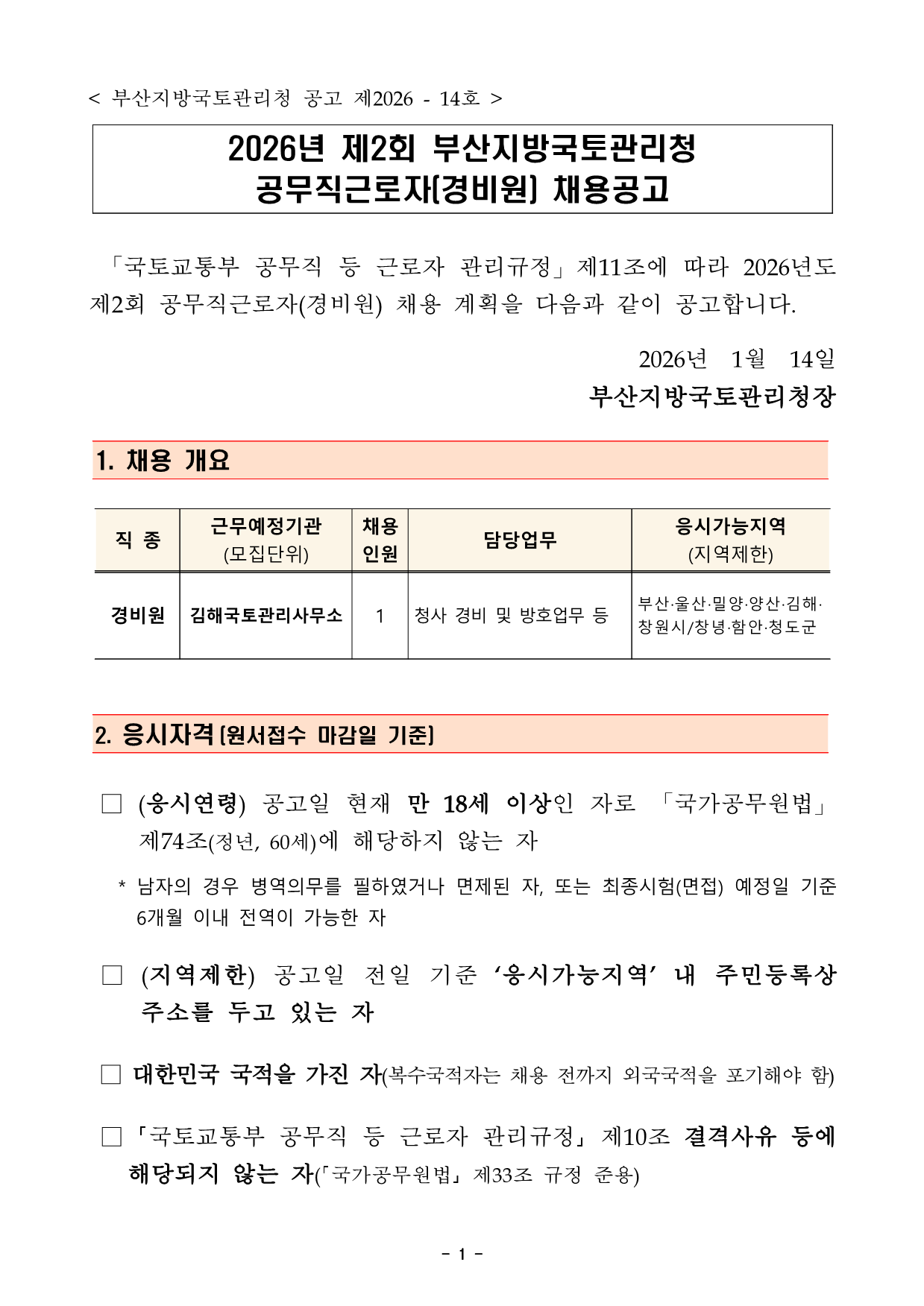 2026³â Á¦2ȸ ºÎ»êÁö¹æ±¹Åä°ü¸®Ã» °ø¹«Á÷±Ù·ÎÀÚ(°æºñ¿ø) ä¿ë°ø°í ¡¸±¹Åä±³ÅëºÎ °ø¹«Á÷ µî ±Ù·ÎÀÚ °ü¸®±ÔÁ¤¡¹Á¦11Á¶¿¡ µû¶ó 2026³âµµ Á¦2ȸ °ø¹«Á÷±Ù·ÎÀÚ(°æºñ¿ø) ä¿ë °èȹÀ» ´ÙÀ½°ú °°ÀÌ °ø°íÇÕ´Ï´Ù. 2026³â 1¿ù 14ÀϺλêÁö¹æ±¹Åä°ü¸®Ã»Àå1. ä¿ë °³¿ä Á÷ Á¾ ±Ù¹«¿¹Á¤±â°ü (¸ðÁý´ÜÀ§) ä¿ë Àοø ´ã´ç¾÷¹« ÀÀ½Ã°¡´ÉÁö¿ª (Áö¿ªÁ¦ÇÑ) °æºñ¿ø ±èÇØ±¹Åä°ü¸®»ç¹«¼Ò 1 û»ç °æºñ ¹× ¹æÈ£¾÷¹« µî ºÎ»ê¡¤¿ï»ê¡¤¹Ð¾ç¡¤¾ç»ê¡¤±èÇØ¡¤ â¿ø½Ã/â³ç¡¤ÇԾȡ¤Ã»µµ±º2. ÀÀ½ÃÀÚ°Ý (¿ø¼Á¢¼ö ¸¶°¨ÀÏ ±âÁØ) ¡à (ÀÀ½Ã¿¬·É) °ø°íÀÏ ÇöÀç ¸¸ 18¼¼ ÀÌ»óÀÎ ÀÚ·Î ¡¸±¹°¡°ø¹«¿ø¹ý¡¹Á¦74Á¶(Á¤³â, 60¼¼)¿¡ ÇØ´çÇÏÁö ¾Ê´Â ÀÚ * ³²ÀÚÀÇ °æ¿ì º´¿ªÀǹ«¸¦ ÇÊÇÏ¿´°Å³ª ¸éÁ¦µÈ ÀÚ, ¶Ç´Â ÃÖÁ¾½ÃÇè(¸éÁ¢) ¿¹Á¤ÀÏ ±âÁØ 6°³¿ù À̳» Àü¿ªÀÌ °¡´ÉÇÑ ÀÚ ¡à (Áö¿ªÁ¦ÇÑ) °ø°íÀÏ ÀüÀÏ ±âÁØ ¡®ÀÀ½Ã°¡´ÉÁö¿ª¡¯ ³» Áֹεî·Ï»ó ÁÖ¼Ò¸¦ µÎ°í ÀÖ´Â ÀÚ ¡à ´ëÇѹα¹ ±¹ÀûÀ» °¡Áø ÀÚ(º¹¼ö±¹ÀûÀڴ ä¿ë Àü±îÁö ¿Ü±¹±¹ÀûÀ» Æ÷±âÇØ¾ß ÇÔ) ¡à 「±¹Åä±³ÅëºÎ °ø¹«Á÷ µî ±Ù·ÎÀÚ °ü¸®±ÔÁ¤」 Á¦10Á¶ °á°Ý»çÀ¯ µî¿¡ ÇØ´çµÇÁö ¾Ê´Â ÀÚ(「±¹°¡°ø¹«¿ø¹ý」 Á¦33Á¶ ±ÔÁ¤ ÁØ¿ë)