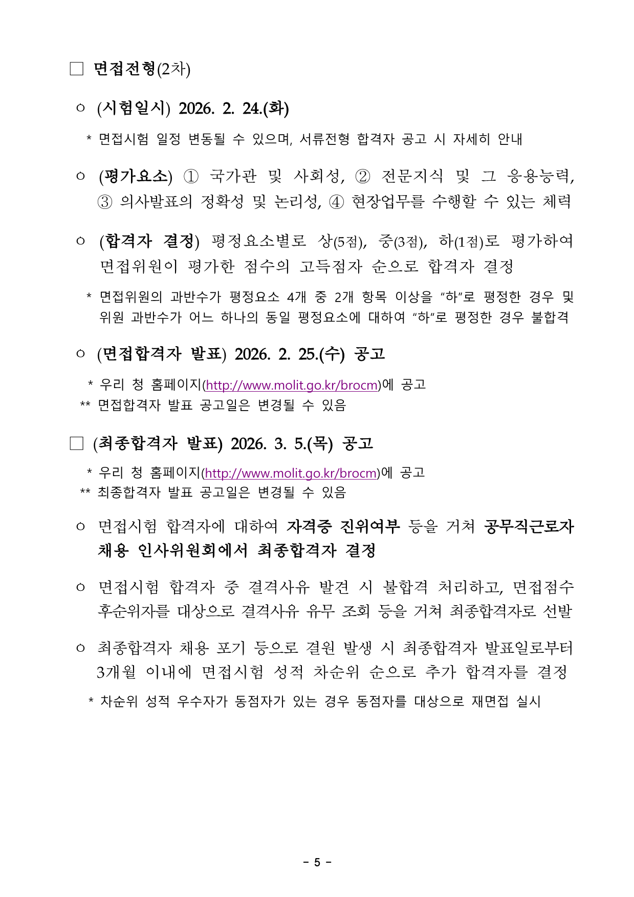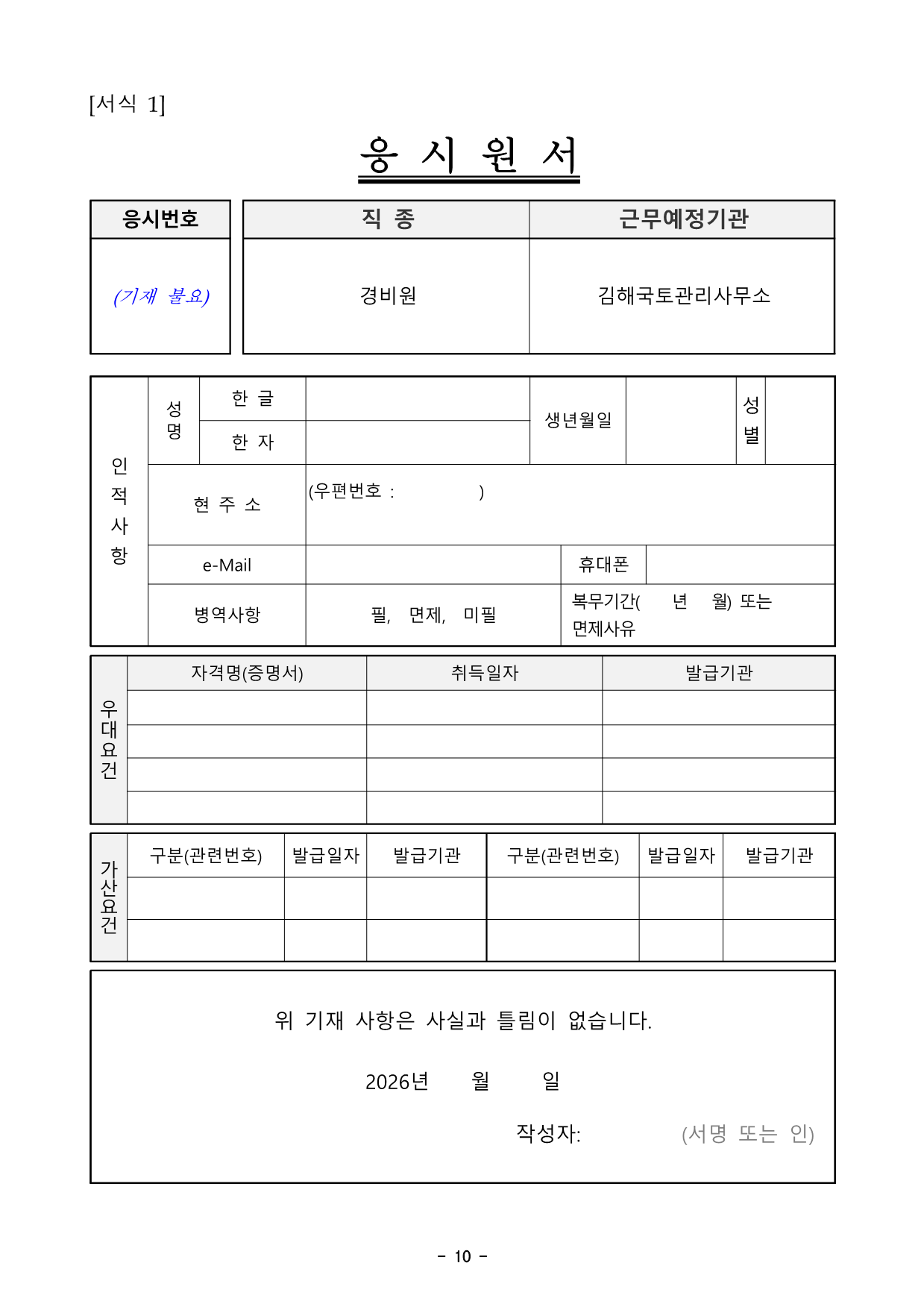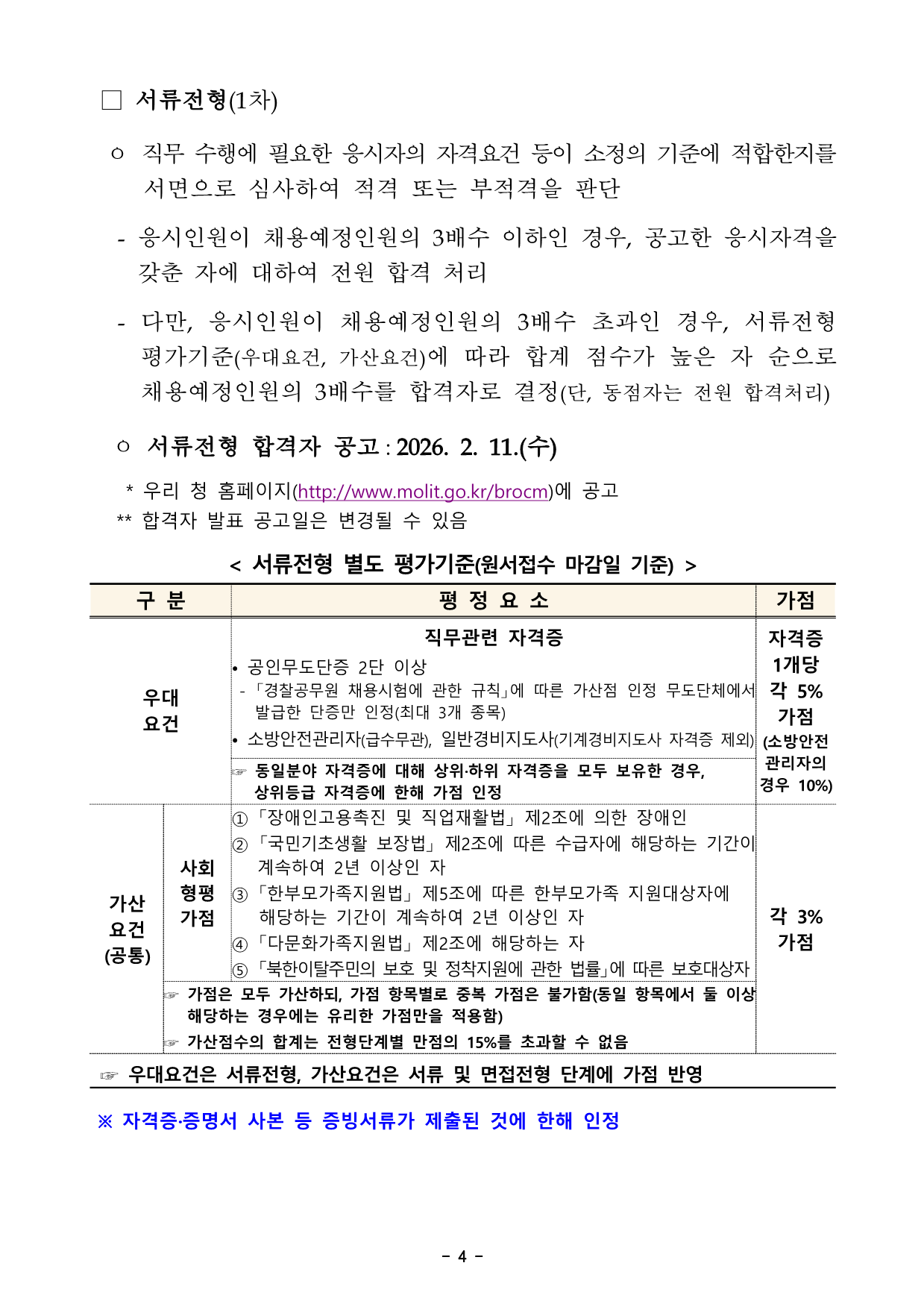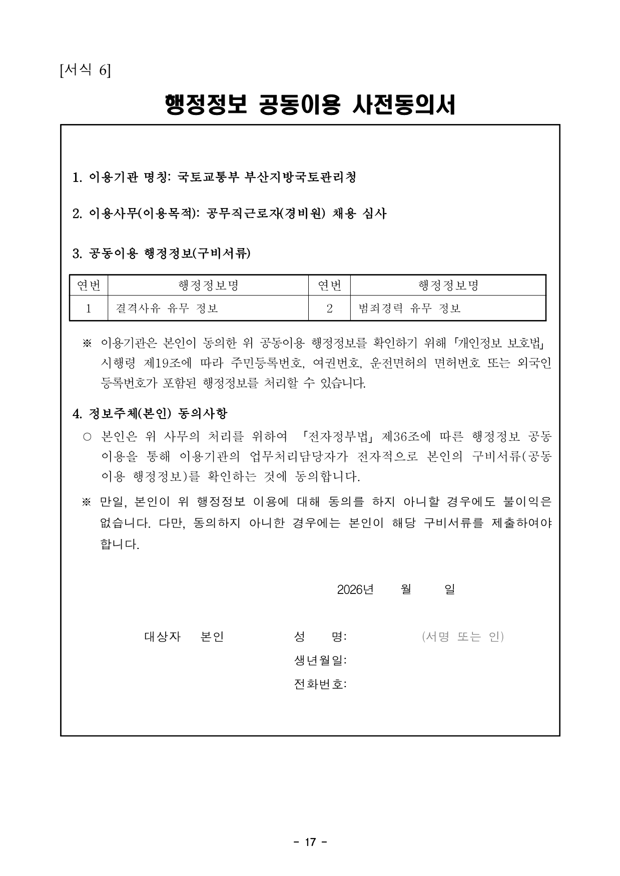 2026³â Á¦2ȸ ºÎ»êÁö¹æ±¹Åä°ü¸®Ã» °ø¹«Á÷±Ù·ÎÀÚ(°æºñ¿ø) ä¿ë°ø°í ¡¸±¹Åä±³ÅëºÎ °ø¹«Á÷ µî ±Ù·ÎÀÚ °ü¸®±ÔÁ¤¡¹Á¦11Á¶¿¡ µû¶ó 2026³âµµ Á¦2ȸ °ø¹«Á÷±Ù·ÎÀÚ(°æºñ¿ø) ä¿ë °èȹÀ» ´ÙÀ½°ú °°ÀÌ °ø°íÇÕ´Ï´Ù. 2026³â 1¿ù 14ÀϺλêÁö¹æ±¹Åä°ü¸®Ã»Àå1. ä¿ë °³¿ä Á÷ Á¾ ±Ù¹«¿¹Á¤±â°ü (¸ðÁý´ÜÀ§) ä¿ë Àοø ´ã´ç¾÷¹« ÀÀ½Ã°¡´ÉÁö¿ª (Áö¿ªÁ¦ÇÑ) °æºñ¿ø ±èÇØ±¹Åä°ü¸®»ç¹«¼Ò 1 û»ç °æºñ ¹× ¹æÈ£¾÷¹« µî ºÎ»ê¡¤¿ï»ê¡¤¹Ð¾ç¡¤¾ç»ê¡¤±èÇØ¡¤ â¿ø½Ã/â³ç¡¤ÇԾȡ¤Ã»µµ±º2. ÀÀ½ÃÀÚ°Ý (¿ø¼Á¢¼ö ¸¶°¨ÀÏ ±âÁØ) ¡à (ÀÀ½Ã¿¬·É) °ø°íÀÏ ÇöÀç ¸¸ 18¼¼ ÀÌ»óÀÎ ÀÚ·Î ¡¸±¹°¡°ø¹«¿ø¹ý¡¹Á¦74Á¶(Á¤³â, 60¼¼)¿¡ ÇØ´çÇÏÁö ¾Ê´Â ÀÚ * ³²ÀÚÀÇ °æ¿ì º´¿ªÀǹ«¸¦ ÇÊÇÏ¿´°Å³ª ¸éÁ¦µÈ ÀÚ, ¶Ç´Â ÃÖÁ¾½ÃÇè(¸éÁ¢) ¿¹Á¤ÀÏ ±âÁØ 6°³¿ù À̳» Àü¿ªÀÌ °¡´ÉÇÑ ÀÚ ¡à (Áö¿ªÁ¦ÇÑ) °ø°íÀÏ ÀüÀÏ ±âÁØ ¡®ÀÀ½Ã°¡´ÉÁö¿ª¡¯ ³» Áֹεî·Ï»ó ÁÖ¼Ò¸¦ µÎ°í ÀÖ´Â ÀÚ ¡à ´ëÇѹα¹ ±¹ÀûÀ» °¡Áø ÀÚ(º¹¼ö±¹ÀûÀڴ ä¿ë Àü±îÁö ¿Ü±¹±¹ÀûÀ» Æ÷±âÇØ¾ß ÇÔ) ¡à 「±¹Åä±³ÅëºÎ °ø¹«Á÷ µî ±Ù·ÎÀÚ °ü¸®±ÔÁ¤」 Á¦10Á¶ °á°Ý»çÀ¯ µî¿¡ ÇØ´çµÇÁö ¾Ê´Â ÀÚ(「±¹°¡°ø¹«¿ø¹ý」 Á¦33Á¶ ±ÔÁ¤ ÁØ¿ë)
