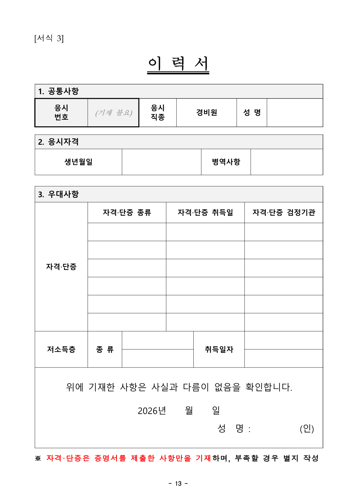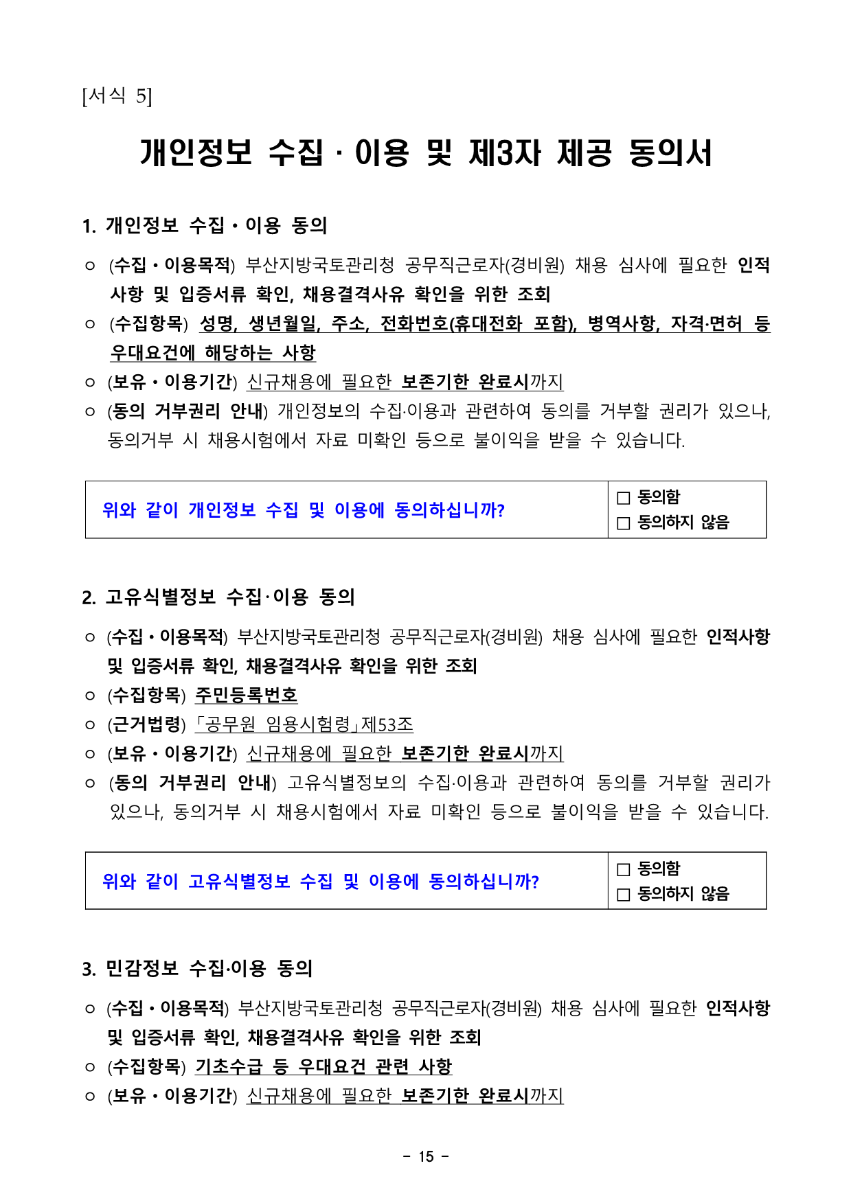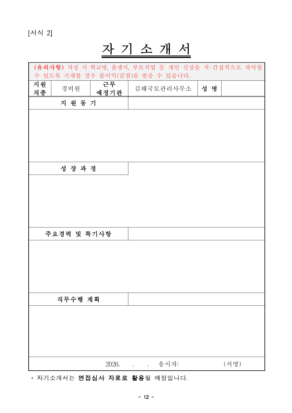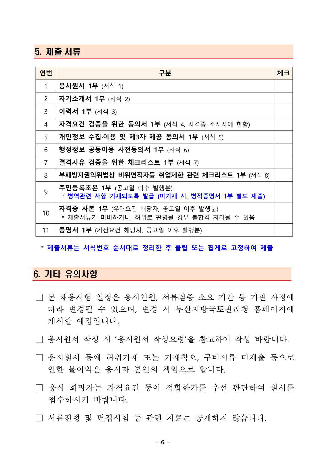 2026³â Á¦2ȸ ºÎ»êÁö¹æ±¹Åä°ü¸®Ã» °ø¹«Á÷±Ù·ÎÀÚ(°æºñ¿ø) ä¿ë°ø°í ¡¸±¹Åä±³ÅëºÎ °ø¹«Á÷ µî ±Ù·ÎÀÚ °ü¸®±ÔÁ¤¡¹Á¦11Á¶¿¡ µû¶ó 2026³âµµ Á¦2ȸ °ø¹«Á÷±Ù·ÎÀÚ(°æºñ¿ø) ä¿ë °èȹÀ» ´ÙÀ½°ú °°ÀÌ °ø°íÇÕ´Ï´Ù. 2026³â 1¿ù 14ÀϺλêÁö¹æ±¹Åä°ü¸®Ã»Àå1. ä¿ë °³¿ä Á÷ Á¾ ±Ù¹«¿¹Á¤±â°ü (¸ðÁý´ÜÀ§) ä¿ë Àοø ´ã´ç¾÷¹« ÀÀ½Ã°¡´ÉÁö¿ª (Áö¿ªÁ¦ÇÑ) °æºñ¿ø ±èÇØ±¹Åä°ü¸®»ç¹«¼Ò 1 û»ç °æºñ ¹× ¹æÈ£¾÷¹« µî ºÎ»ê¡¤¿ï»ê¡¤¹Ð¾ç¡¤¾ç»ê¡¤±èÇØ¡¤ â¿ø½Ã/â³ç¡¤ÇԾȡ¤Ã»µµ±º2. ÀÀ½ÃÀÚ°Ý (¿ø¼Á¢¼ö ¸¶°¨ÀÏ ±âÁØ) ¡à (ÀÀ½Ã¿¬·É) °ø°íÀÏ ÇöÀç ¸¸ 18¼¼ ÀÌ»óÀÎ ÀÚ·Î ¡¸±¹°¡°ø¹«¿ø¹ý¡¹Á¦74Á¶(Á¤³â, 60¼¼)¿¡ ÇØ´çÇÏÁö ¾Ê´Â ÀÚ * ³²ÀÚÀÇ °æ¿ì º´¿ªÀǹ«¸¦ ÇÊÇÏ¿´°Å³ª ¸éÁ¦µÈ ÀÚ, ¶Ç´Â ÃÖÁ¾½ÃÇè(¸éÁ¢) ¿¹Á¤ÀÏ ±âÁØ 6°³¿ù À̳» Àü¿ªÀÌ °¡´ÉÇÑ ÀÚ ¡à (Áö¿ªÁ¦ÇÑ) °ø°íÀÏ ÀüÀÏ ±âÁØ ¡®ÀÀ½Ã°¡´ÉÁö¿ª¡¯ ³» Áֹεî·Ï»ó ÁÖ¼Ò¸¦ µÎ°í ÀÖ´Â ÀÚ ¡à ´ëÇѹα¹ ±¹ÀûÀ» °¡Áø ÀÚ(º¹¼ö±¹ÀûÀڴ ä¿ë Àü±îÁö ¿Ü±¹±¹ÀûÀ» Æ÷±âÇØ¾ß ÇÔ) ¡à 「±¹Åä±³ÅëºÎ °ø¹«Á÷ µî ±Ù·ÎÀÚ °ü¸®±ÔÁ¤」 Á¦10Á¶ °á°Ý»çÀ¯ µî¿¡ ÇØ´çµÇÁö ¾Ê´Â ÀÚ(「±¹°¡°ø¹«¿ø¹ý」 Á¦33Á¶ ±ÔÁ¤ ÁØ¿ë)