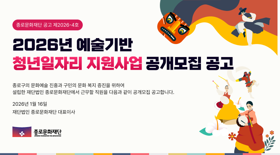 Á¾·Î±¸ÀÇ ¹®È­¿¹¼ú ÁøÈï°ú ±¸¹ÎÀÇ ¹®È­ º¹Áö ÁõÁøÀ» À§ÇÏ¿© ¼³¸³ÇÑ Àç´Ü¹ýÀÎ Á¾·Î¹®È­Àç´Ü¿¡¼­ ±Ù¹«ÇÒ Á÷¿øÀ» ´ÙÀ½°ú °°ÀÌ °ø°³¸ðÁý °ø°íÇÕ´Ï´Ù.