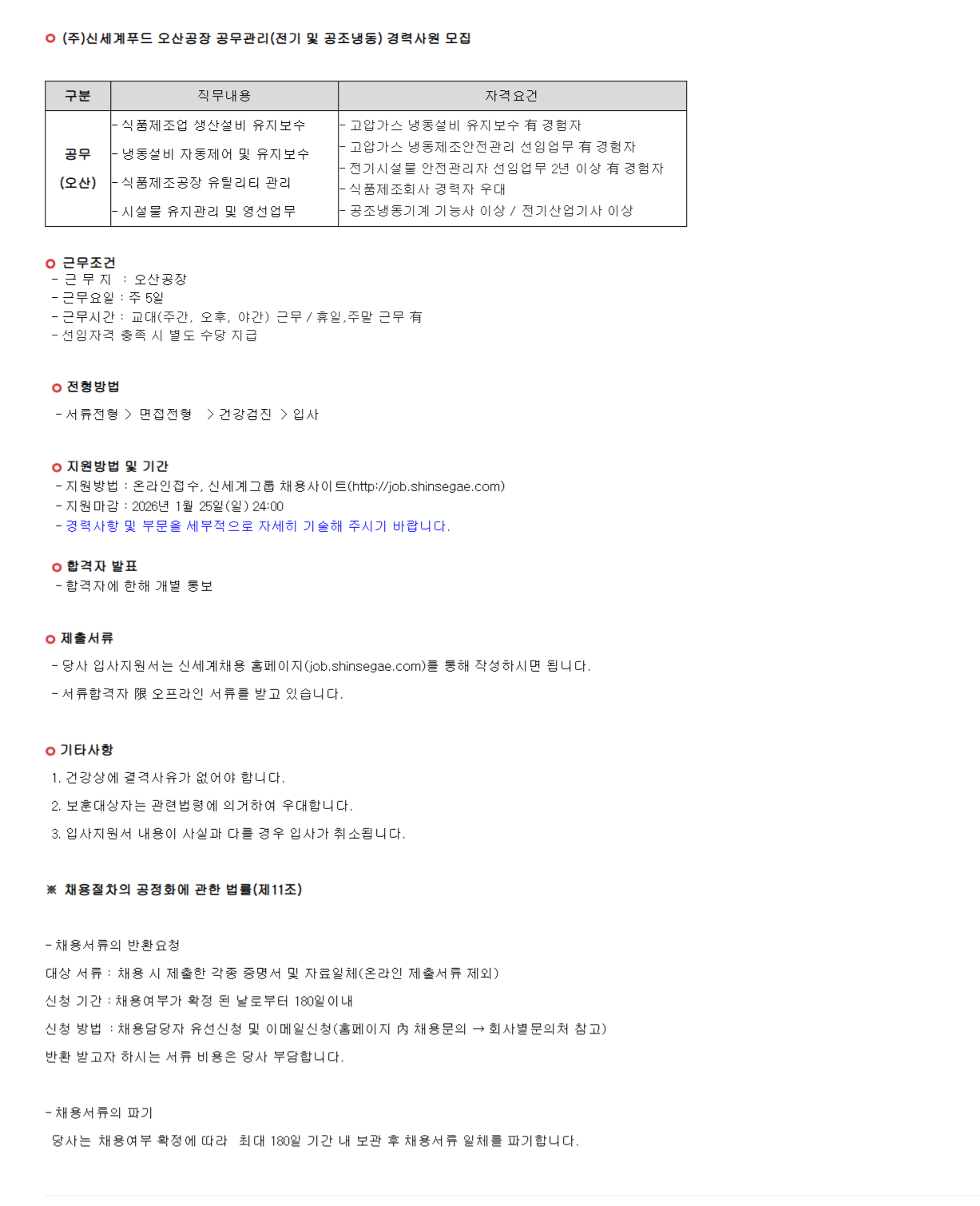 (ÁÖ)½Å¼¼°èǪµå ¿À»ê°øÀå °ø¹«°ü¸®(Àü±â ¹× °øÁ¶³Ãµ¿) °æ·Â»ç¿ø ¸ðÁý