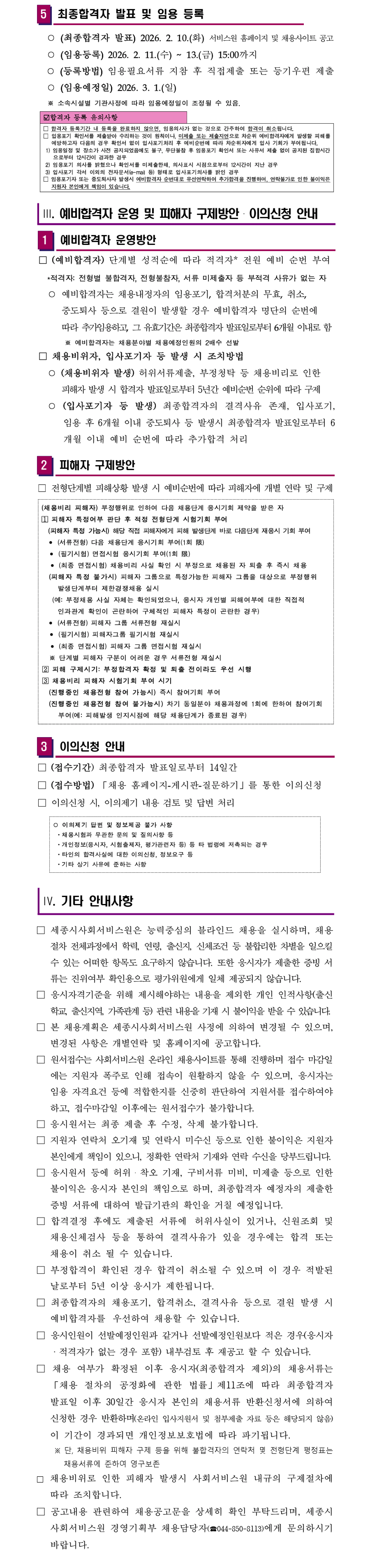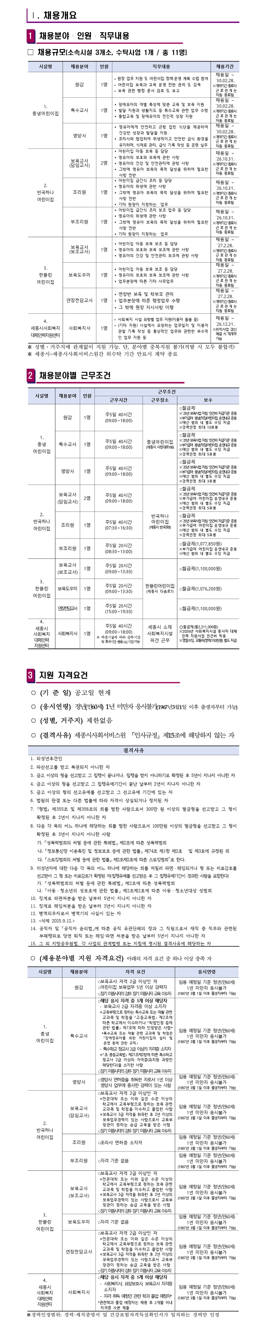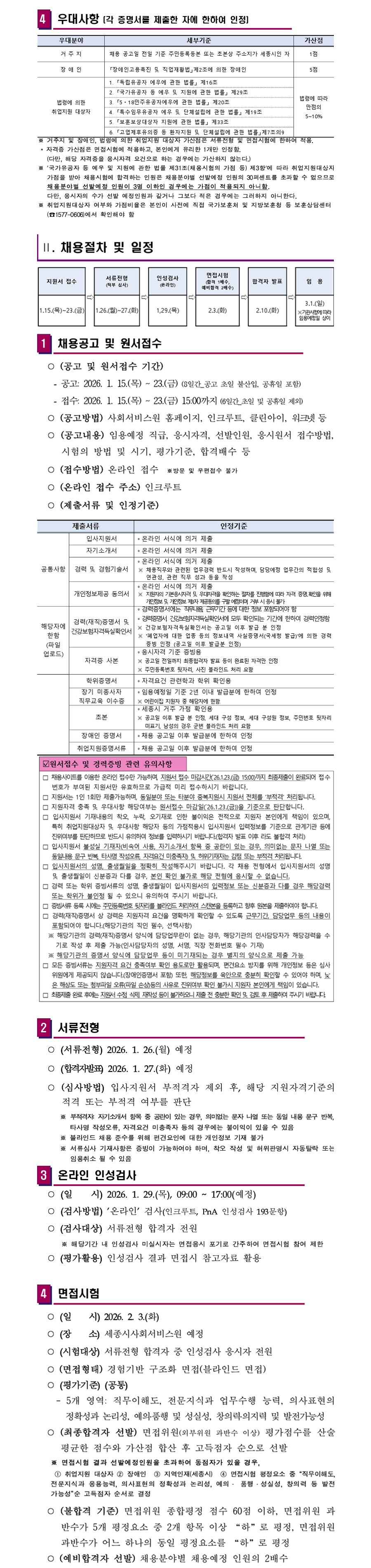 2026³â ¼¼Á¾½Ã»çȸ¼ºñ½º¿ø Á¦1Â÷ ¼Ò¼Ó½Ã¼³ ÅëÇÕä¿ë °ø°í ¼¼Á¾Æ¯º°ÀÚÄ¡½Ã »çȸ¼ºñ½º¿ø¿¡¼´Â NCS±â¹Ý ºí¶óÀεå ä¿ëÀ¸·Î Àü¹®¼º°ú ¿ª·®À» °®Ãá ºÐµéÀ» ´ÙÀ½°ú °°ÀÌ ¸ðÁý ÇÏ¿À´Ï ¸¹Àº Áö¿ø ¹Ù¶ø´Ï´Ù. 2026³â 1¿ù 15ÀÏ ¼¼Á¾Æ¯º°ÀÚÄ¡½Ã »çȸ¼ºñ½º¿øÀå