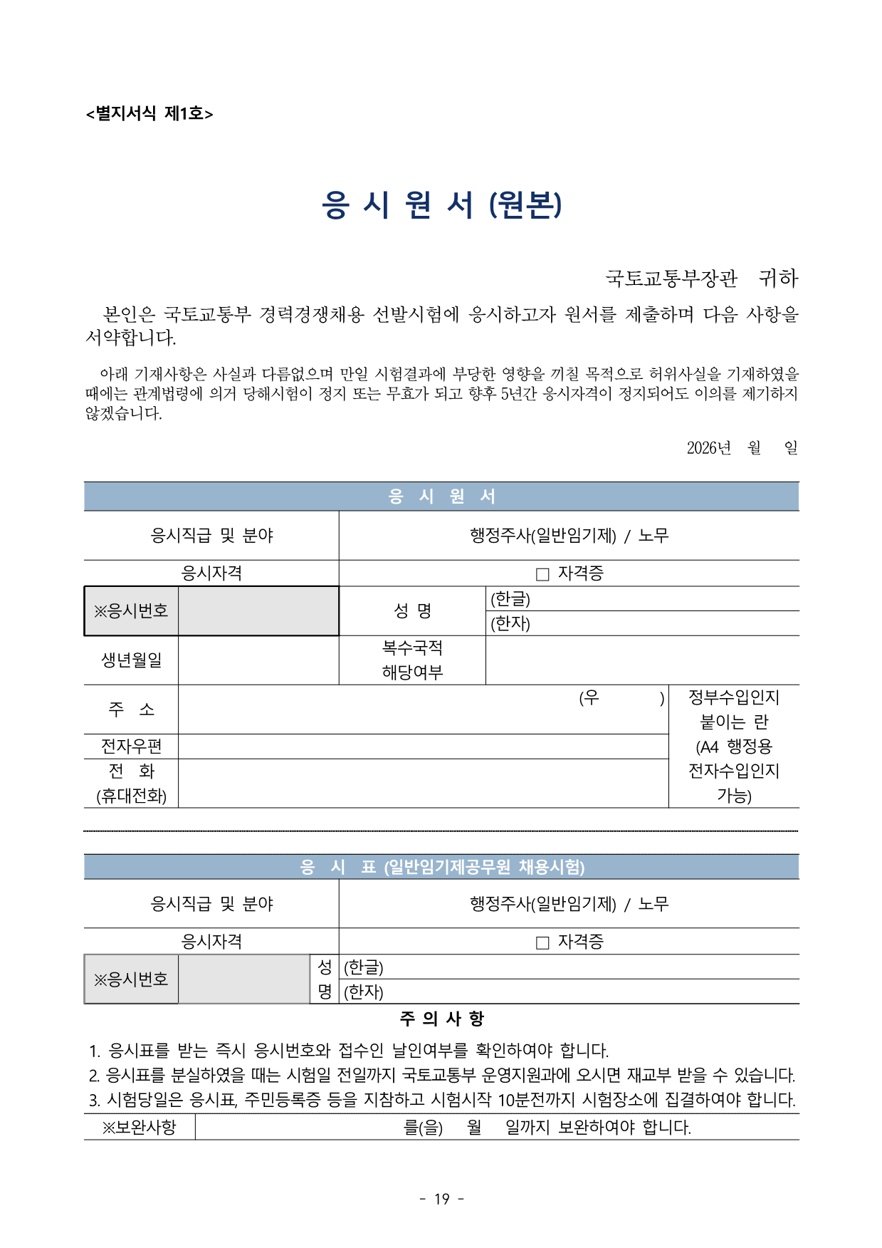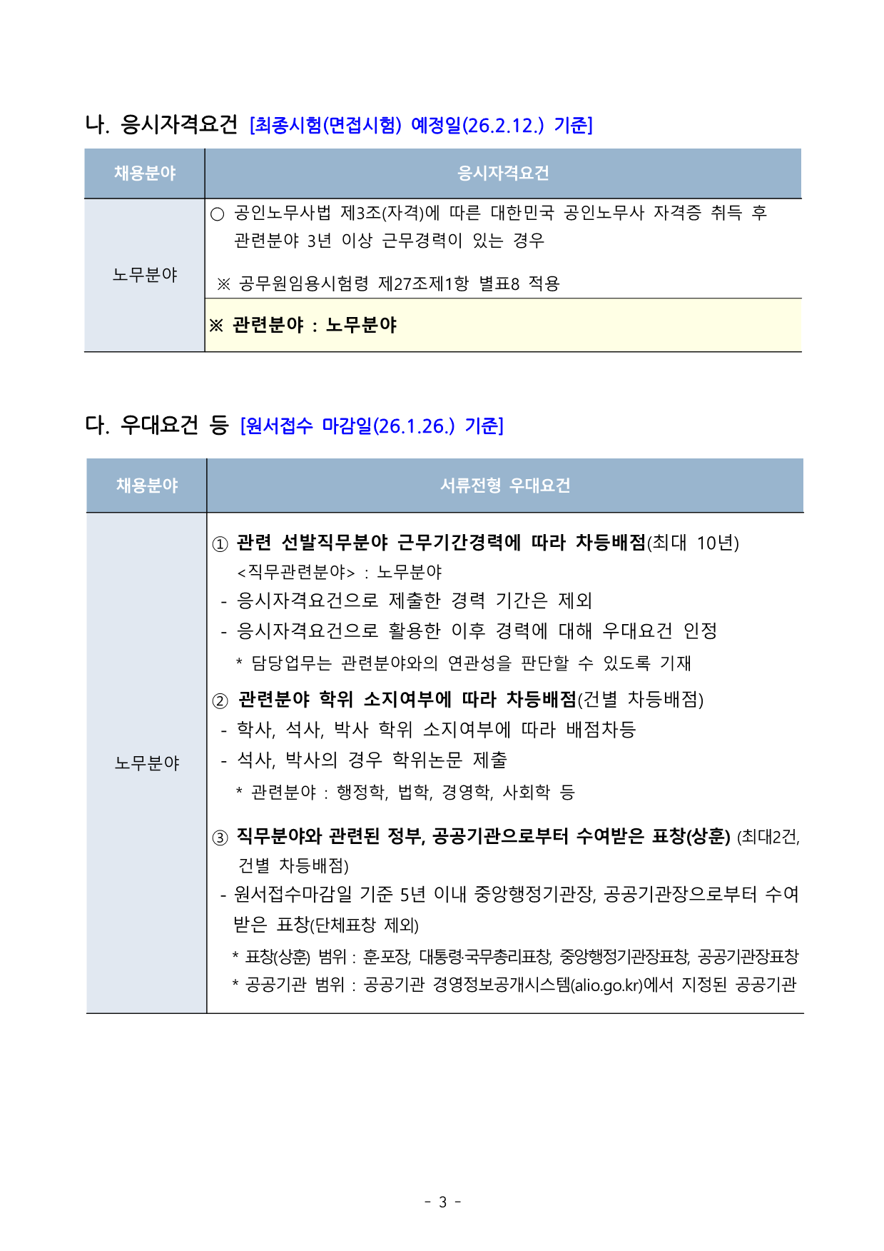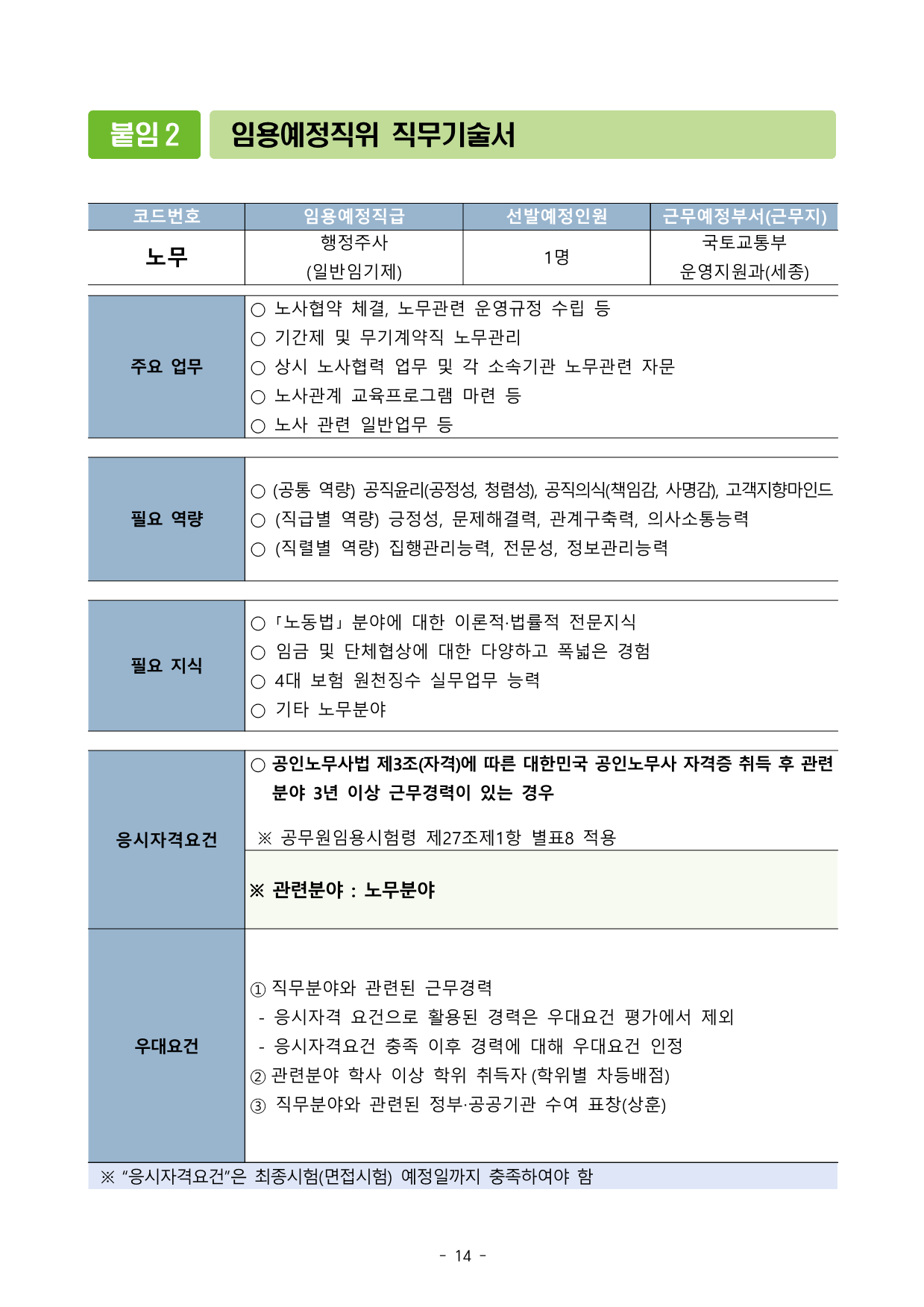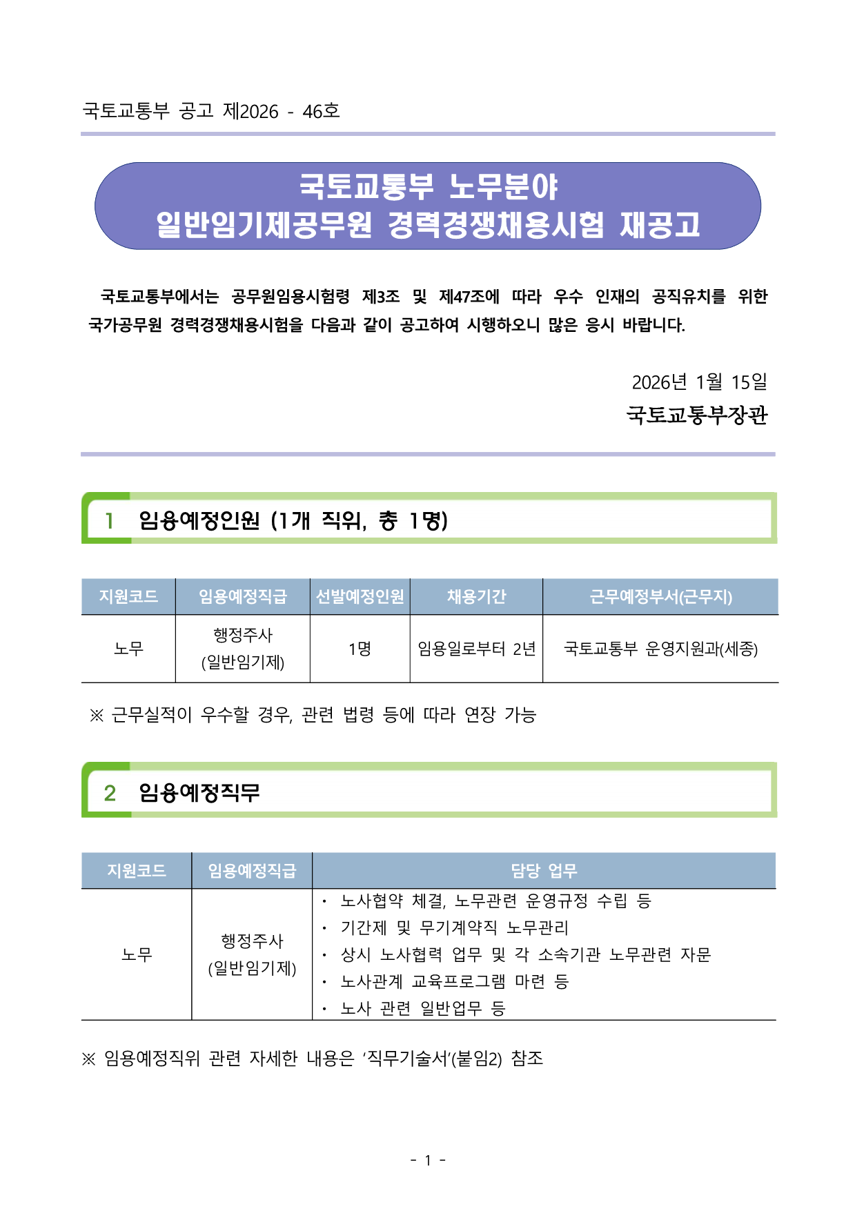 ±¹Åä±³ÅëºÎ °ø°í Á¦2026 - 46È£ ±¹Åä±³ÅëºÎ ³ë¹«ºÐ¾ß ÀϹÝÀÓ±âÁ¦°ø¹«¿ø °æ·Â°æÀïä¿ë½ÃÇè Àç°ø°í±¹Åä±³ÅëºÎ¿¡¼´Â °ø¹«¿øÀÓ¿ë½ÃÇè·É Á¦3Á¶ ¹× Á¦47Á¶¿¡ µû¶ó ¿ì¼ö ÀÎÀçÀÇ °øÁ÷À¯Ä¡¸¦ À§ÇÑ ±¹°¡°ø¹«¿ø °æ·Â°æÀïä¿ë½ÃÇèÀ» ´ÙÀ½°ú °°ÀÌ °ø°íÇÏ¿© ½ÃÇàÇÏ¿À´Ï ¸¹Àº ÀÀ½Ã ¹Ù¶ø´Ï´Ù. 2026³â 1¿ù 15Àϱ¹Åä±³ÅëºÎÀå°ü1 Àӿ뿹Á¤Àοø (1°³ Á÷À§, ÃÑ 1¸í) Áö¿øÄÚµå Àӿ뿹Á¤Á÷±Þ ¼±¹ß¿¹Á¤Àοø ä¿ë±â°£ ±Ù¹«¿¹Á¤ºÎ¼(±Ù¹«Áö) ³ë¹« ÇàÁ¤ÁÖ»ç (ÀϹÝÀÓ±âÁ¦) 1¸í ÀÓ¿ëÀϷκÎÅÍ 2³â ±¹Åä±³ÅëºÎ ¿î¿µÁö¿ø°ú(¼¼Á¾) ¡Ø ±Ù¹«½ÇÀûÀÌ ¿ì¼öÇÒ °æ¿ì, °ü·Ã ¹ý·É µî¿¡ µû¶ó ¿¬Àå °¡´É 2 Àӿ뿹Á¤Á÷¹« ¡Ø Àӿ뿹Á¤Á÷À§ °ü·Ã ÀÚ¼¼ÇÑ ³»¿ëÀº ¡®Á÷¹«±â¼ú¼¡¯(ºÙÀÓ2) ÂüÁ¶ Áö¿øÄÚµå Àӿ뿹Á¤Á÷±Þ ´ã´ç ¾÷¹« ³ë¹« ÇàÁ¤ÁÖ»ç (ÀϹÝÀÓ±âÁ¦) ¤ý ³ë»çÇù¾à ü°á, ³ë¹«°ü·Ã ¿î¿µ±ÔÁ¤ ¼ö¸³ µî ¤ý ±â°£Á¦ ¹× ¹«±â°è¾àÁ÷ ³ë¹«°ü¸® ¤ý »ó½Ã ³ë»çÇù·Â ¾÷¹« ¹× °¢ ¼Ò¼Ó±â°ü ³ë¹«°ü·Ã ÀÚ¹® ¤ý ³ë»ç°ü°è ±³À°ÇÁ·Î±×·¥ ¸¶·Ã µî ¤ý ³ë»ç °ü·Ã ÀϹݾ÷¹« µî