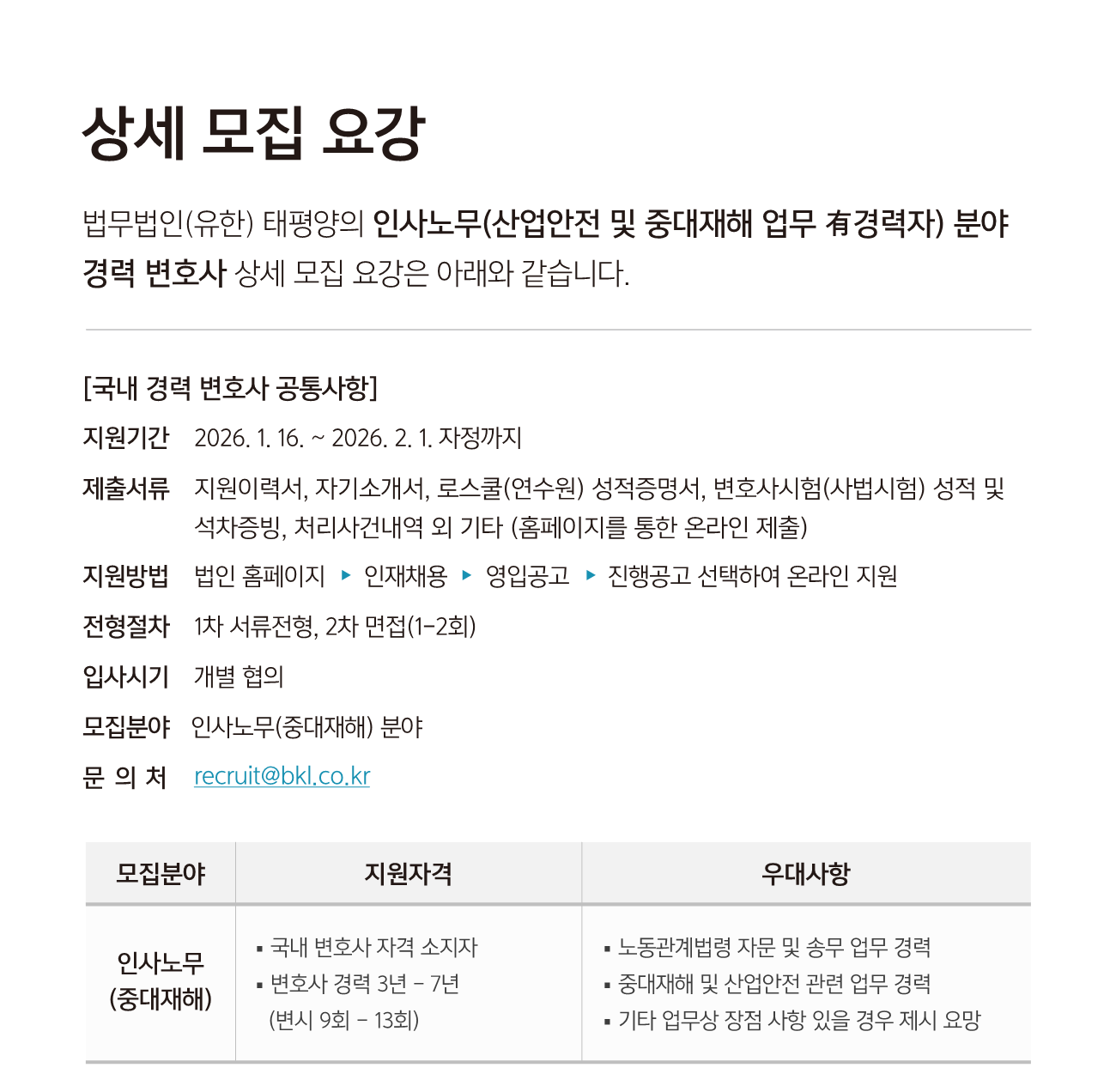 ¸ðÁýºÐ¾ß Áö¿øÀÚ°Ý Àλç³ë¹« (Áß´ëÀçÇØ) ¡á ±¹³» º¯È£»ç ÀÚ°Ý ¼ÒÁöÀÚ ¡á º¯È£»ç °æ·Â 3³â - 7³â (º¯½Ã 9ȸ – 13ȸ) ¿ì´ë»çÇ× ¡á ³ëµ¿°ü°è¹ý·É ÀÚ¹® ¹× ¼Û¹« ¾÷¹« °æ·Â ¡á Áß´ëÀçÇØ ¹× »ê¾÷¾ÈÀü °ü·Ã ¾÷¹« °æ·Â ¡á ±âŸ ¾÷¹«»ó ÀåÁ¡ »çÇ× ÀÖÀ» °æ¿ì Á¦½Ã ¿ä¸Á