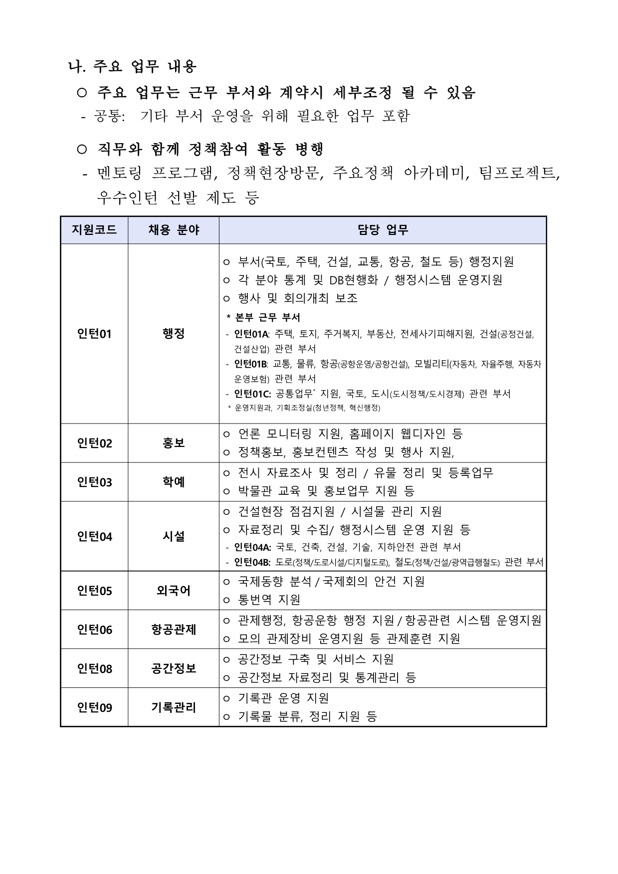 ±¹Åä±³ÅëºÎ °ø°í Á¦2026-0052È£ ±¹Åä±³ÅëºÎ û³âÀÎÅÏ Ã¤¿ë °ø°í ±¹Åä±³ÅëºÎ¿¡¼­ ±Ù¹«ÇÒ Ã»³âÀÎÅÏ Ã¤¿ë°èȹÀ» ´ÙÀ½°ú °°ÀÌ °ø°íÇÕ´Ï´Ù. 2026³â 1¿ù19Àϱ¹Åä±³ÅëºÎÀå°ü1. ¼±¹ß¿¹Á¤Àοø (11°³ ºÐ¾ß, ÃÑ 60¸í) * ´ëµµ½Ã±Ç±¤¿ª±³ÅëÀ§¿øÈ¸, Àü¼¼»ç±âÇÇÇØÁö¿ø´Ü, Áß¾ÓÅäÁö¼ö¿ëÀ§¿øÈ¸ µî Æ÷ÇÔ ¡Ø ÇϳªÀÇ ±Ù¹«¿¹Á¤±â°ü ¹× Áö¿øÄڵ忡¸¸ Áö¿ø °¡´É(´Ù¸¥ ÄÚµå Áߺ¹ Áö¿øºÒ°¡, Áߺ¹Áö¿ø½Ã ºÒÇÕ°Ý Ã³¸®) °¡. ±Ù¹«Á¶°Ç ¡Û (½Å ºÐ) û³âÀÎÅÏ(°ø¹«¿øÀÇ »ç¹«¸¦ º¸Á¶ÇÏ´Â °ø¹«¿øÀÌ ¾Æ´Ñ ±Ù·ÎÀÚ) ¡Û (°è¾à±â°£) ¡®26.3. ~ 8.(¾à 5°³¿ù·Î ¼¼ºÎ»çÇ×Àº Á¶Á¤°¡´É) ¡Û (º¸ ¼ö) ¿ù2,156,880¿ø(±âº»±Þ 2,016,880¿ø, Á¤¾×±Þ½Äºñ 140,000¿ø) * ¹ýÁ¤¼ö´ç ¹ß»ý½Ã º°µµÁö±Þ ¡Û (±Ù¹«½Ã°£) ÁÖ 40½Ã°£(ÁÖ5ÀÏ, ÀϺ° 09:00 ~ 18:00, ÈްԽð£ 12:00~13:00) ¡Û (ÈÄ»ýº¹Áö) °Ç°­º¸Çè, °í¿ëº¸Çè, »êÀ纸Çè, ±¹¹Î¿¬±Ý °¡ÀÔ Áö¿øÄÚµå[±Ù¹«¿¹Á¤±â°ü º°] ä¿ëºÐ¾ß ¼±¹ßÀοø ±Ù¹«Áö ºñ°í º»ºÎ* - ÀÎÅÏ01A ÇàÁ¤A 10 ¼¼Á¾ ¡Ø ÇàÁ¤ A, B, C ¹ÌÁöÁ¤ Á¢¼ö ½Ã Á¢¼öºÒ°¡ - ÀÎÅÏ01B ÇàÁ¤B 12 ¼¼Á¾ - ÀÎÅÏ01C ÇàÁ¤C 7 ¼¼Á¾ - ÀÎÅÏ02 È«º¸ 6 ¼¼Á¾ - ÀÎÅÏ03 Çп¹ 2 ¼¼Á¾(1¸í), ¼­¿ï(1¸í) - ÀÎÅÏ04A ½Ã¼³A 5 ¼¼Á¾ ¡Ø ½Ã¼³ A, B ¹ÌÁöÁ¤ Á¢¼ö ½Ã - ÀÎÅÏ04B ½Ã¼³B 7 ¼¼Á¾ Á¢¼öºÒ°¡ - ÀÎÅÏ05 ¿Ü±¹¾î 1 ¼¼Á¾ - ÀÎÅÏ06 Ç×°ø°üÁ¦ 5 ¼¼Á¾ - ÀÎÅÏ08 °ø°£Á¤º¸ 3 ¼¼Á¾ - ÀÎÅÏ09 ±â·Ï°ü¸® 2 ¼¼Á¾