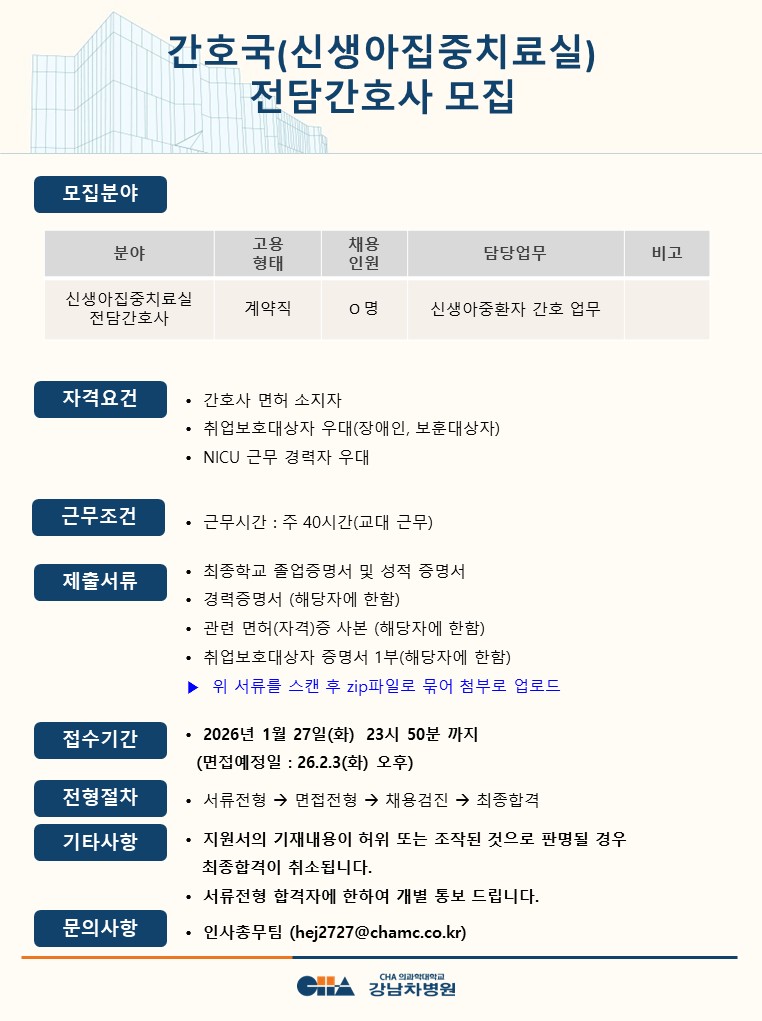 [°³²Â÷º´¿ø] °£È£±¹(½Å»ý¾ÆÁýÁßÄ¡·á½Ç) Àü´ã°£È£»ç ¸ðÁý