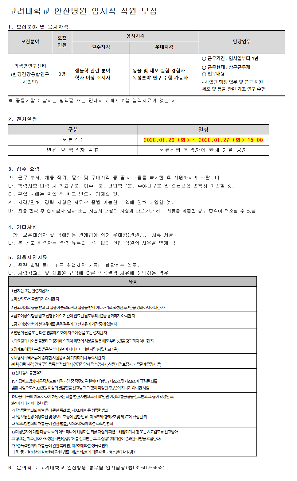 [¾È»êº´¿ø] ÀÇ»ý¸í¿¬±¸¼¾ÅÍ °è¾àÁ÷Á÷¿ø ¸ðÁý(ȯ°æ°Ç°­À¶ÇÕ¿¬±¸»ç¾÷´Ü) °í·Á´ëÇб³ ¾È»êº´¿ø ÀÓ½ÃÁ÷ Á÷¿ø ¸ðÁý 1. ¸ðÁýºÐ¾ß ¹× ÀÀ½ÃÀÚ°Ý ¸ðÁýºÐ¾ß ¸ðÁý Àοø ÀÀ½ÃÀÚ°Ý ´ã´ç¾÷¹« ÇʼöÀÚ°Ý ¿ì´ëÀÚ°Ý ÀÇ»ý¸í¿¬±¸¼¾ÅÍ (ȯ°æ°Ç°­À¶ÇÕ¿¬±¸»ç¾÷´Ü) 0¸í »ý¹°ÇÐ °ü·Ã ºÐ¾ß Çлç ÀÌ»ó ¼ÒÁöÀÚ µ¿¹° ¹× ¼¼Æ÷ ½ÇÇè °æÇèÀÚ µ¶¼ººÐ¾ß ¿¬±¸ ¼öÇà °¡´ÉÀÚ ¡Û ±Ù¹«±â°£ : ÀÔ»çÀϺÎÅÍ 1³â ¡Û ±Ù¹«ÇüÅ : »ó±Ù±Ù¹«Á¦ ¡Û ¾÷¹«³»¿ë - »ç¾÷´Ü ÇàÁ¤ ¾÷¹« ¹× ¿¬±¸ Áö¿ø ¼¼Æ÷ ¹× µ¿¹° °ü·Ã ±âÃÊ ¿¬±¸ ¼öÇà ¡Ø °øÅë»çÇ× : ³²ÀÚ´Â º´¿ªÇÊ ¶Ç´Â ¸éÁ¦ÀÚ / ÇØ¿Ü¿©Çà °á°Ý»çÀ¯°¡ ¾ø´Â ÀÚ 2. ÀüÇüÀÏÁ¤ ±¸ºÐ ÀÏÁ¤ ¼­·ùÁ¢¼ö 2026.01.20.(È­) ~ 2026.01.27.(È­) 15:00 ¸éÁ¢ ¹× ÇÕ°ÝÀÚ ¹ßÇ¥ ¼­·ùÀüÇü ÇÕ°ÝÀÚ¿¡ ÇÑÇØ °³º° °øÁö 3. Á¢¼ö ¿ä·É °¡. ±Ù¹« ºÎ¼­, ä¿ë Á÷À§, Çʼö ¹× ¿ì´ëÀÚ°Ý µî °ø°í ³»¿ëÀ» ¼÷ÁöÇÑ ÈÄ Áö¿øÇϽñ⠹ٶø´Ï´Ù. ³ª. Çз»çÇ× ÀÔ·Â ½Ã Çб³±¸ºÐ, À̼ö±¸ºÐ, ÆíÀÔÇб¸ºÐ, Á־߰£±¸ºÐ ¹× Æò±ÕÆòÁ¡ ¸íÈ®È÷ ±âÀÔÇÒ °Í. ´Ù. ÆíÀÔ ½Ã¿¡´Â ÆíÀÔ Àü Çб³ ¹Ýµå½Ã ±âÀçÇÒ °Í. ¶ó. ÀÚ°Ý/¸éÇã, °æ·Â »çÇ×Àº ¼­·ù·Î Áõºù °¡´ÉÇÑ ³»¿ª¿¡ ÇÑÇØ ±âÀÔÇÒ °Í. ¸¶. ÃÖÁ¾ ÇÕ°Ý ÈÄ ½Åü°Ë»ç °á°ú ¶Ç´Â Áö¿ø¼­ ³»¿ëÀÌ »ç½Ç°ú ´Ù¸£°Å³ª ÇãÀ§ ¼­·ù¸¦ Á¦ÃâÇÑ °æ¿ì ÇÕ°ÝÀÌ Ãë¼ÒµÉ ¼ö ÀÖÀ½ 4. ±âŸ»çÇ× °¡. º¸ÈÆ´ë»óÀÚ ¹× Àå¾ÖÀÎÀº °ü°è¹ý¿¡ ÀǰŠ¿ì´ëÇÔ(°ü·ÃÁõºù ¼­·ù Á¦Ãâ) ³ª. º» °ø°í ÇÕ°ÝÀÚ´Â °æ·Â À¯¹«¿Í °ü°è ¾øÀÌ ½ÅÀÔ Á÷¿øÀÇ Ã³¿ì¸¦ ¹Þ°Ô µÊ. 5. ÀÓ¿ëÁ¦ÇÑ»çÀ¯ °¡. °ü·Ã ¹ý·É µî¿¡ µû¸¥ Ãë¾÷Á¦ÇÑ »çÀ¯¿¡ ÇØ´çÇÏ´Â °æ¿ì. ³ª. »ç¸³Çб³¹ý ¹× ÀÇ·á¿ø ±ÔÁ¤¿¡ µû¸¥ ÀÓ¿ë°á°Ý »çÀ¯¿¡ ÇØ´çÇÏ´Â °æ¿ì. ¸ñ ·Ï 1. ±ÝÄ¡»ê ¶Ç´Â ÇÑÁ¤Ä¡»êÀÚ 2. ÆÄ»êÀڷμ­ º¹±ÇµÇÁö ¾Æ´ÏÇÑ ÀÚ 3. ±Ý°íÀÌ»óÀÇ ÇüÀ» ¹Þ°í ±× ÁýÇàÀÌ Á¾·áµÇ°Å³ª ÁýÇàÀ» ¹ÞÁö ¾Æ´ÏÇϱâ·Î È®Á¤µÈ ÈÄ 5³âÀ» °æ°úÇÏÁö ¾Æ´ÏÇÑ ÀÚ 4. ±Ý°íÀÌ»óÀÇ ÇüÀ» ¹Þ°í ÁýÇàÀ¯¿¹ÀÇ ±â°£ÀÌ ¿Ï·áµÈ ³¯·ÎºÎÅÍ 2³âÀ» °æ°úÇÏÁö ¾Æ´ÏÇÑ ÀÚ 5. ±Ý°íÀÌ»óÀÇ ÇüÀÇ ¼±°íÀ¯¿¹¸¦ ¹ÞÀº °æ¿ì¿¡ ±× ¼±°íÀ¯¿¹ ±â°£ Áß¿¡ ÀÖ´Â ÀÚ 6. ¹ý¿øÀÇ ÆÇ°á ¶Ç´Â ´Ù¸¥ ¹ý·ü¿¡ ÀÇÇÏ¿© ÀÚ°ÝÀÌ »ó½Ç ¶Ç´Â Á¤ÁöµÈ ÀÚ 7. ÀÇ·á¿øÀÇ ³»¿Ü¸¦ ºÒ¹®Çϰí ¡°è¿¡ ÀÇÇÏ¿© ÆÄ¸éÀÇ Ã³ºÐÀ» ¹ÞÀº ¶§·Î ºÎÅÍ 5³âÀ» °æ°úÇÏÁö ¾Æ´ÏÇÑ ÀÚ 8. ¡°è·Î ÇØÀÓóºÐÀ» ¹ÞÀº ³¯ºÎÅÍ 3³âÀÌ Áö³ªÁö ¾Æ´ÏÇÑ »ç¶÷ (»ç¸³Çб³±â°ü) 9. ä¿ë½Ã ±¸ºñ¼­·ù¿¡ Áß´ëÇÑ »ç½ÇÀ» ÇãÀ§ ±âÀçÇϰųª ´©¶ô½ÃŲ ÀÚ (ÇзÂ, °æ·Â, ÀÚ°Ý, ¸éÇã, Áֹεî·Ï, º´ÀûÈ®Àμ­, °Ç°­Áø´Ü¼­, Àû¼º°Ë»ç¼­, ½Å¿ø, ÀçÁ¤º¸Áõ¼­, °¡Á·°ü°èÁõ¸í¼­ µî) 10. ½Åü°Ë»ç ºÒÇÕ°ÝÀÚ 11. »ç¸³Çб³¹ý»ó »ç¹«Á÷¿øÀ¸·Î ÀçÁ÷±â°£ Áß Á÷¹«¿Í °ü·ÃÇÏ¿© ¡¸Çü¹ý¡¹ Á¦355Á¶¹× Á¦356Á¶¿¡ ±ÔÁ¤µÈ Á˸¦ ¹üÇÑ »ç¶÷À¸·Î¼­ 300¸¸¿ø ÀÌ»óÀÇ ¹ú±ÝÇüÀ» ¼±°í¹Þ°í ±× ÇüÀÌ È®Á¤µÈ ÈÄ 2³âÀÌ Áö³ªÁö ¾Æ´ÏÇÑ »ç¶÷ 12 ´ÙÀ½ °¢ ¸ñÀÇ ¾î´À Çϳª¿¡ ÇØ´çÇÏ´Â Á˸¦ ¹üÇÑ »ç¶÷À¸·Î¼­ 100¸¸¿ø ÀÌ»óÀÇ ¹ú±ÝÇüÀ» ¼±°í¹Þ°í ±× ÇüÀÌ È®Á¤µÈ ÈÄ 3³âÀÌ Áö³ªÁö ¾Æ´ÏÇÑ »ç¶÷ °¡. ¡¸¼ºÆø·Â¹üÁËÀÇ Ã³¹ú µî¿¡ °üÇÑ Æ¯·Ê¹ý¡¹ Á¦2Á¶¿¡ µû¸¥ ¼ºÆø·Â¹üÁË ³ª. ¡¸Á¤º¸Åë½Å¸Á ÀÌ¿ëÃËÁø ¹× Á¤º¸º¸È£ µî¿¡ °üÇÑ ¹ý·ü¡¹ Á¦74Á¶Á¦1Ç×Á¦2È£ ¹× Á¦3È£¿¡ ±ÔÁ¤µÈ ÁË ´Ù. ¡¸½ºÅäÅ·¹üÁËÀÇ Ã³¹ú µî¿¡ °üÇÑ ¹ý·ü¡¹ Á¦2Á¶Á¦2È£¿¡ µû¸¥ ½ºÅäÅ·¹üÁË 13. ¹Ì¼º³âÀÚ¿¡ ´ëÇÑ ´ÙÀ½ °¢ ¸ñÀÇ ¾î´À Çϳª¿¡ ÇØ´çÇÏ´Â Á˸¦ ÀúÁú·¯ ÆÄ¸é¤ýÇØÀӵǰųª Çü ¶Ç´Â Ä¡·á°¨È£¸¦ ¼±°í¹Þ¾Æ ±× Çü ¶Ç´Â Ä¡·á°¨È£°¡ È®Á¤µÈ »ç¶÷(ÁýÇàÀ¯¿¹¸¦ ¼±°í¹ÞÀº ÈÄ ±× ÁýÇàÀ¯¿¹±â°£ÀÌ °æ°úÇÑ »ç¶÷À» Æ÷ÇÔÇÑ´Ù) °¡. ¡¸¼ºÆø·Â¹üÁËÀÇ Ã³¹ú µî¿¡ °üÇÑ Æ¯·Ê¹ý¡¹ Á¦2Á¶¿¡ µû¸¥ ¼ºÆø·Â¹üÁË ³ª. ¡¸¾Æµ¿¤ýû¼Ò³âÀÇ ¼ºº¸È£¿¡ °üÇÑ ¹ý·ü¡¹ Á¦2Á¶Á¦2È£¿¡ µû¸¥ ¾Æµ¿¤ýû¼Ò³â´ë»ó ¼º¹üÁË 6. ¹®ÀÇó : °í·Á´ëÇб³ ¾È»êº´¿ø Ãѹ«ÆÀ Àλç´ã´ç(¢Ï***-****-****)
