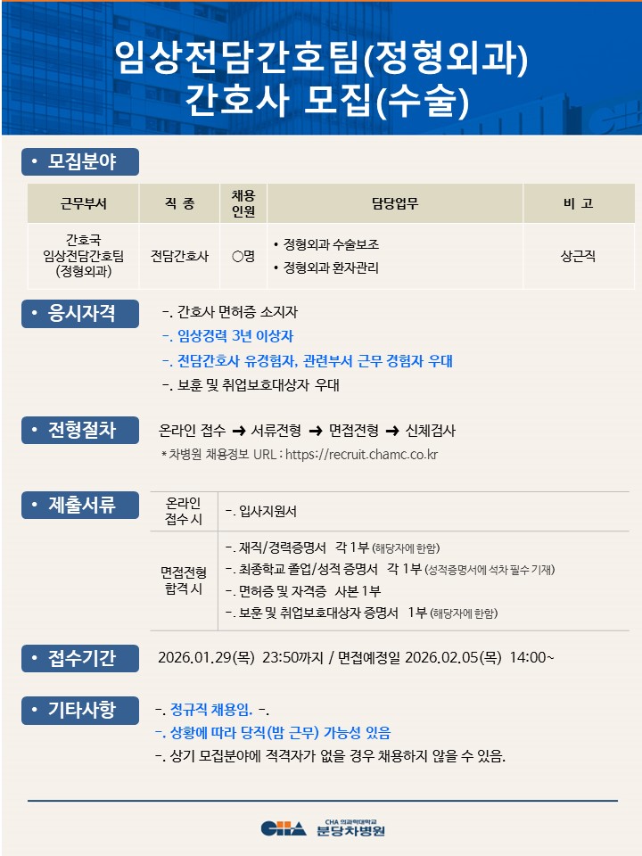 [ºÐ´çÂ÷º´¿ø] ÀÓ»óÀü´ã°£È£ÆÀ(Á¤Çü¿Ü°ú) °£È£»ç ¸ðÁý(¼ö¼ú)
