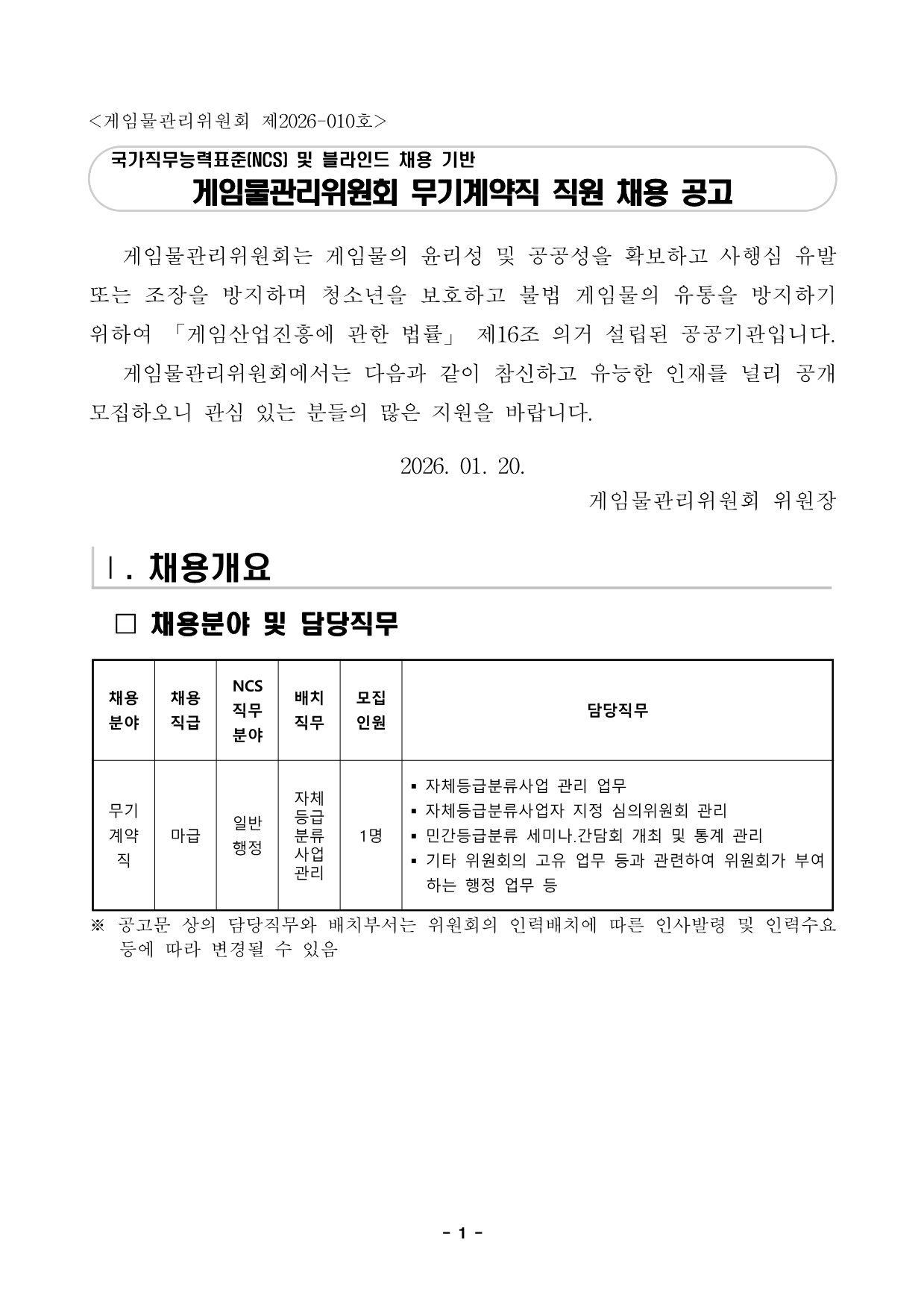 <°ÔÀÓ¹°°ü¸®À§¿øÈ¸ Á¦2026-010È£> ±¹°¡Á÷¹«´É·ÂÇ¥ÁØ(NCS) ¹× ºí¶óÀεå ä¿ë ±â¹Ý °ÔÀÓ¹°°ü¸®À§¿øÈ¸ ¹«±â°è¾àÁ÷ Á÷¿ø ä¿ë °ø°í°ÔÀÓ¹°°ü¸®À§¿øÈ¸´Â °ÔÀÓ¹°ÀÇ À±¸®¼º ¹× °ø°ø¼ºÀ» È®º¸ÇÏ°í »çÇà½ÉÀ¯¹ß¶Ç´Â Á¶ÀåÀ» ¹æÁöÇϸç û¼Ò³âÀ» º¸È£ÇÏ°í ºÒ¹ý °ÔÀÓ¹°ÀÇ À¯ÅëÀ» ¹æÁöÇϱâÀ§ÇÏ¿© ¡¸°ÔÀÓ»ê¾÷ÁøÈï¿¡ °üÇÑ ¹ý·ü¡¹ Á¦16Á¶ Àǰм³¸³µÈ °ø°ø±â°üÀÔ´Ï´Ù. °ÔÀÓ¹°°ü¸®À§¿øÈ¸¿¡¼´Â ´ÙÀ½°ú °°ÀÌ Âü½ÅÇϰí À¯´ÉÇÑ ÀÎÀ縦 ³Î¸®°ø°³¸ðÁýÇÏ¿À´Ï °ü½É ÀÖ´Â ºÐµéÀÇ ¸¹Àº Áö¿øÀ» ¹Ù¶ø´Ï´Ù. 2026. 01. 20. °ÔÀÓ¹°°ü¸®À§¿øÈ¸ À§¿øÀ奰. ä¿ë°³¿ä ¡à ä¿ëºÐ¾ß ¹× ´ã´çÁ÷¹« ¡Ø °ø°í¹® »óÀÇ ´ã´çÁ÷¹«¿Í ¹èÄ¡ºÎ¼´Â À§¿øÈ¸ÀÇ Àη¹èÄ¡¿¡ µû¸¥ Àλç¹ß·É ¹× Àη¼ö¿äµî¿¡ µû¶ó º¯°æµÉ ¼ö ÀÖÀ½ ä¿ë ºÐ¾ß ä¿ë Á÷±Þ NCS Á÷¹« ºÐ¾ß ¹èÄ¡ Á÷¹« ¸ðÁý Àοø ´ã´çÁ÷¹« ¹«±â °è¾à Á÷ ¸¶±Þ ÀÏ¹Ý ÇàÁ¤ ÀÚü µî±Þ ºÐ·ù »ç¾÷ °ü¸® 1¸í ¡× ÀÚüµî±ÞºÐ·ù»ç¾÷ °ü¸® ¾÷¹« ¡× ÀÚüµî±ÞºÐ·ù»ç¾÷ÀÚ ÁöÁ¤ ½ÉÀÇÀ§¿øÈ¸ °ü¸® ¡× ¹Î°£µî±ÞºÐ·ù ¼¼¹Ì³ª․°£´ãȸ °³ÃÖ ¹× Åë°è °ü¸® ¡× ±âŸ À§¿øÈ¸ÀÇ °íÀ¯ ¾÷¹« µî°ú °ü·ÃÇÏ¿© À§¿øÈ¸°¡ ºÎ¿©ÇÏ´Â ÇàÁ¤ ¾÷¹« µî