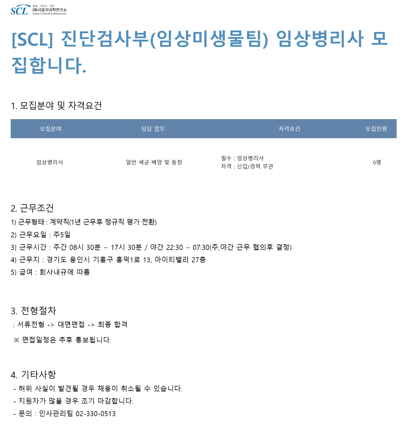 [SCL] Áø´Ü°Ë»çºÎ(ÀÓ»ó¹Ì»ý¹°ÆÀ) ÀÓ»óº´¸®»ç ¸ðÁýÇÕ´Ï´Ù.