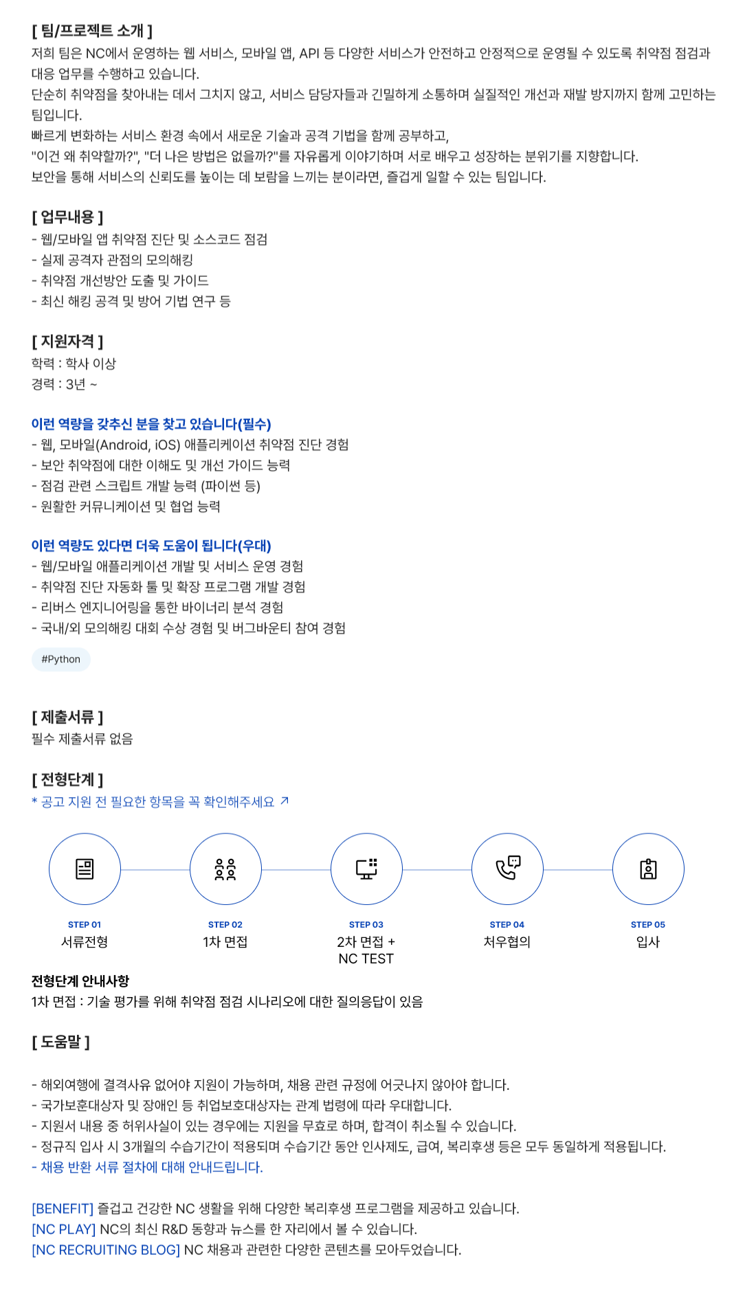 ÀúÈñ ÆÀÀº NC¿¡¼ ¿î¿µÇÏ´Â À¥ ¼ºñ½º, ¸ð¹ÙÀÏ ¾Û, API µî ´Ù¾çÇÑ ¼ºñ½º°¡ ¾ÈÀüÇÏ°í ¾ÈÁ¤ÀûÀ¸·Î ¿î¿µµÉ ¼ö ÀÖµµ·Ï Ãë¾àÁ¡ Á¡°Ë°ú ´ëÀÀ ¾÷¹«¸¦ ¼öÇàÇϰí ÀÖ½À´Ï´Ù.