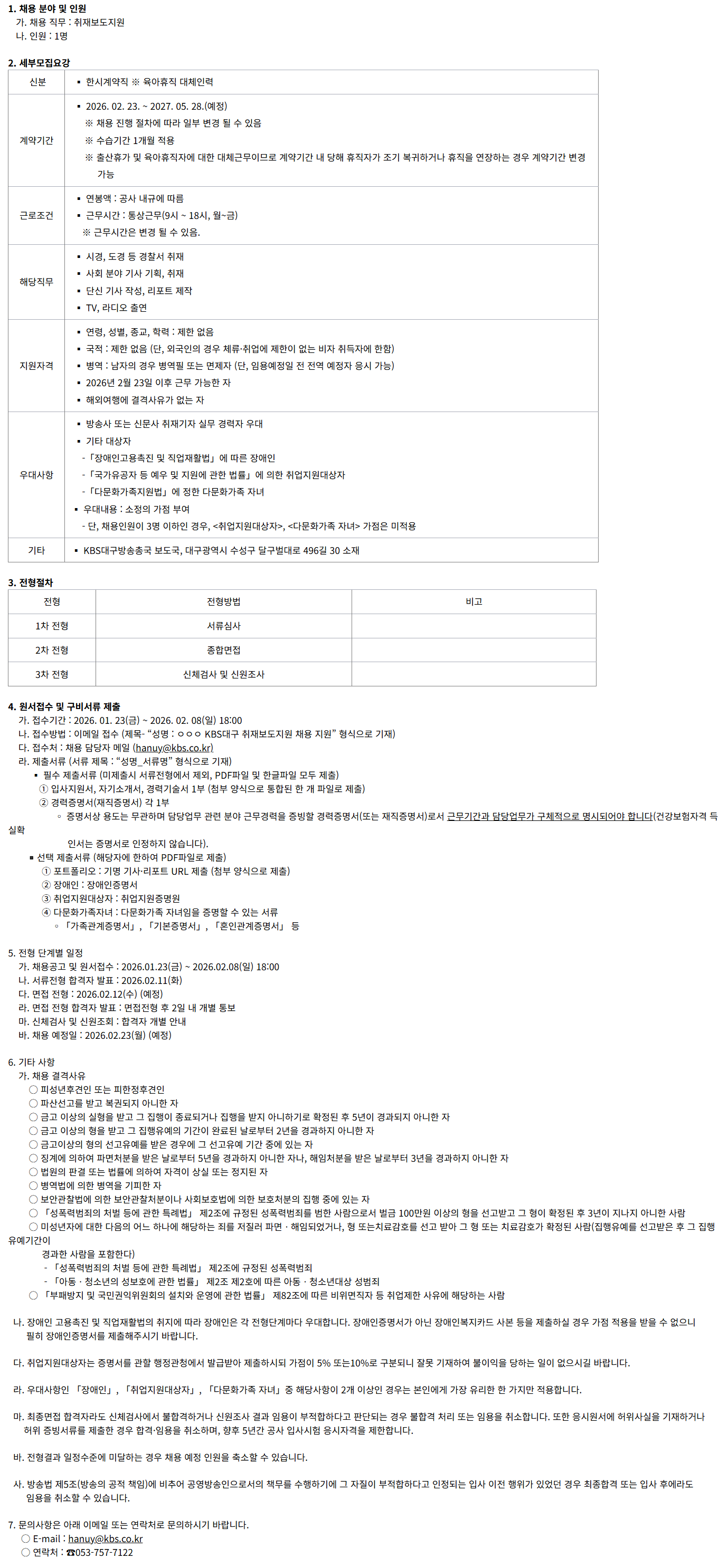 ³ª. Á¢¼ö¹æ¹ý : À̸ÞÀÏ Á¢¼ö (Á¦¸ñ- ¡°¼º¸í : ¤·¤·¤· KBS´ë±¸ ÃëÀ纸µµÁö¿ø ä¿ë Áö¿ø¡± Çü½ÄÀ¸·Î ±âÀç)