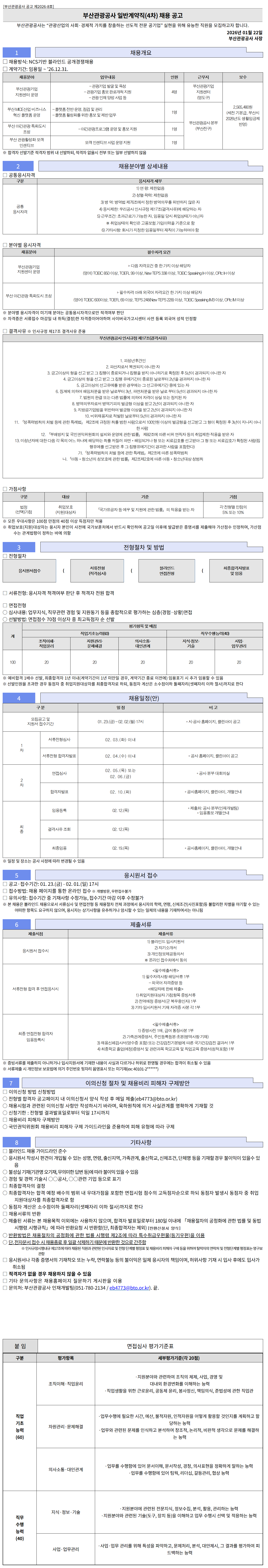 [ºÎ»ê°ü±¤°ø»ç °ø°í Á¦2026-8È£] ºÎ»ê°ü±¤°ø»ç ÀϹݰè¾àÁ÷(4Â÷) ä¿ë °ø°í ºÎ»ê°ü±¤°ø»ç´Â ¡°°ü±¤»ê¾÷ÀÇ »çȸ¡¤°æÁ¦Àû °¡Ä¡¸¦ âÃâÇÏ´Â ¼±µµÀû Àü¹® °ø±â¾÷¡± ½ÇÇöÀ» À§ÇØ À¯´ÉÇÑ Á÷¿øÀ» ¸ðÁýÇϰíÀÚ ÇÕ´Ï´Ù. 2026³â 01¿ù 22ÀÏ ºÎ»ê°ü±¤°ø»ç »çÀå 1 ä¿ë°³¿ä ¡à ä¿ë¹æ½Ä: NCS±â¹Ý ºí¶óÀÎµå °ø°³°æÀïä¿ë ¡à °è¾à±â°£: ÀÓ¿ëÀÏ ~ ¡¯26.12.31. ä¿ëºÐ¾ß ¾÷¹«³»¿ë Àοø ±Ù¹«Áö º¸¼ö ºÎ»ê°ü±¤±â¾÷ Áö¿ø¼¾ÅÍ ¿î¿µ - °ü±¤±â¾÷ ¹ß±¼ ¹× À°¼º - °ü±¤±â¾÷ È«º¸ ÆÇ·Î°³Ã´ Áö¿ø - °ü±¤ ÀÎÀç ¾ç¼º »ç¾÷ µî 4¸í ºÎ»ê°ü±¤±â¾÷ Áö¿ø¼¾ÅÍ (¿µµµ±¸) 2,565,480¿ø (¼¼Àü ±âº»±Þ, ºÎ»ê½Ã 2026³âµµ »ýȰÀÓ±ÝÁ¦ ¹Ý¿µ) ºÎ»ê MICE»ê¾÷ ºñÁî´Ï½º Çõ½Å Ç÷§Æû ¿î¿µ - Ç÷§Æû Àü¹Ý ¿î¿µ, Á¡°Ë ¹× °ü¸® - Ç÷§Æû Ȱ¼ºÈ­¸¦ À§ÇÑ È«º¸ ¹× Á¦¹Ý ¾÷¹« 1¸í ºÎ»ê°ü±¤°ø»ç º»ºÎ (ºÎ»êÁø±¸) ºÎ»ê ¾ß°£°ü±¤ Ưȭµµ½Ã Á¶¼º - ¾ß°£°ü±¤ÇÁ·Î±×·¥ ¿î¿µ ¹× È«º¸ Áö¿ø 1¸í ºÎ»ê °ü±¤È°¼ºÈ­ ¸ð°´ Àμ¾Æ¼ºê ¸ð°´ Àμ¾Æ¼ºê »ç¾÷ ¿î¿µ Áö¿ø 1¸í ¡Ø ÇÕ°ÝÀÚ ¼±¹ß±âÁØ Àû°ÝÀÚ ¹üÀ§ ³» ¼±¹ßÇϵÇ, Àû°ÝÀÚ ¾øÀ»½Ã ÀüºÎ ¶Ç´Â ÀϺΠ¼±¹ßÇÏÁö ¾ÊÀ½ 2 ä¿ëºÐ¾ßº° »ó¼¼³»¿ë ¡à °øÅëÀÀ½ÃÀÚ°Ý ±¸ºÐ ÀÀ½ÃÀÚ°Ý ¼¼ºÎ °øÅë ÀÀ½ÃÀÚ°Ý 1) ¿¬ ·É: Á¦ÇѾøÀ½ 2) ¼ºº°¡¤ÇзÂ: Á¦ÇѾøÀ½ 3) º´ ¿ª: º´¿ª¹ý Á¦76Á¶¿¡¼­ Á¤ÇÑ º´¿ªÀǹ«¸¦ À§¹ÝÇÏÁö ¾ÊÀº ÀÚ 4) ÀÀ½ÃÁ¦ÇÑ: ¿ì¸®°ø»ç Àλç±ÔÁ¤ Á¦17Á¶(°á°Ý»çÀ¯)¿¡ ÇØ´çÇÏ´Â ÀÚ 5) ±Ù¹«Á¶°Ç: Ãʰú±Ù·Î°¡ °¡´ÉÇÑ ÀÚ, ÀÓ¿ëÀÏ ´ç½Ã Ãë¾÷»óŰ¡ ¾Æ´ÑÀÚ ¡Ø Ãë¾÷»óÅÂÀÇ È®ÀÎÀº °í¿ëº¸Çè °¡ÀÔÀÌ·ÂÀ» ±âÁØÀ¸·Î ÇÔ 6) ±âŸ»çÇ×: ȸ»ç°¡ ÁöÁ¤ÇÑ ÀÓ¿ëÀϺÎÅÍ ÀçÁ÷ÀÌ °¡´ÉÇÏ¿©¾ß ÇÔ ¡à ºÐ¾ßº° ÀÀ½ÃÀÚ°Ý Ã¤¿ëºÐ¾ß ÇʼöÀÚ°Ý ¿ä°Ç ºÎ»ê°ü±¤±â¾÷ Áö¿ø¼¾ÅÍ ¿î¿µ ▹´ÙÀ½ ÀÚ°Ý¿ä°Ç Áß ÇÑ °¡Áö ÀÌ»ó ÇØ´çÀÚ (¿µ¾î) TOEIC 850 ÀÌ»ó, TOEFL 99 ÀÌ»ó, New TEPS 338 ÀÌ»ó, TOEIC Speaking IH ÀÌ»ó, OPIc IH ÀÌ»ó ºÎ»ê ¾ß°£°ü±¤ Ưȭµµ½Ã Á¶¼º ▹ÇʼöÀÚ°Ý ¾Æ·¡ ¿Ü±¹¾î ÀÚ°Ý¿ä°Ç ÇÑ °¡Áö ÀÌ»ó ÇØ´çÀÚ (¿µ¾î) TOEIC 600ÀÌ»ó, TOEFL 69 ÀÌ»ó, TEPS 248(New TEPS 228) ÀÌ»ó, TOEIC Speaking IM3 ÀÌ»ó, OPIc IM ÀÌ»ó ¡Ø ºÐ¾ßº° ÀÀ½ÃÀÚ°ÝÀÌ ¹Ì±âÀç ºÐ¾ß´Â °øÅëÀÀ½ÃÀÚ°ÝÀ¸·Î¸¸ Àû°Ý¿©ºÎ ÆÇ´Ü ¡Ø ÀÚ°ÝÁõÀº ¼­·ùÁ¢¼ö ¸¶°¨ÀÏ ³» Ãëµæ(°áÁ¤)ÇÑ ÀÚ°ÝÁõÀ̾î¾ßÇÏ¸ç »çÀ̹ö±¹°¡°í½Ã¼¾ÅÍ »çÀü µî·Ï ¿Ü±¹¾î ¼ºÀû ÀÎÁ¤ÇÔ ¡à °á°Ý»çÀ¯ ¡Ø Àλç±ÔÁ¤ Á¦17Á¶ °á°Ý»çÀ¯ ÁØ¿ë ºÎ»ê°ü±¤°ø»ç Àλç±ÔÁ¤ Á¦17Á¶(°á°Ý»çÀ¯) 1. ÇǼº³âÈİßÀÎ 2. ÆÄ»êÀڷμ­ º¹±ÇµÇÁö ¾Æ´ÏÇÑ ÀÚ 3. ±Ý°íÀÌ»óÀÇ ÇüÀ» ¼±°í ¹Þ°í ±× ÁýÇàÀÌ Á¾·áµÇ°Å³ª ÁýÇàÀ» ¹ÞÁö ¾Æ´ÏÇϱâ·Î È®Á¤µÈ ÈÄ 5³âÀÌ °æ°úµÇÁö ¾Æ´ÏÇÑ ÀÚ 4. ±Ý°íÀÌ»óÀÇ ÇüÀ» ¼±°í ¹Þ°í ±× ÁýÇà À¯¿¹±â°£ÀÌ Á¾·áµÈ ³¯·ÎºÎÅÍ 2³âÀ» °æ°úÇÏÁö ¾Æ´ÏÇÑ ÀÚ 5. ±Ý°íÀÌ»óÀÇ ¼±°íÀ¯¿¹¸¦ ¹ÞÀº °æ¿ì¿¡´Â ±× ¼±°íÀ¯¿¹±â°£ Áß¿¡ ÀÖ´Â ÀÚ 6. ¡°è¿¡ ÀÇÇÏ¿© ÇØÀÓóºÐÀ» ¹ÞÀº ³¯·ÎºÎÅÍ 3³â, ÆÄ¸éóºÐÀ» ¹ÞÀº ³¯·Î ºÎÅÍ 5³âÀÌ °æ°úµÇÁö ¾Æ´ÏÇÑ ÀÚ 7. ¹ý¿øÀÇ ÆÇ°á ¶Ç´Â ´Ù¸¥ ¹ý·ü¿¡ ÀÇÇÏ¿© ÀÚ°ÝÀÌ »ó½Ç ¶Ç´Â Á¤ÁöµÈ ÀÚ 8. º´¿ªÀǹ«Àڷμ­ º´¿ª±âÇÇÀÇ ¹ú±ÝÇü ÀÌ»óÀ» ¹Þ°í 2³âÀÌ °æ°úµÇÁö ¾Æ´ÏÇÑ ÀÚ 9. Áö¹æ°ø±â¾÷¹ýÀ» À§¹ÝÇÏ¿© ¹ú±ÝÇü ÀÌ»óÀ» ¹Þ°í 2³âÀÌ °æ°úµÇÁö ¾Æ´ÏÇÑ ÀÚ 10. ºñÀ§Ã¤¿ëÀÚ·Î Àû¹ßµÈ ³¯·ÎºÎÅÍ 5³âÀÌ °æ°úÇÏÁö ¾Æ´ÏÇÑ ÀÚ 11. ¡¸¼ºÆø·Â¹üÁËÀÇ Ã³¹ú µî¿¡ °üÇÑ Æ¯·Ê¹ý¡¹ Á¦2Á¶¿¡ ±ÔÁ¤µÈ Á˸¦ ¹üÇÑ »ç¶÷À¸·Î¼­ 100¸¸¿ø ÀÌ»óÀÇ ¹ú±ÝÇüÀ» ¼±°í¹Þ°í ±× ÇüÀÌ È®Á¤µÈ ÈÄ 3³âÀÌ Áö³ªÁö ¾Æ´ÏÇÑ »ç¶÷ 12. ¡¸ºÎÆÐ¹æÁö ¹× ±¹¹Î±ÇÀÍÀ§¿øÈ¸ÀÇ ¼³Ä¡¿Í ¿î¿µ¿¡ °üÇÑ ¹ý·ü¡¹ Á¦82Á¶¿¡ µû¸¥ ºñÀ§ ¸éÁ÷ÀÚ µîÀÇ Ãë¾÷Á¦ÇÑ Àû¿ëÀ» ¹ÞÀº ÀÚ 13. ¹Ì¼º³âÀÚ¿¡ ´ëÇÑ ´ÙÀ½ °¢ ¸ñÀÇ ¾î´À Çϳª¿¡ ÇØ´çÇÏ´Â Á˸¦ ÀúÁú·¯ ÆÄ¸é¤ýÇØÀӵǰųª Çü ¶Ç´Â Ä¡·á°¨È£¸¦ ¼±°í¹Þ¾Æ ±× Çü ¶Ç´Â Ä¡·á°¨È£°¡ È®Á¤µÈ »ç¶÷(ÁýÇàÀ¯¿¹¸¦ ¼±°í¹ÞÀº ÈÄ ±× ÁýÇàÀ¯¿¹±â°£ÀÌ °æ°úÇÑ »ç¶÷À» Æ÷ÇÔÇÑ´Ù) °¡.¡¸¼ºÆø·Â¹üÁËÀÇ Ã³¹ú µî¿¡ °üÇÑ Æ¯·Ê¹ý¡¹Á¦2Á¶¿¡ µû¸¥ ¼ºÆø·Â¹üÁË ³ª.¡¸¾Æµ¿¤ýû¼Ò³âÀÇ ¼ºº¸È£¿¡ °üÇÑ ¹ý·ü¡¹Á¦2Á¶Á¦2È£¿¡ µû¸¥ ¾Æµ¿¤ýû¼Ò³â´ë»ó ¼º¹üÁË ¡à °¡Á¡»çÇ× ±¸ºÐ ´ë»ó ±âÁØ °¡Á¡ ¹ýÁ¤ (¼±ÅÃ)°¡Á¡ Ãë¾÷º¸È£ (Áö¿ø)´ë»óÀÚ ¡¸±¹°¡À¯°øÀÚ µî ¿¹¿ì ¹× Áö¿ø¿¡ °üÇÑ ¹ý·ü¡¹ÀÇ Àû¿ëÀ» ¹Þ´Â ÀÚ °¢ ÀüÇüº° ¸¸Á¡ÀÇ 5% ¶Ç´Â 10% ¡Ø ¸ðµç 