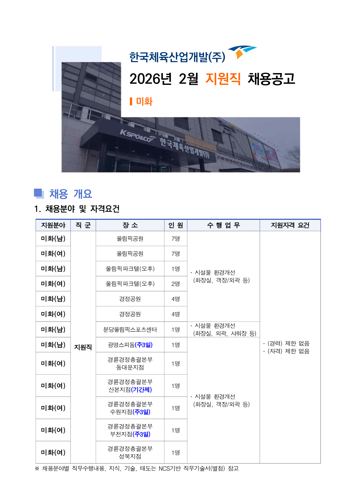 1. ä¿ëºÐ¾ß ¹× ÀÚ°Ý¿ä°Ç ¡Ø ä¿ëºÐ¾ßº° Á÷¹«¼öÇà³»¿ë, Áö½Ä, ±â¼ú, ŵµ´Â NCS±â¹Ý Á÷¹«±â¼ú¼(º°Ã·) Âü°í Áö¿øºÐ¾ß Á÷ ±º Àå ¼Ò ÀÎ ¿ø ¼ö Çà ¾÷ ¹« Áö¿øÀÚ°Ý ¿ä°Ç¹ÌÈ(³²) Áö¿øÁ÷ ¿Ã¸²ÇȰø¿ø 7¸í ž ½Ã¼³¹° ȯ°æ°³¼± (ÈÀå½Ç, °´Àå/¿Ü°û µî) ž (°æ·Â) Á¦ÇÑ ¾øÀ½ ž (ÀÚ°Ý) Á¦ÇÑ ¾øÀ½ ¹ÌÈ(¿©) ¿Ã¸²ÇȰø¿ø 7¸í ¹ÌÈ(³²) ¿Ã¸²ÇÈÆÄÅ©ÅÚ(¿ÀÈÄ) 1¸í ¹ÌÈ(¿©) ¿Ã¸²ÇÈÆÄÅ©ÅÚ(¿ÀÈÄ) 2¸í ¹ÌÈ(³²) °æÁ¤°ø¿ø 4¸í ¹ÌÈ(¿©) °æÁ¤°ø¿ø 4¸í ¹ÌÈ(³²) ºÐ´ç¿Ã¸²ÇȽºÆ÷Ã÷¼¾ÅÍ 1¸í ž ½Ã¼³¹° ȯ°æ°³¼± (ÈÀå½Ç, ¿Ü°û, »þ¿öÀå µî) ¹ÌÈ(³²) ±¤¸í½ºÇǵ¼(ÁÖ3ÀÏ) 1¸í ž ½Ã¼³¹° ȯ°æ°³¼± (ÈÀå½Ç, °´Àå/¿Ü°û µî) ¹ÌÈ(¿©) °æ·û°æÁ¤ÃѰýº»ºÎ µ¿´ë¹®ÁöÁ¡ 1¸í ¹ÌÈ(¿©) °æ·û°æÁ¤ÃѰýº»ºÎ »êº»ÁöÁ¡(±â°£Á¦) 1¸í ¹ÌÈ(¿©) °æ·û°æÁ¤ÃѰýº»ºÎ ¼ö¿øÁöÁ¡(ÁÖ3ÀÏ) 1¸í ¹ÌÈ(¿©) °æ·û°æÁ¤ÃѰýº»ºÎ ºÎõÁöÁ¡(ÁÖ3ÀÏ) 1¸í ¹ÌÈ(¿©) °æ·û°æÁ¤ÃѰýº»ºÎ ¼ººÏÁöÁ¡ 1¸í