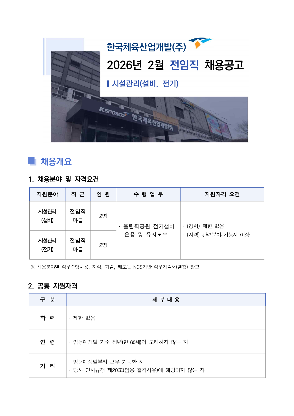 1. ä¿ëºÐ¾ß ¹× ÀÚ°Ý¿ä°Ç Áö¿øºÐ¾ß Á÷ ±º ÀÎ ¿ø ¼ö Çà ¾÷ ¹« Áö¿øÀÚ°Ý ¿ä°Ç ½Ã¼³°ü¸® (¼³ºñ) ÀüÀÓÁ÷ ¸¶±Þ 2¸í ž ¿Ã¸²ÇȰø¿ø Àü±â¼³ºñ ¿î¿ë ¹× À¯Áöº¸¼ö ž (°æ·Â) Á¦ÇÑ ¾øÀ½ ž (ÀÚ°Ý) °ü·ÃºÐ¾ß ±â´É»ç ÀÌ»ó ½Ã¼³°ü¸® (Àü±â) ÀüÀÓÁ÷ ¸¶±Þ 2¸í ¡Ø ä¿ëºÐ¾ßº° Á÷¹«¼öÇà³»¿ë, Áö½Ä, ±â¼ú, ŵµ´Â NCS±â¹Ý Á÷¹«±â¼ú¼(º°Ã·) Âü°í 2. °øÅë Áö¿øÀÚ°Ý ±¸ ºÐ ¼¼ ºÎ ³» ¿ë ÇÐ ·Â ž Á¦ÇÑ ¾øÀ½ ¿¬ ·É ž Àӿ뿹Á¤ÀÏ ±âÁØ Á¤³â(¸¸ 60¼¼)ÀÌ µµ·¡ÇÏÁö ¾Ê´Â ÀÚ ±â Ÿ ž Àӿ뿹Á¤ÀϺÎÅÍ ±Ù¹« °¡´ÉÇÑ ÀÚ ž ´ç»ç Àλç±ÔÁ¤ Á¦20Á¶(ÀÓ¿ë °á°Ý»çÀ¯)¿¡ ÇØ´çÇÏÁö ¾Ê´Â ÀÚ