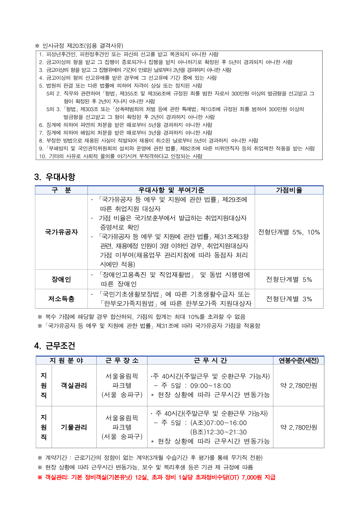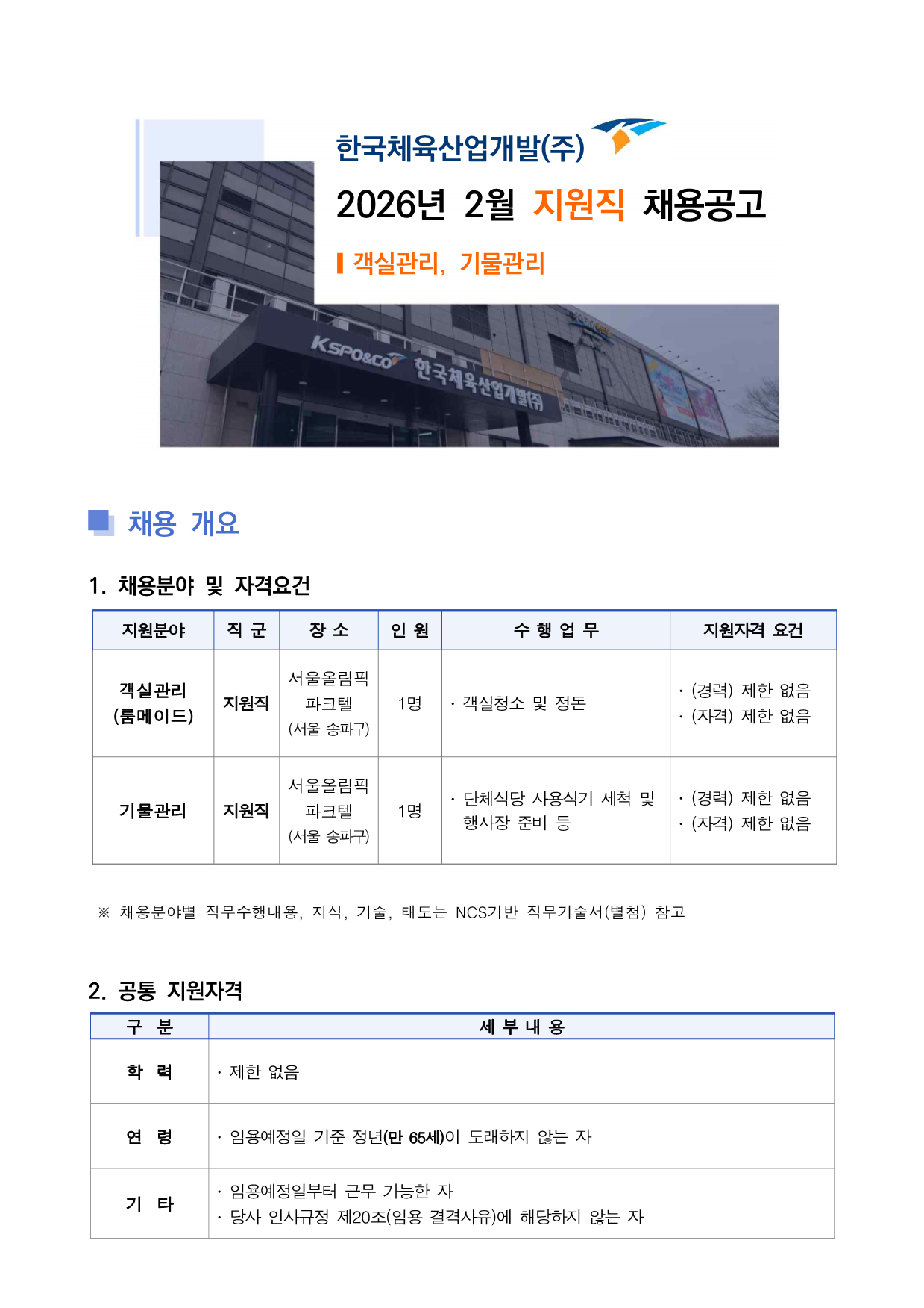 1. ä¿ëºÐ¾ß ¹× ÀÚ°Ý¿ä°Ç Áö¿øºÐ¾ß Á÷ ±º Àå ¼Ò ÀÎ ¿ø ¼ö Çà ¾÷ ¹« Áö¿øÀÚ°Ý ¿ä°Ç°´½Ç°ü¸® (·ë¸ÞÀ̵å) Áö¿øÁ÷ ¼¿ï¿Ã¸²ÇÈ ÆÄÅ©ÅÚ (¼¿ï ¼ÛÆÄ±¸) 1¸í ž °´½Çû¼Ò ¹× Á¤µ· ž (°æ·Â) Á¦ÇÑ ¾øÀ½ž (ÀÚ°Ý) Á¦ÇÑ ¾øÀ½±â¹°°ü¸® Áö¿øÁ÷ ¼¿ï¿Ã¸²ÇÈ ÆÄÅ©ÅÚ (¼¿ï ¼ÛÆÄ±¸) 1¸í ž ´Üü½Ä´ç »ç¿ë½Ä±â ¼¼Ã´ ¹× Çà»çÀå Áغñ µî ž (°æ·Â) Á¦ÇÑ ¾øÀ½ž (ÀÚ°Ý) Á¦ÇÑ ¾øÀ½¡Ø ä¿ëºÐ¾ßº° Á÷¹«¼öÇà³»¿ë, Áö½Ä, ±â¼ú, ŵµ´Â NCS±â¹Ý Á÷¹«±â¼ú¼(º°Ã·) Âü°í 2. °øÅë Áö¿øÀÚ°Ý ±¸ ºÐ ¼¼ ºÎ ³» ¿ë ÇÐ ·Â ž Á¦ÇÑ ¾øÀ½ ¿¬ ·É ž Àӿ뿹Á¤ÀÏ ±âÁØ Á¤³â(¸¸ 65¼¼)ÀÌ µµ·¡ÇÏÁö ¾Ê´Â ÀÚ ±â Ÿ ž Àӿ뿹Á¤ÀϺÎÅÍ ±Ù¹« °¡´ÉÇÑ ÀÚ ž ´ç»ç Àλç±ÔÁ¤ Á¦20Á¶(ÀÓ¿ë °á°Ý»çÀ¯)¿¡ ÇØ´çÇÏÁö ¾Ê´Â ÀÚ