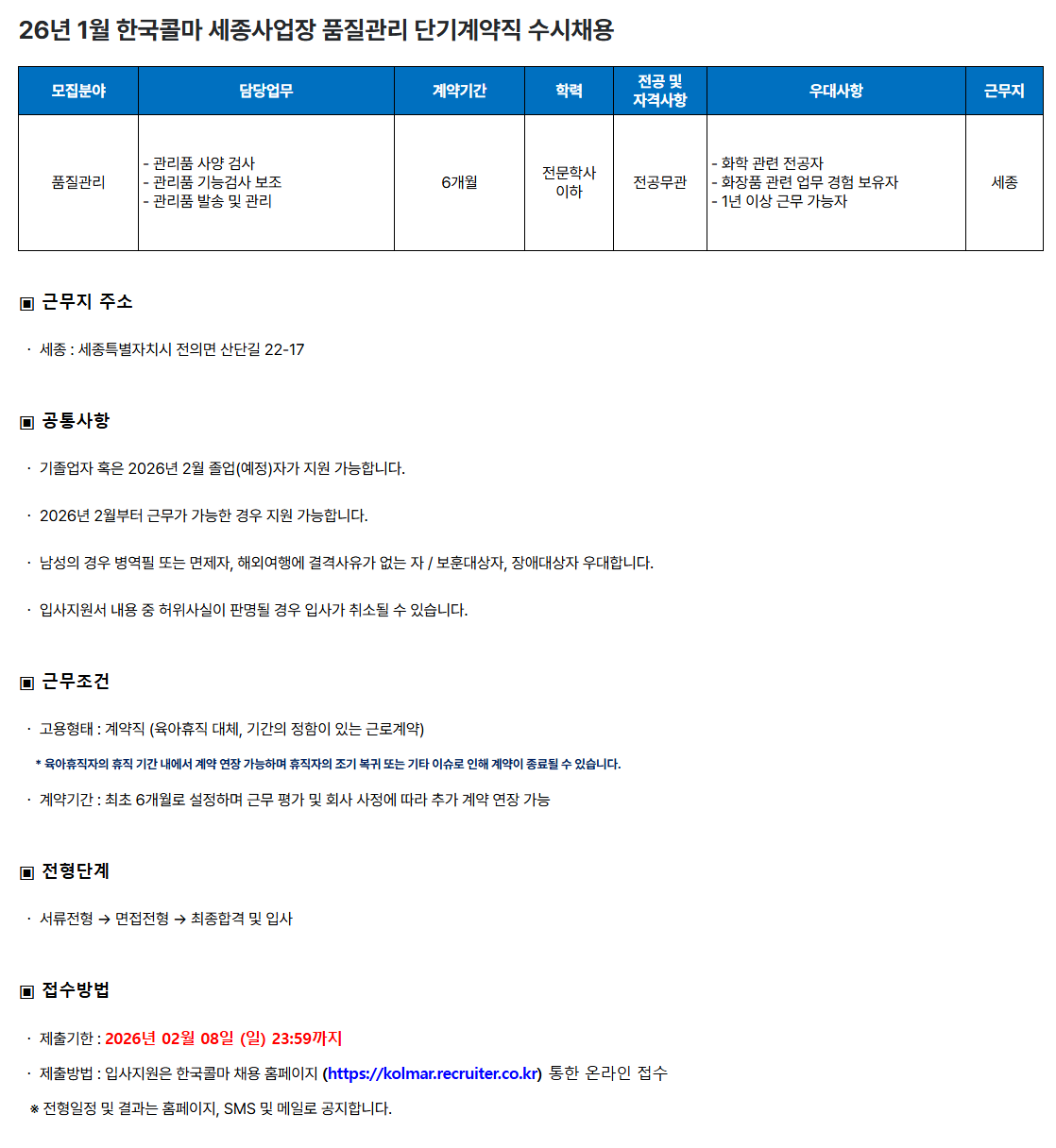 ¤ý Á¦Ãâ¹æ¹ý : ÀÔ»çÁö¿øÀº Çѱ¹Äݸ¶ ä¿ë ȨÆäÀÌÁö (https://kolmar.recruiter.co.kr) ÅëÇÑ ¿Â¶óÀÎ Á¢¼ö