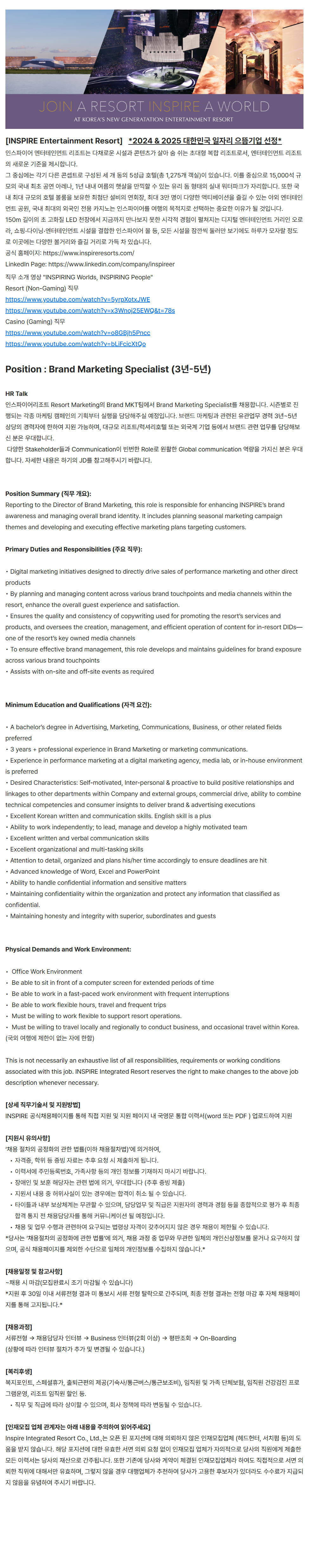 This is not necessarily an exhaustive list of all responsibilities, requirements or working conditions associated with this job. INSPIRE Integrated Resort reserves the right to make changes to the above job description whenever necessary.