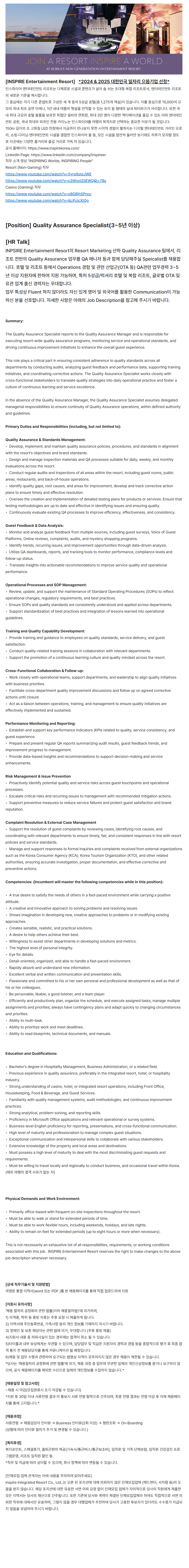 INPSIRE Entertainment ResortÀÇ Resort Marketing »êÇÏ Quality Assurance ÆÀ¿¡¼, ¸®Á¶Æ® Àü¹ÝÀÇ Quality Assurance ¾÷¹«¸¦ QA ¸Å´ÏÀú µî°ú ÇÔ²² ´ã´çÇØÁÖ½Ç Speicalist¸¦ ä¿ëÇÕ´Ï´Ù. È£ÅÚ ¹× ¸®Á¶Æ® µî¿¡¼ Operations °æÇè ¹× °ü·Ã »ê¾÷±º(OTA µî) QA°ü·Ã ¾÷¹«°æ·Â 3~5³â ÀÌ»ó Áö¿øÀÚ¿¡ ÇÑÇÏ¿© Áö¿ø °¡´ÉÇϸç, ƯÈ÷ 5¼º±Þ/·°¼Å¸® È£ÅÚ ¹× º¹ÇÕ ¸®Á¶Æ®, ±Û·Î¹ú OTA ¹× À¯°ü ¾÷°è Ãâ½Å °æ·ÂÀÚ´Â ¿ì´ëÇÕ´Ï´Ù.