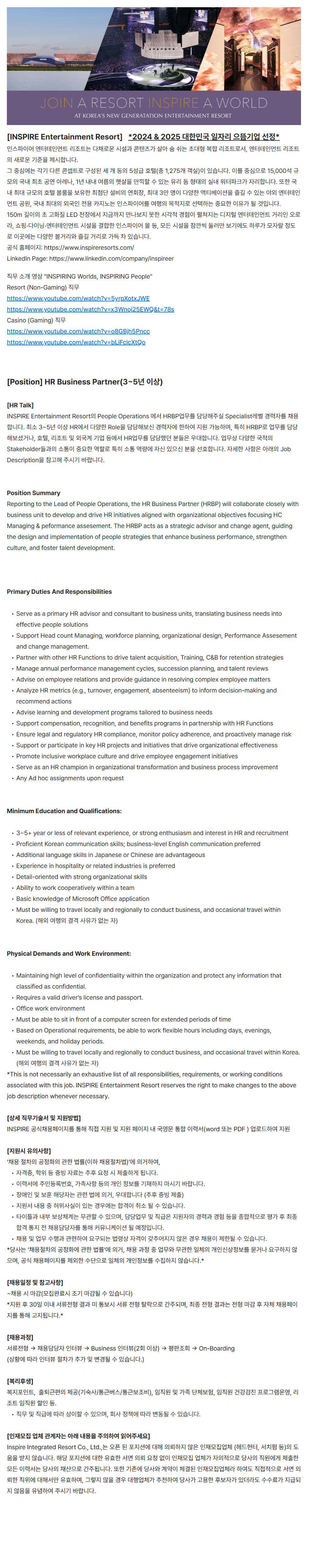 INSPIRE Entertainment ResortÀÇ People Operations ¿¡¼ HRBP¾÷¹«¸¦ ´ã´çÇØÁÖ½Ç Specialist·¹º§ °æ·ÂÀÚ¸¦ ä¿ëÇÕ´Ï´Ù. ÃÖ¼Ò 3~5³â ÀÌ»ó HR¿¡¼ ´Ù¾çÇÑ RoleÀ» ´ã´çÇØº¸½Å °æ·ÂÀÚ¿¡ ÇÑÇÏ¿© Áö¿ø °¡´ÉÇϸç, ƯÈ÷ HRBP·Î ¾÷¹«¸¦ ´ã´çÇØº¸¼Ì°Å³ª, È£ÅÚ, ¸®Á¶Æ® ¹× ¿Ü±¹°è ±â¾÷ µî¿¡¼ HR¾÷¹«¸¦ ´ã´çÇß´ø ºÐµéÀº ¿ì´ëÇÕ´Ï´Ù. ¾÷¹«»ó ´Ù¾çÇÑ ±¹ÀûÀÇ Stakeholderµé°úÀÇ ¼ÒÅëÀÌ Áß¿äÇÑ ¿ªÇҷΠƯÈ÷ ¼ÒÅë ¿ª·®¿¡ ÀڽŠÀÖÀ¸½Å ºÐÀ» ¼±È£ÇÕ´Ï´Ù. ÀÚ¼¼ÇÑ »çÇ×Àº ¾Æ·¡ÀÇ Job DescriptionÀ» Âü°íÇØ Áֽñ⠹ٶø´Ï´Ù.