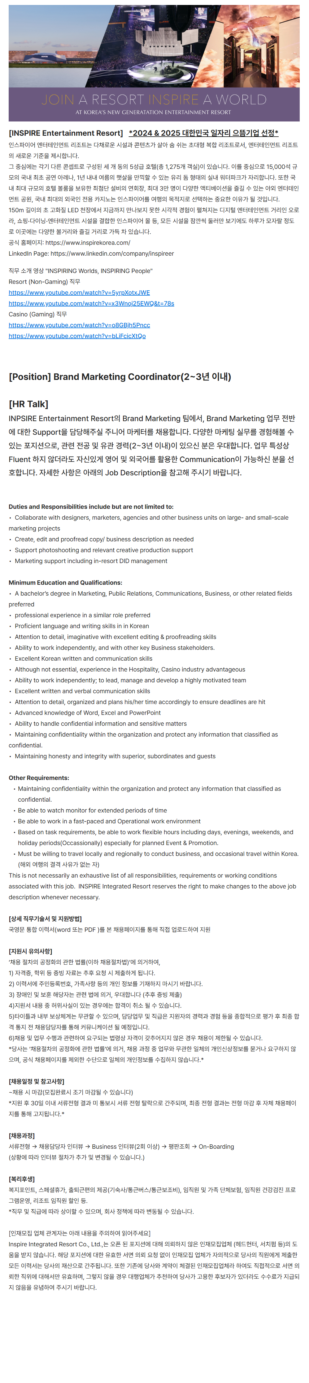 INPSIRE Entertainment ResortÀÇ Brand Marketing ÆÀ¿¡¼, Brand Marketing ¾÷¹« Àü¹Ý¿¡ ´ëÇÑ SupportÀ» ´ã´çÇØÁÖ½Ç ÁÖ´Ï¾î ¸¶ÄÉÅ͸¦ ä¿ëÇÕ´Ï´Ù. ´Ù¾çÇÑ ¸¶ÄÉÆÃ ½Ç¹«¸¦ °æÇèÇØº¼ ¼ö ÀÖ´Â Æ÷Áö¼ÇÀ¸·Î, °ü·Ã Àü°ø ¹× À¯°ü °æ·Â(2~3³â À̳»)ÀÌ ÀÖÀ¸½Å ºÐÀº ¿ì´ëÇÕ´Ï´Ù. ¾÷¹« Ư¼º»ó Fluent ÇÏÁö ¾Ê´õ¶óµµ ÀÚ½ÅÀÖ°Ô ¿µ¾î ¹× ¿Ü±¹¾î¸¦ Ȱ¿ëÇÑ CommunicationÀÌ °¡´ÉÇϽŠºÐÀ» ¼±È£ÇÕ´Ï´Ù. ÀÚ¼¼ÇÑ »çÇ×Àº ¾Æ·¡ÀÇ Job DescriptionÀ» Âü°íÇØ Áֽñ⠹ٶø´Ï´Ù.
