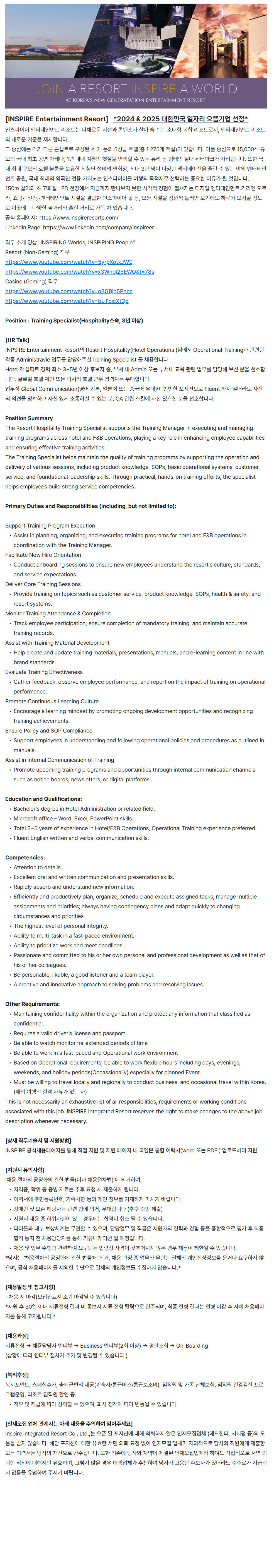 Á÷¹« ¼Ò°³ ¿µ»ó "INSPIRING Worlds, INSPIRING People" Resort (Non-Gaming) Á÷¹« https://www.youtube.com/watch?v=5yrpXotxJWE https://www.youtube.com/watch?v=x3Wnoj25EWQ&t=78s Casino (Gaming) Á÷¹« https://www.youtube.com/watch?v=o8GBjh5Pncc https://www.youtube.com/watch?v=bLiFcicXtQo Position : Training Specialist(Hospitality¼Ò¼Ó, 3³â ÀÌ»ó) [HR Talk]  INPSIRE Entertainment ResortÀÇ Resort Hospitality(Hotel Operations )ÆÀ¿¡¼­ Operational Training°ú °ü·ÃµÈ °¢Á¾ Administravie ¾÷¹«¸¦ ´ã´çÇØÁÖ½ÇTraining Specialist ¸¦ ä¿ëÇÕ´Ï´Ù. Hotel °´½ÇÆÄÆ® °æ·Â ÃÖ¼Ò 3~5³â ÀÌ»ó Èĺ¸ÀÚ Áß, ºÎ¼­ ³» Admin ¶Ç´Â ºÎ¼­³» ±³À° °ü·Ã ¾÷¹«¸¦ ´ã´çÇØ º¸½Å ºÐÀ» ¼±È£ÇÕ´Ï´Ù. ±Û·Î¹ú È£ÅÚ Ã¼ÀÎ ¶Ç´Â ·°¼Å¸® È£ÅÚ ±Ù¹« °æ·ÂÀÚ´Â ¿ì´ëÇÕ´Ï´Ù. ¾÷¹«»ó Global Communication(¿µ¾î ±âº», ÀϺ»¾î ¶Ç´Â Áß±¹¾î ¿ì´ë)ÀÌ ºó¹øÇÑ Æ÷Áö¼ÇÀ¸·Î Fluent ÇÏÁö ¾Ê´õ¶óµµ ÀÚ½ÅÀÇ ÀǰßÀ» ¸íÈ®Çϰí ÀڽŠÀÖ°Ô ¼ÒÅëÇÏ½Ç ¼ö ÀÖ´Â ºÐ, OA °ü·Ã ½ºÅ³¿¡ ÀڽŠÀÖÀ¸½Å ºÐÀ» ¼±È£ÇÕ´Ï´Ù. Position Summary The Resort Hospitality Training Specialist supports the Training Manager in executing and managing training programs across hotel and F&B operations, playing a key role in enhancing employee capabilities and ensuring effective training activities. The Training Specialist helps maintain the quality of training programs by supporting the operation and delivery of various sessions, including product knowledge, SOPs, basic operational systems, customer service, and foundational leadership skills. Through practical, hands-on training efforts, the specialist helps employees build strong service competencies. Primary Duties and Responsibilities (including, but not limited to): Support Training Program Execution Assist in planning, organizing, and executing training programs for hotel and F&B operations in coordination with the Training Manager. Facilitate New Hire Orientation Conduct onboarding sessions to ensure new employees understand the resort's culture, standards, and service expectations. Deliver Core Training Sessions Provide training on topics such as customer service, product knowledge, SOPs, health & safety, and resort systems. Monitor Training Attendance & Completion Track employee participation, ensure completion of mandatory training, and maintain accurate training records. Assist with Training Material Development Help create and update training materials, presentations, manuals, and e-learning content in line with brand standards. Evaluate Training Effectiveness Gather feedback, observe employee performance, and report on the impact of training on operational performance. Promote Continuous Learning Culture Encourage a learning mindset by promoting ongoing development opportunities and recognizing training achievements. Ensure Policy and SOP Compliance Support employees in understanding and following operational policies and procedures as outlined in manuals. Assist in Internal Communication of Training Promote upcoming training programs and opportunities through internal communication channels such as notice boards, newsletters, or digital platforms. Education and Qualifications: Bachelor's degree in Hotel Administration or related field. Microsoft office – Word, Excel, PowerPoint skills. Total 3~5 years of experience in Hotel/F&B Operations, Operational Training experience preferred. Fluent English written and verbal communication skills. Competencies: Attention to details. Excellent oral and written communication and presentation skills. Rapidly absorb and understand new information. Efficiently and productively plan, organize, schedule and execute assigned tasks; manage multiple assignments and priorities; always having contingency plans and adapt quickly to changing circumstances and priorities The highest level of personal integrity. Ability to multi-task in a fast-paced environment. Ability to prioritize work and meet deadlines. Passionate and committed to his or her own personal and professional development as well as that of his or her colleagues. Be personable, likable, a good listener and a team player. A creative and innovative approach to solving problems and resolving issues. Other Requirements: Maintaining confidentiality within the organization and protect any information that classified as confidential. Requires a valid driver¡¯s license and passport. Be able to watch monitor for extended periods of time Be able to work in a fast-paced and Operational work environment Based on Operational requirements, be able to work flexible hours including days, evenings, weekends, and holiday periods(Occassionally) especially for planned Event. Must be willing to travel locally and regionally to conduct business, and occasional travel within Korea. (ÇØ¿Ü ¿©ÇàÀÇ °á°Ý »çÀ¯°¡ ¾ø´Â ÀÚ) This is not necessarily an exhaustive list of all responsibilities, requirements or working conditions associated with this job. INSPIRE Integrated Resort reserves the right to make changes to the above job description whenever necessary. [»ó¼¼ Á÷¹«±â¼ú¼­ ¹× Áö¿ø¹æ¹ý] INSPIRE °ø½Ää¿ëÆäÀÌÁö¸¦ ÅëÇØ Á÷Á¢ Áö¿ø ¹× Áö¿ø ÆäÀÌÁö ³» ±¹¿µ¹® ÅëÇÕ À̷¼­(word ¶Ç´Â PDF ) ¾÷·ÎµåÇÏ¿© Áö¿ø [Áö¿ø½Ã À¯ÀÇ»çÇ×] ¡®Ã¤¿ë ÀýÂ÷ÀÇ °øÁ¤È­ÀÇ °üÇÑ ¹ý·ü(ÀÌÇÏ Ã¤¿ëÀýÂ÷¹ý)¡¯¿¡ ÀǰÅÇÏ¿©, ÀÚ°ÝÁõ, ÇÐÀ§ µî Áõºù ÀÚ·á´Â ÃßÈÄ ¿äû ½Ã Á¦ÃâÇÏ°Ô µË´Ï´Ù. À̷¼­¿¡ Áֹεî·Ï¹øÈ£, °¡Á·»çÇ× µîÀÇ °³ÀÎ Á¤º¸¸¦ ±âÀçÇÏÁö ¸¶½Ã±â ¹Ù¶ø´Ï´Ù. Àå¾ÖÀÎ ¹× º¸ÈÆ ÇØ´çÀÚ´Â °ü·Ã ¹ý¿¡ ÀǰÅ, ¿ì´ëÇÕ´Ï´