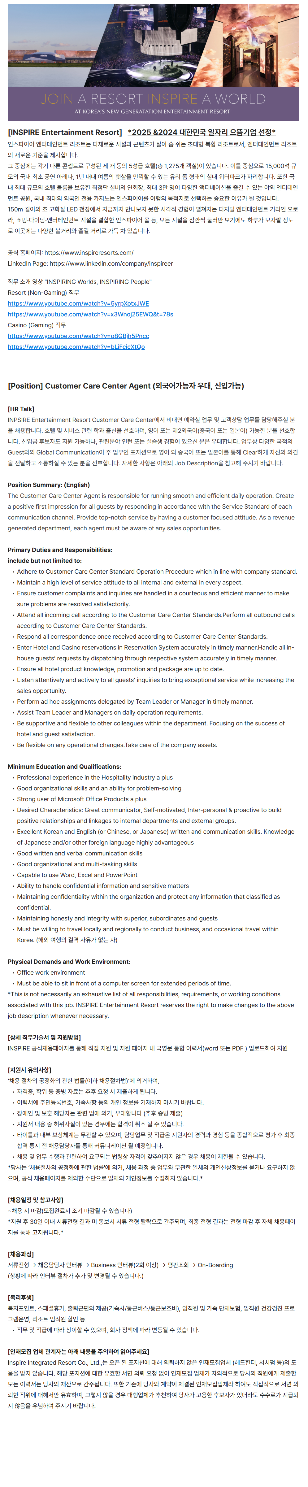 Á÷¹« ¼Ò°³ ¿µ»ó "INSPIRING Worlds, INSPIRING People" Resort (Non-Gaming) Á÷¹« https://www.youtube.com/watch?v=5yrpXotxJWE https://www.youtube.com/watch?v=x3Wnoj25EWQ&t=78s Casino (Gaming) Á÷¹« https://www.youtube.com/watch?v=o8GBjh5Pncc https://www.youtube.com/watch?v=bLiFcicXtQo [Position] Customer Care Center Agent (¿Ü±¹¾î°¡´ÉÀÚ ¿ì´ë, ½ÅÀÔ°¡´É) [HR Talk]  INPSIRE Entertainment Resort Customer Care Center¿¡¼­ ºñ´ë¸é ¿¹¾à½Ç ¾÷¹« ¹× °í°´»ó´ã ¾÷¹«¸¦ ´ã´çÇØÁÖ½Ç ºÐÀ» ä¿ëÇÕ´Ï´Ù. È£ÅÚ ¹× ¼­ºñ½º °ü·Ã Çаú Ãâ½ÅÀ» ¼±È£Çϸç, ¿µ¾î ¶Ç´Â Á¦2¿Ü±¹¾î(Áß±¹¾î ¶Ç´Â ÀϺ»¾î) °¡´ÉÇÑ ºÐÀ» ¼±È£ÇÕ´Ï´Ù. ½ÅÀÔ±Þ Èĺ¸ÀÚµµ Áö¿ø °¡´ÉÇϳª, °ü·ÃºÐ¾ß ÀÎÅÏ ¶Ç´Â ½Ç½À»ý °æÇèÀÌ ÀÖÀ¸½Å ºÐÀº ¿ì´ëÇÕ´Ï´Ù. ¾÷¹«»ó ´Ù¾çÇÑ ±¹ÀûÀÇ Guest¿ÍÀÇ Global CommunicationÀÌ ÁÖ ¾÷¹«ÀÎ Æ÷Áö¼ÇÀ¸·Î ¿µ¾î ¿Ü Áß±¹¾î ¶Ç´Â ÀϺ»¾î¸¦ ÅëÇØ ClearÇÏ°Ô ÀÚ½ÅÀÇ ÀǰßÀ» Àü´ÞÇÏ°í ¼ÒÅëÇÏ½Ç ¼ö ÀÖ´Â ºÐÀ» ¼±È£ÇÕ´Ï´Ù. ÀÚ¼¼ÇÑ »çÇ×Àº ¾Æ·¡ÀÇ Job DescriptionÀ» Âü°íÇØ Áֽñ⠹ٶø´Ï´Ù. Position Summary: (English) The Customer Care Center Agent is responsible for running smooth and efficient daily operation. Create a positive first impression for all guests by responding in accordance with the Service Standard of each communication channel. Provide top-notch service by having a customer focused attitude. As a revenue generated department, each agent must be aware of any sales opportunities. Primary Duties and Responsibilities: include but not limited to: Adhere to Customer Care Center Standard Operation Procedure which in line with company standard. Maintain a high level of service attitude to all internal and external in every aspect. Ensure customer complaints and inquiries are handled in a courteous and efficient manner to make sure problems are resolved satisfactorily. Attend all incoming call according to the Customer Care Center Standards.Perform all outbound calls according to Customer Care Center Standards. Respond all correspondence once received according to Customer Care Center Standards. Enter Hotel and Casino reservations in Reservation System accurately in timely manner.Handle all in-house guests¡¯ requests by dispatching through respective system accurately in timely manner. Ensure all hotel product knowledge, promotion and package are up to date. Listen attentively and actively to all guests¡¯ inquiries to bring exceptional service while increasing the sales opportunity. Perform ad hoc assignments delegated by Team Leader or Manager in timely manner. Assist Team Leader and Managers on daily operation requirements. Be supportive and flexible to other colleagues within the department. Focusing on the success of hotel and guest satisfaction. Be flexible on any operational changes.Take care of the company assets. Minimum Education and Qualifications: Professional experience in the Hospitality industry a plus Good organizational skills and an ability for problem-solving Strong user of Microsoft Office Products a plus Desired Characteristics: Great communicator, Self-motivated, Inter-personal & proactive to build positive relationships and linkages to internal departments and external groups. Excellent Korean and English (or Chinese, or Japanese) written and communication skills. Knowledge of Japanese and/or other foreign language highly advantageous Good written and verbal communication skills Good organizational and multi-tasking skills Capable to use Word, Excel and PowerPoint Ability to handle confidential information and sensitive matters Maintaining confidentiality within the organization and protect any information that classified as confidential. Maintaining honesty and integrity with superior, subordinates and guests Must be willing to travel locally and regionally to conduct business, and occasional travel within Korea. (ÇØ¿Ü ¿©ÇàÀÇ °á°Ý »çÀ¯°¡ ¾ø´Â ÀÚ) Physical Demands and Work Environment: Office work environment Must be able to sit in front of a computer screen for extended periods of time. *This is not necessarily an exhaustive list of all responsibilities, requirements, or working conditions associated with this job. INSPIRE Entertainment Resort reserves the right to make changes to the above job description whenever necessary. [»ó¼¼ Á÷¹«±â¼ú¼­ ¹× Áö¿ø¹æ¹ý] INSPIRE °ø½Ää¿ëÆäÀÌÁö¸¦ ÅëÇØ Á÷Á¢ Áö¿ø ¹× Áö¿ø ÆäÀÌÁö ³» ±¹¿µ¹® ÅëÇÕ À̷¼­(word ¶Ç´Â PDF ) ¾÷·ÎµåÇÏ¿© Áö¿ø [Áö¿ø½Ã À¯ÀÇ»çÇ×] ¡®Ã¤¿ë ÀýÂ÷ÀÇ °øÁ¤È­ÀÇ °üÇÑ ¹ý·ü(ÀÌÇÏ Ã¤¿ëÀýÂ÷¹ý)¡¯¿¡ ÀǰÅÇÏ¿©, ÀÚ°ÝÁõ, ÇÐÀ§ µî Áõºù ÀÚ·á´Â ÃßÈÄ ¿äû ½Ã Á¦ÃâÇÏ°Ô µË´Ï´Ù. À̷¼­¿¡ Áֹεî·Ï¹øÈ£, °¡Á·»çÇ× µîÀÇ °³ÀÎ Á¤º¸¸¦ ±âÀçÇÏÁö ¸¶½Ã±â ¹Ù¶ø´Ï´Ù. Àå¾ÖÀÎ ¹× º¸ÈÆ ÇØ´çÀÚ´Â °ü·Ã ¹ý¿¡ ÀǰÅ, ¿ì´ëÇÕ´Ï´Ù (ÃßÈÄ Áõºù Á¦Ãâ) Áö¿ø¼­ ³»¿ë Áß ÇãÀ§»ç½ÇÀÌ ÀÖ´Â °æ¿ì¿¡´Â ÇÕ°ÝÀÌ Ãë¼Ò µÉ ¼ö ÀÖ½À´Ï´Ù. ŸÀÌÆ²°ú ³»ºÎ º¸»óü°è´Â ¹«°üÇÒ ¼ö ÀÖÀ¸¸ç, ´ã´ç¾÷¹« ¹× Á÷±ÞÀº Áö¿øÀÚÀÇ °æ·Â°ú °æÇè µîÀ» Á¾ÇÕÀûÀ¸·Î Æò°¡ ÈÄ ÃÖÁ¾ ÇÕ°Ý ÅëÁö Àü ä¿ë´ã´çÀÚ¸¦ ÅëÇØ Ä¿¹Â´ÏÄÉÀÌ¼Ç µÉ ¿¹Á¤ÀÔ´Ï´Ù. ä¿ë ¹× ¾÷¹« ¼öÇà°ú °ü·ÃÇÏ¿© ¿ä±¸µÇ´Â ¹ý·É»ó ÀÚ°ÝÀÌ °®Ãß¾îÁöÁö ¾ÊÀº °æ¿ì ä¿ëÀÌ Á¦ÇÑµÉ ¼ö ÀÖ½À´Ï´Ù. *´ç»ç´Â ¡®Ã¤¿ëÀýÂ÷ÀÇ °øÁ¤È­¿¡ °üÇÑ ¹ý·ü'¿¡